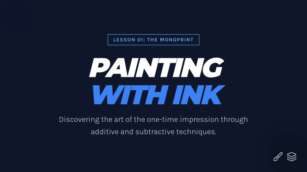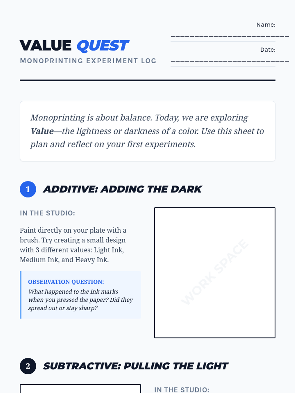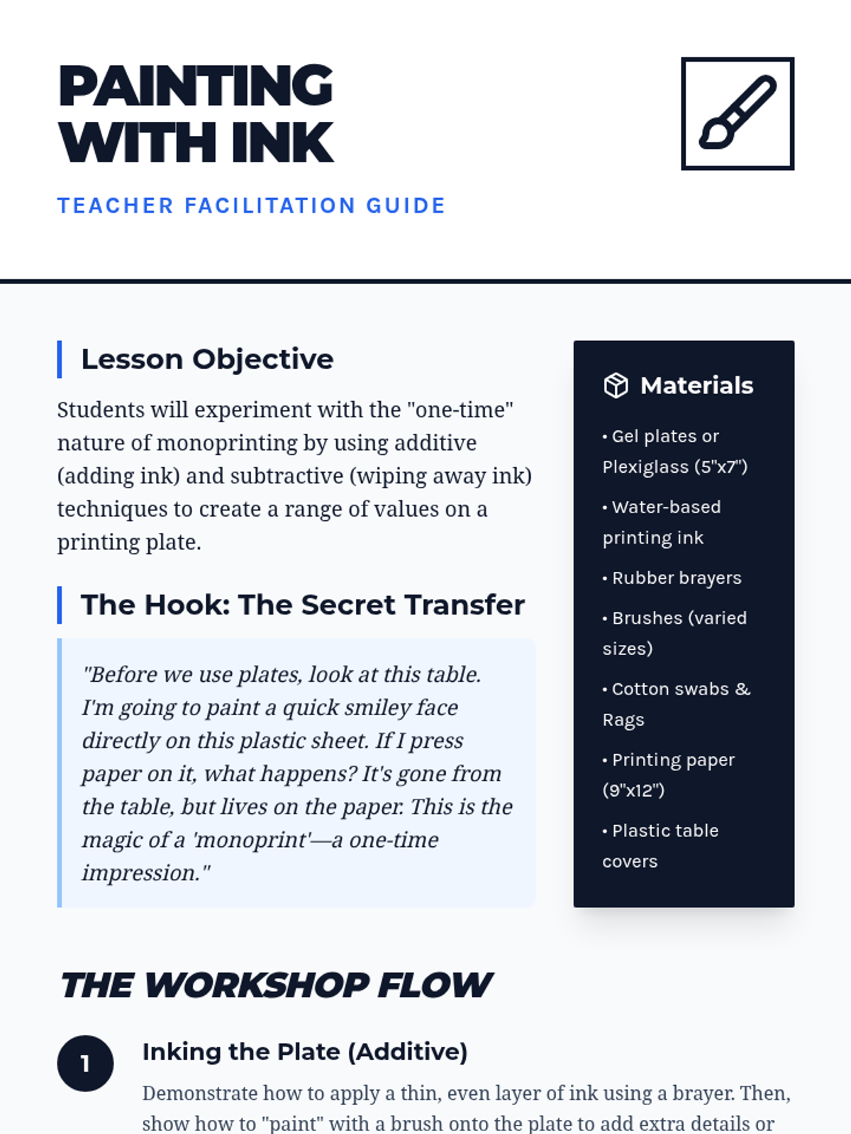 A 5-lesson sequence exploring the experimental nature of monoprinting. Students investigate ink properties, transparency, and layering through additive/subtractive methods, found object textures, masking, and ghost printing, culminating in a curated portfolio.