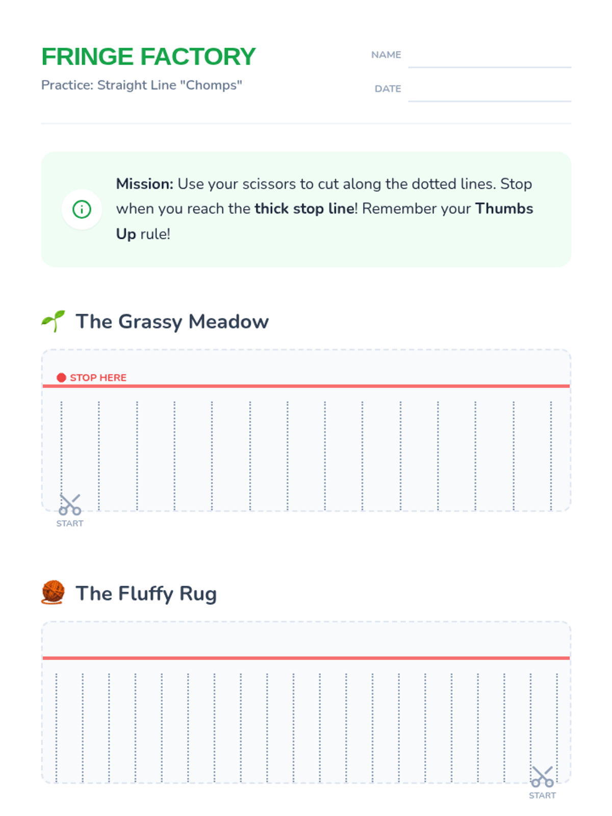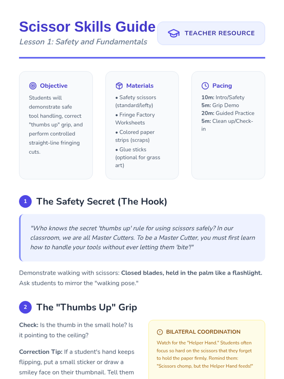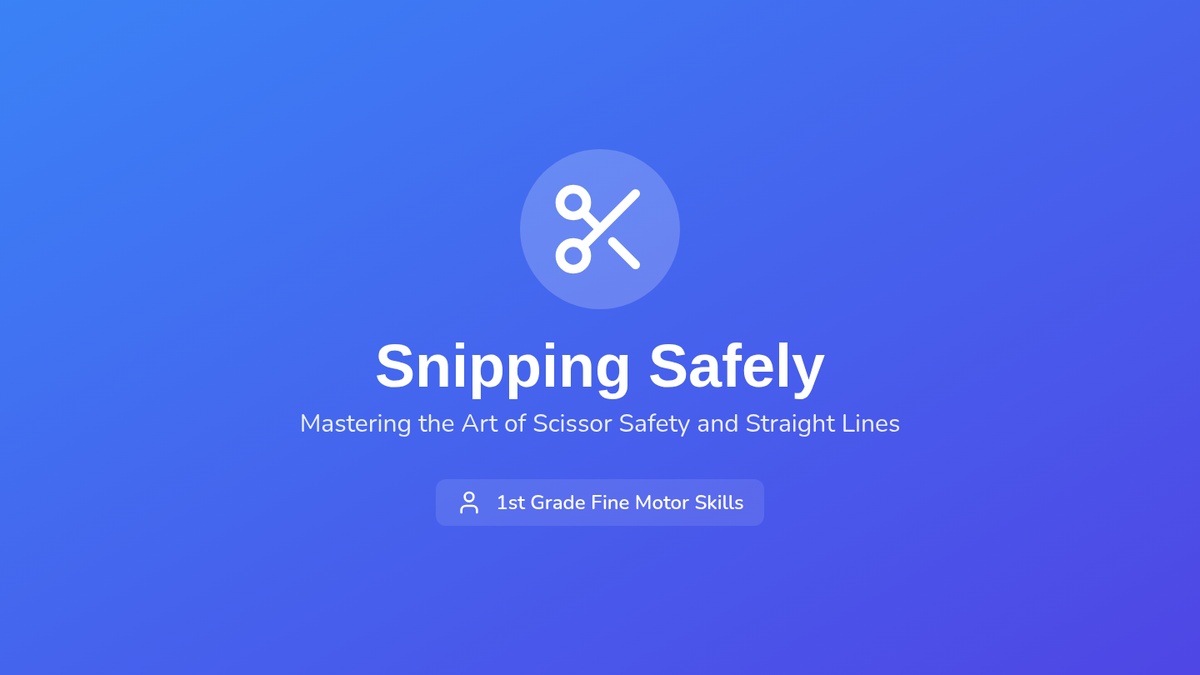 A systematic progression for 1st-grade students to master scissor skills, from basic safety and 'thumbs up' grips to complex geometric cutting and artistic collage creation. The sequence emphasizes bilateral coordination, paper manipulation, and precision through engaging, hands-on activities.