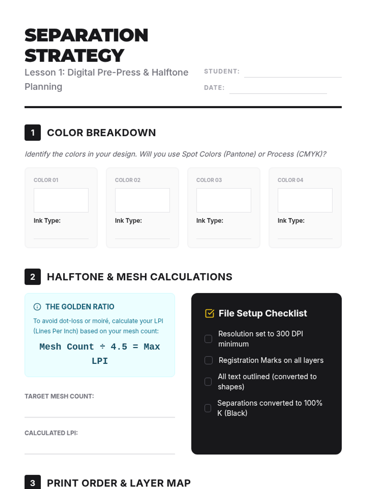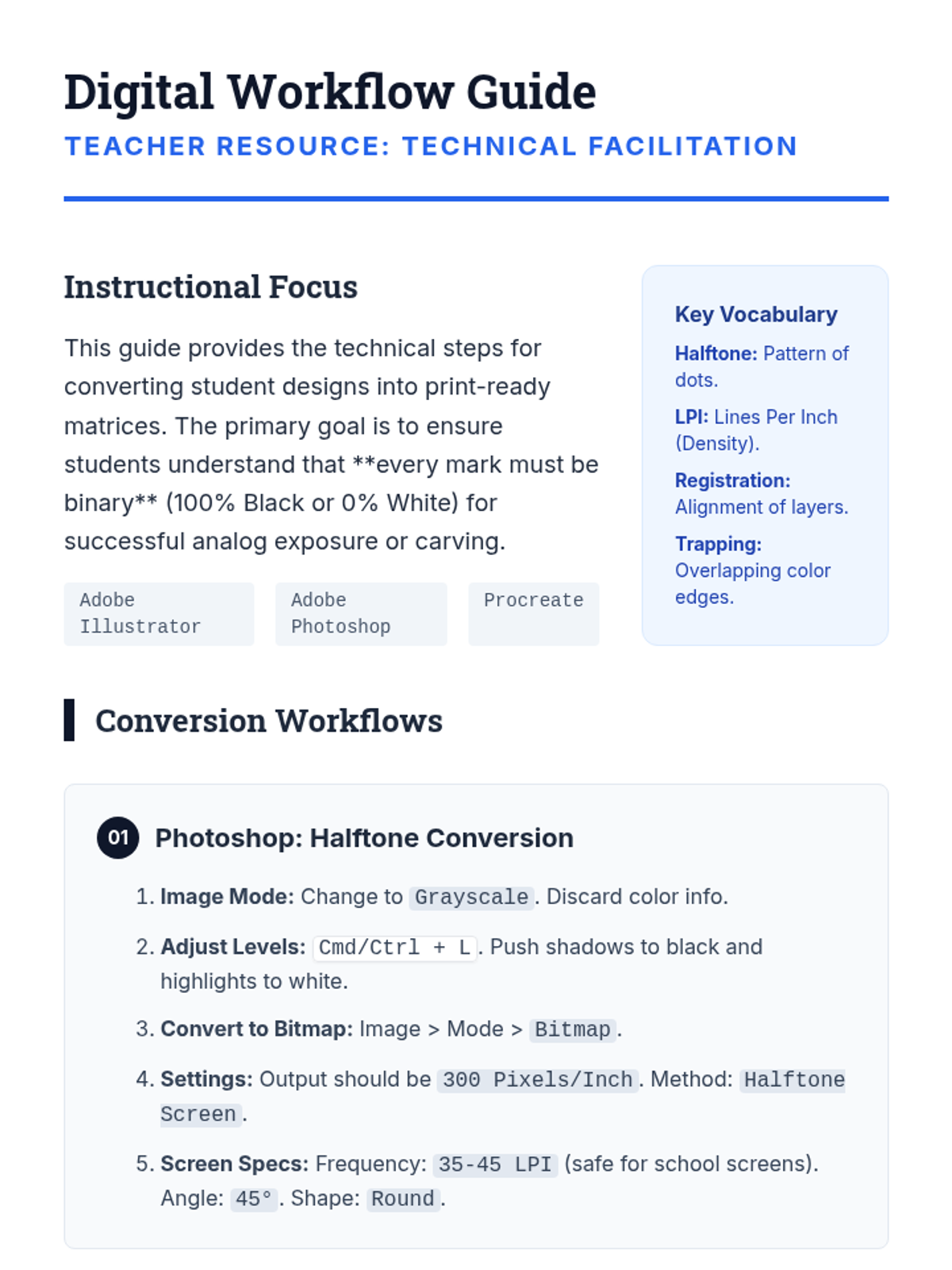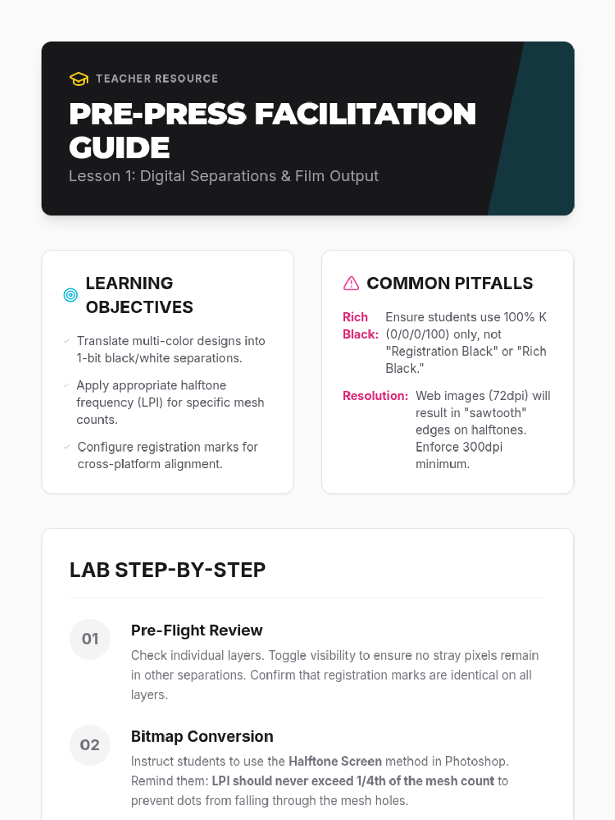 This 11th Grade sequence introduces students to the technical and creative world of screen printing. Over five lessons, students master the photo-emulsion process, layer-based design thinking, typography, and professional production techniques, culminating in a multi-color print run.