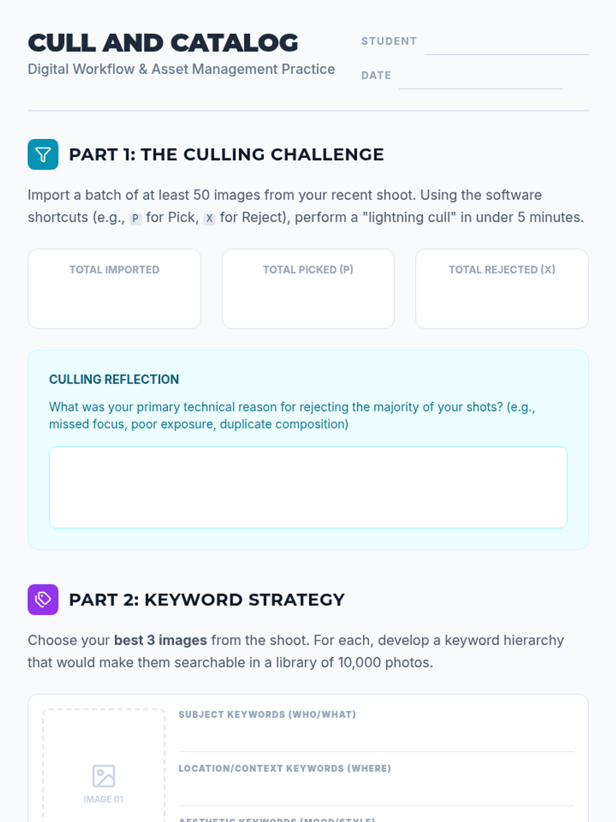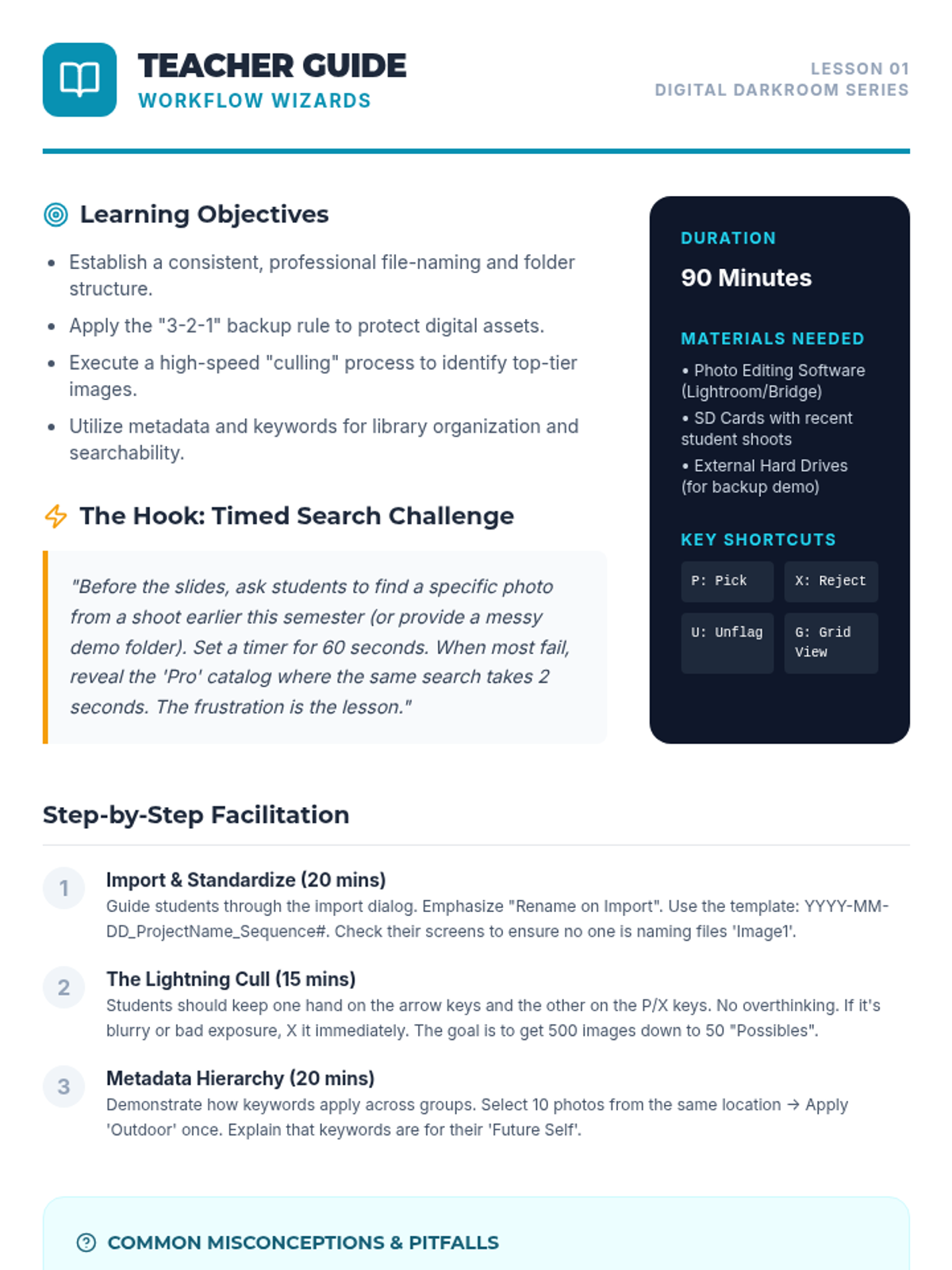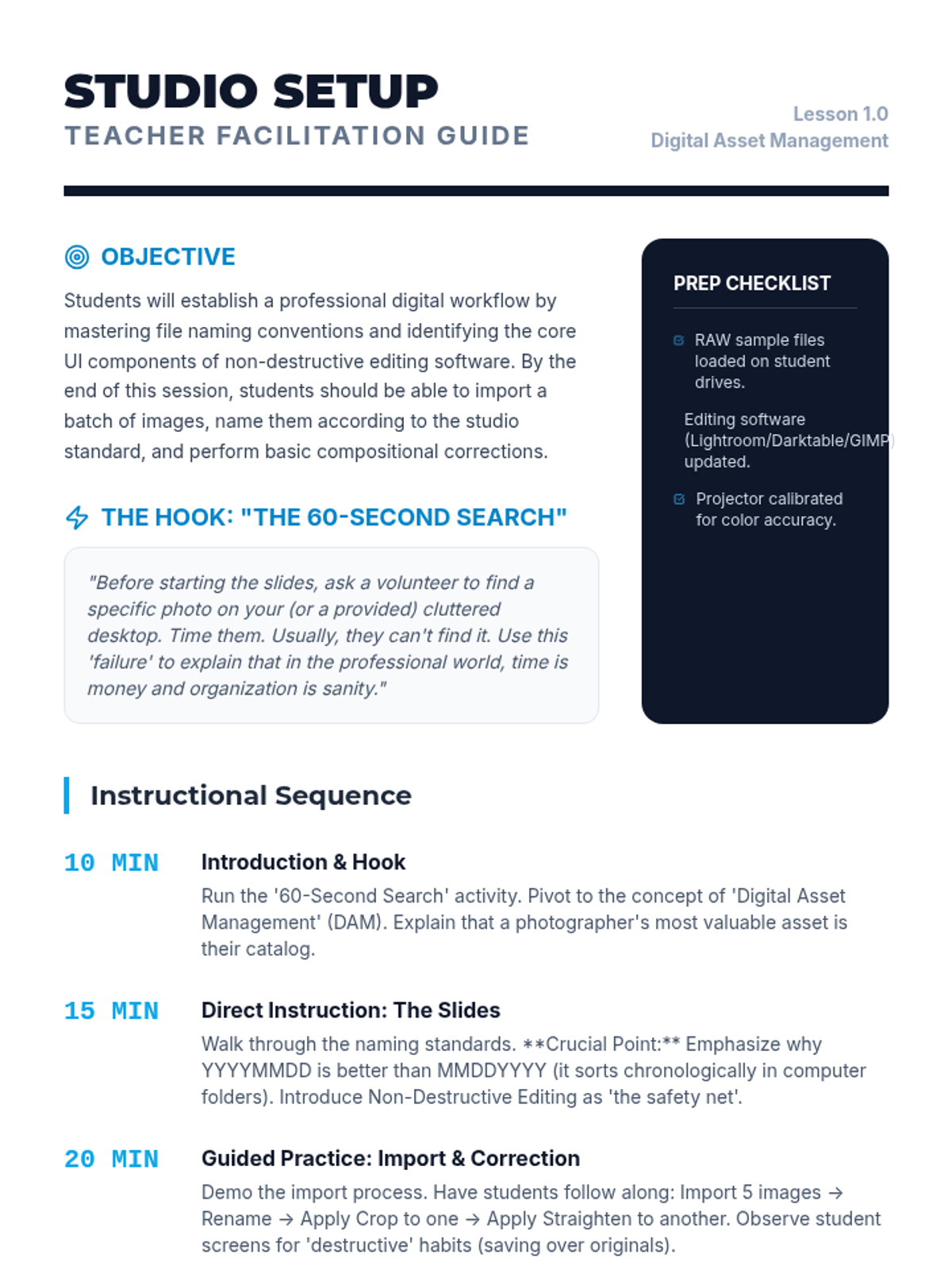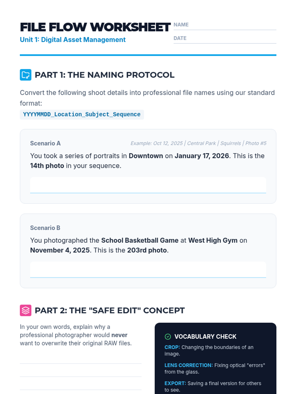 A comprehensive 12th-grade photography sequence focusing on professional digital workflow, non-destructive editing, and the ethics of post-processing. Students progress from basic organization to advanced color grading and retouching while debating the boundaries of photographic truth.