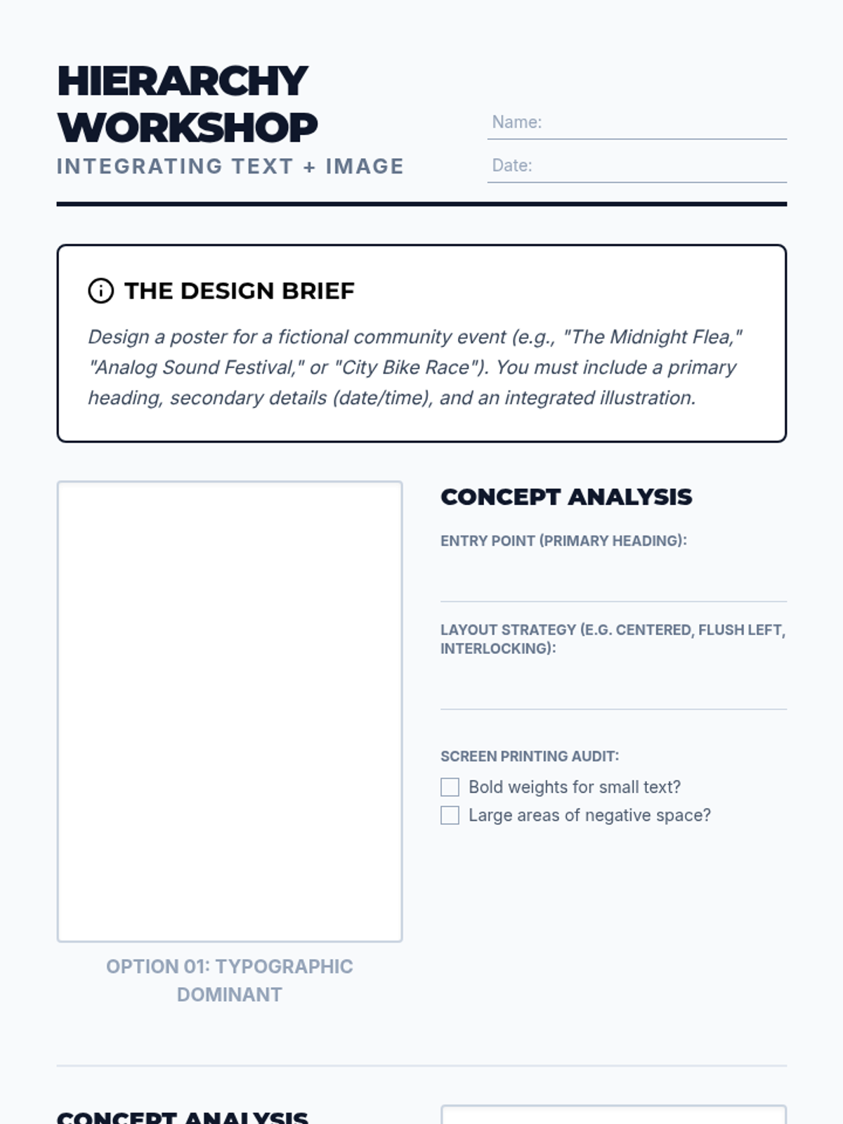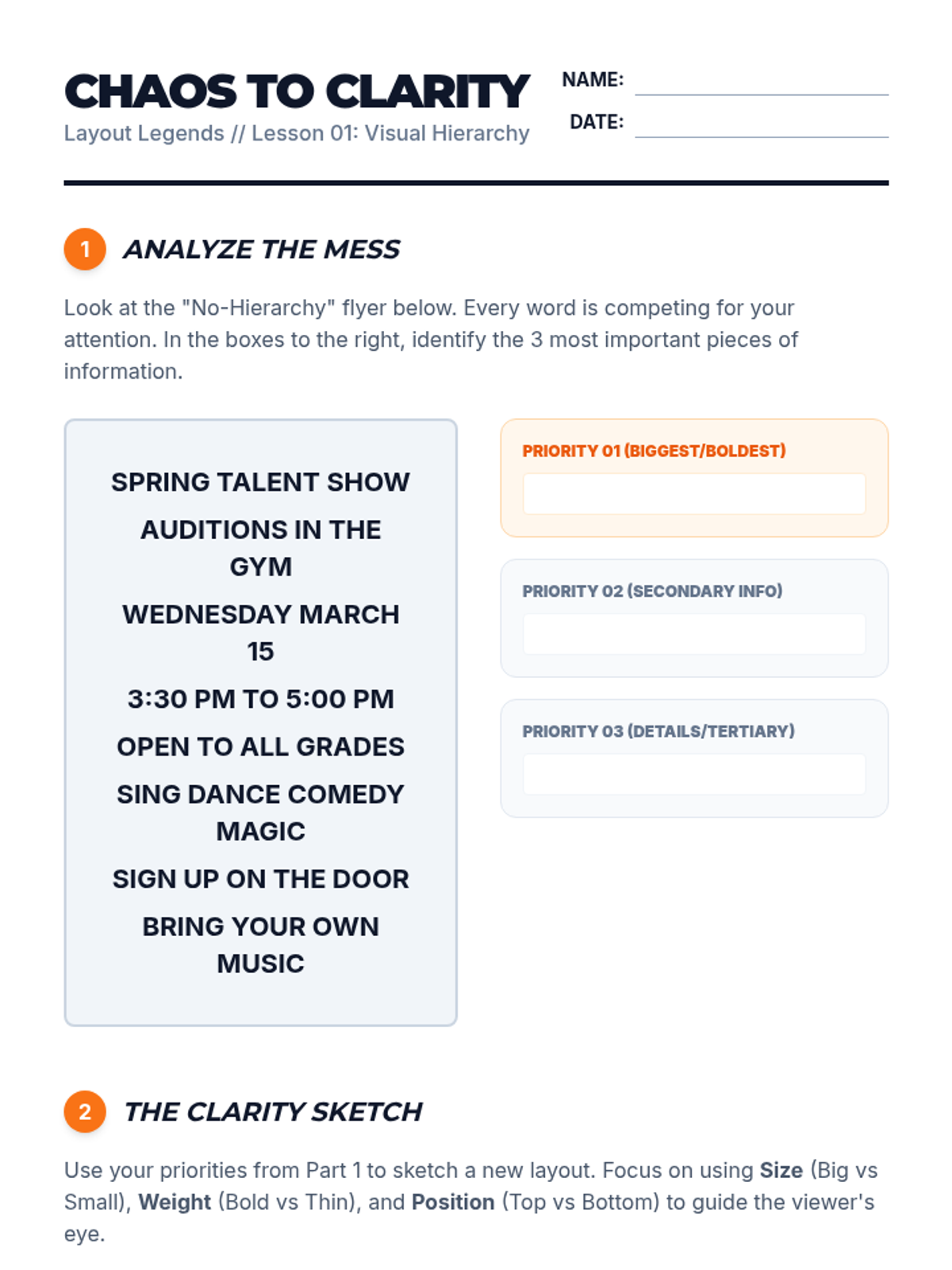 A project-based journey into the world of graphic design layout, focusing on visual hierarchy, grids, balance, and the integration of text and images. Students move from analyzing visual chaos to creating professional-grade compositions.