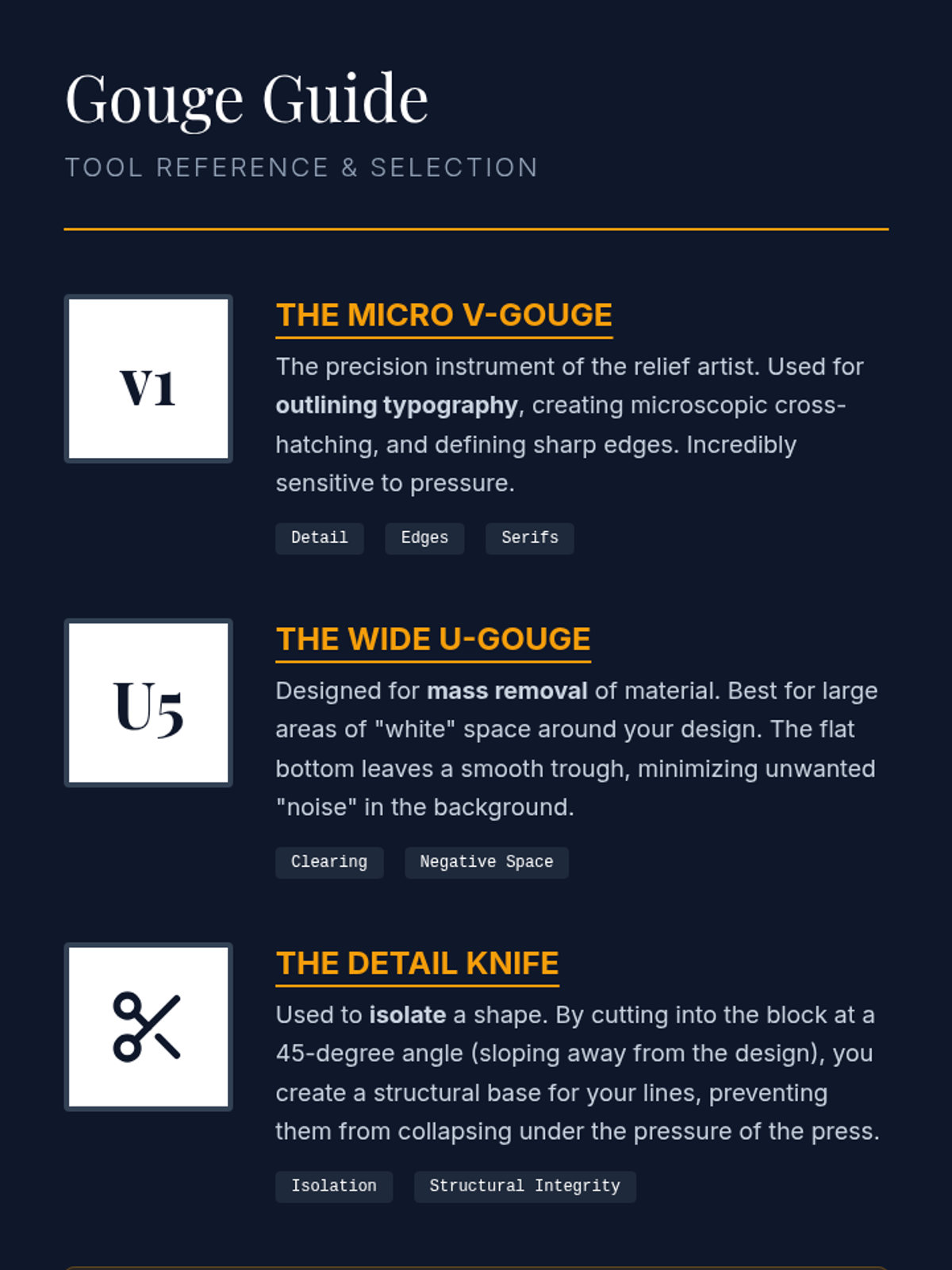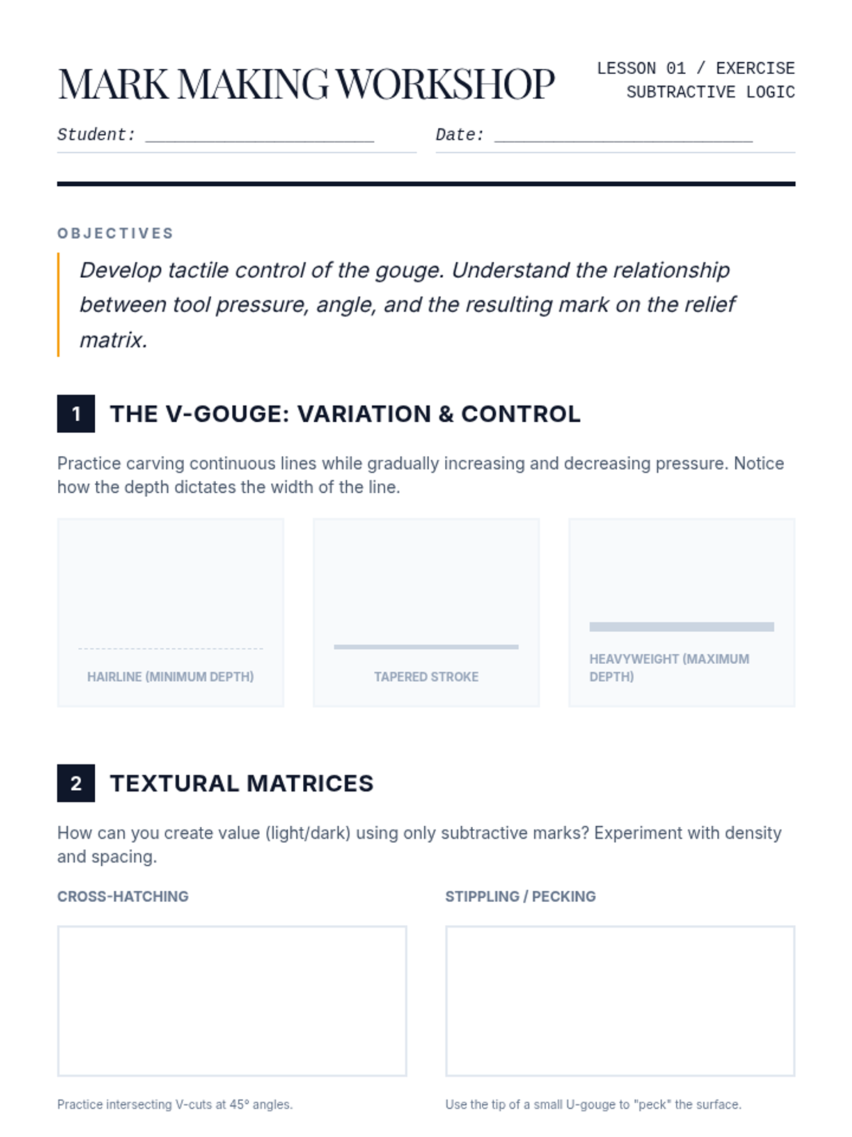 A comprehensive workshop-style sequence for undergraduate students exploring the intersection of relief printmaking and typography. Students master subtractive carving, typographic layout, ink chemistry, and professional editioning standards.
