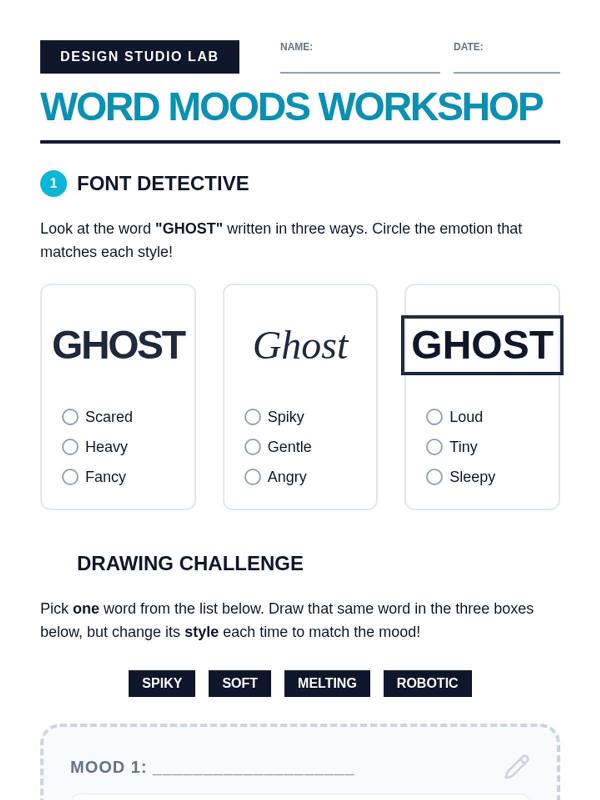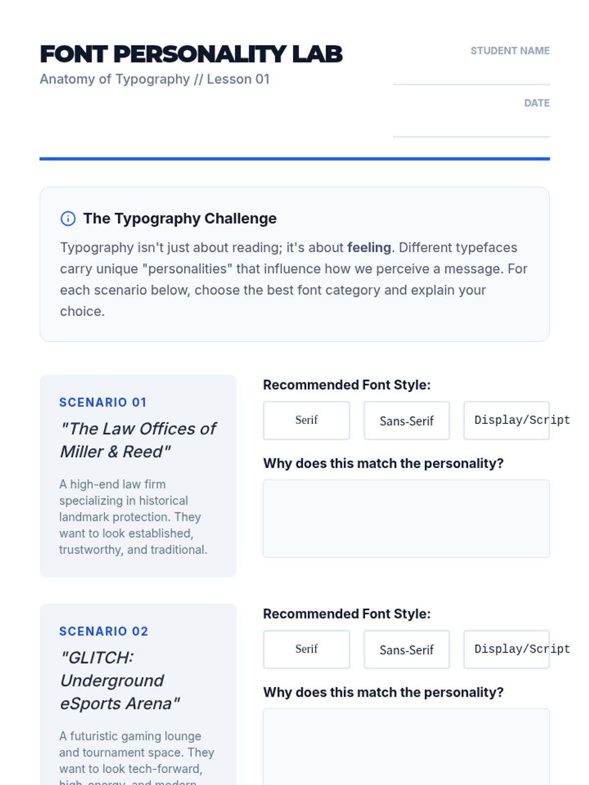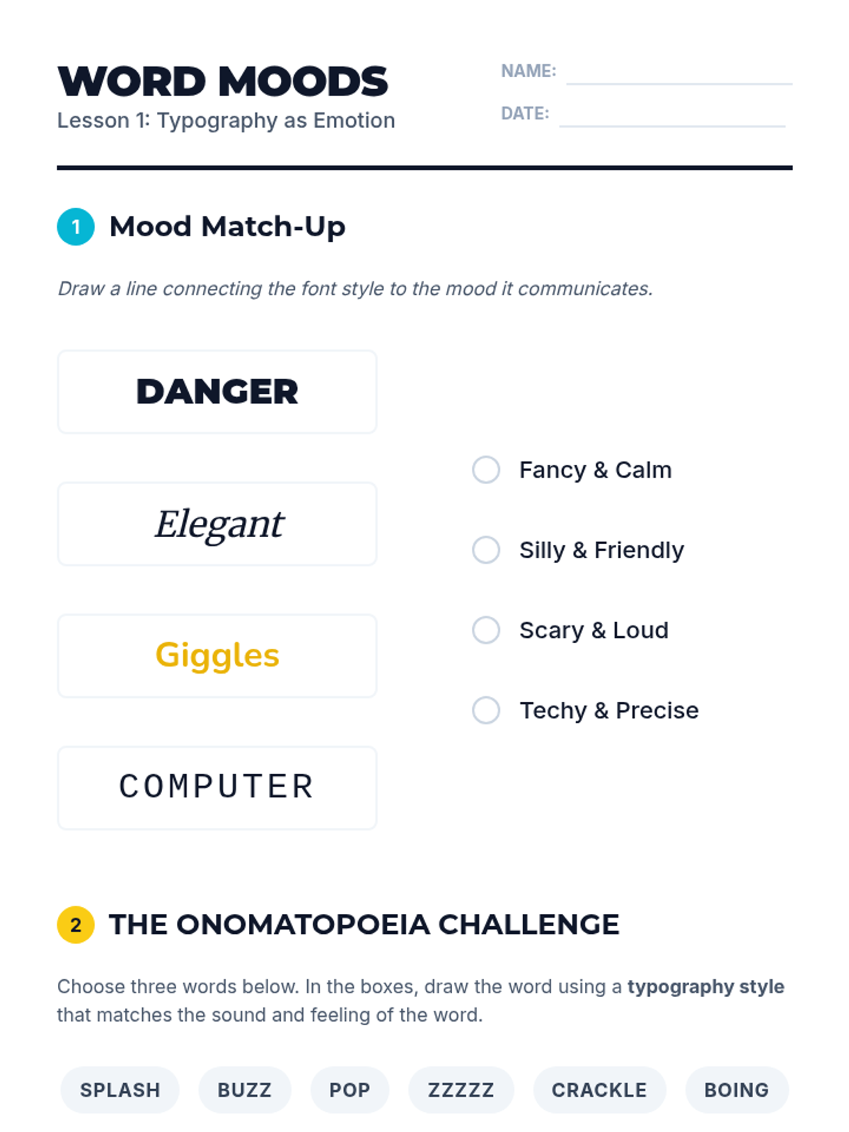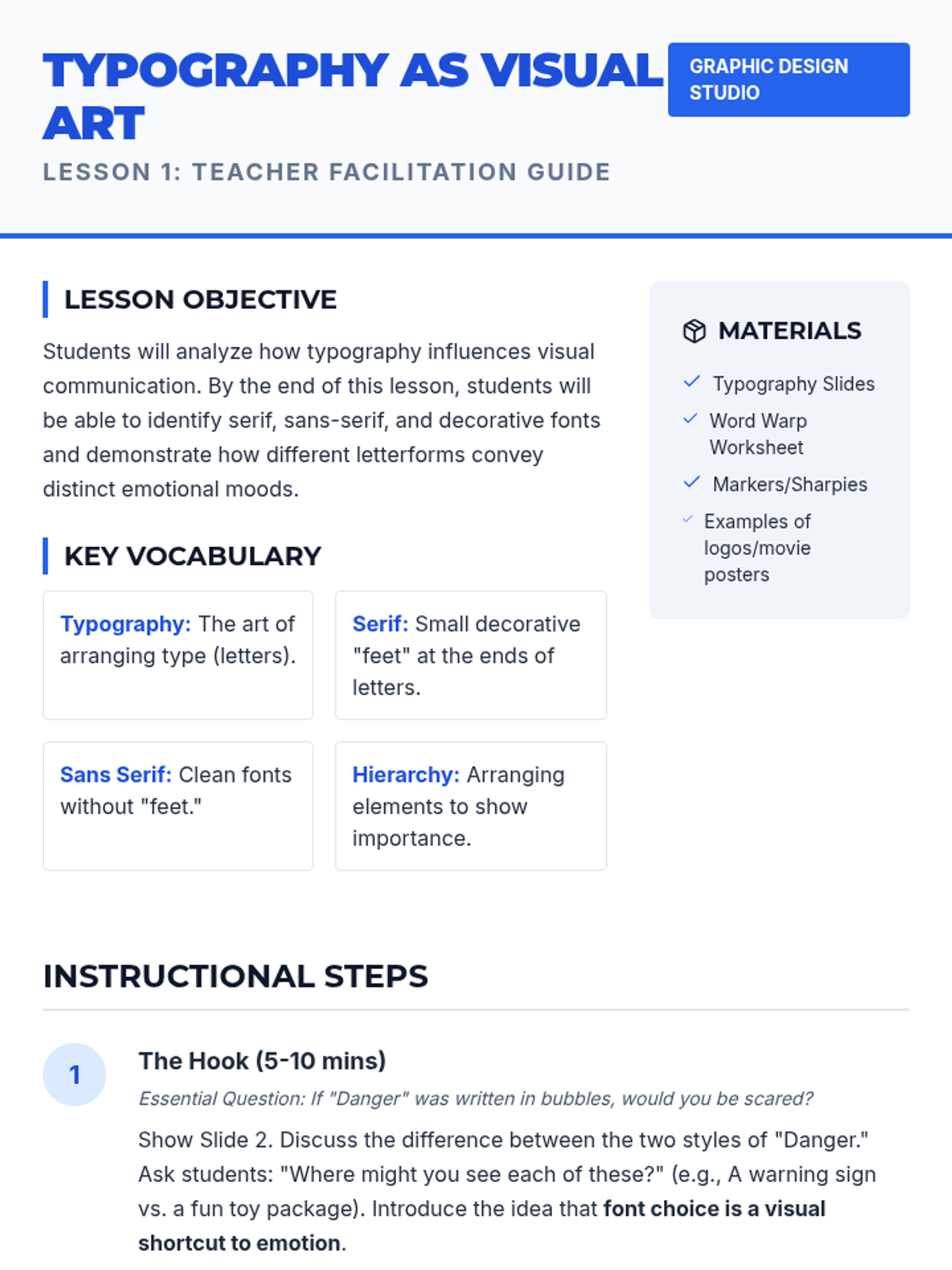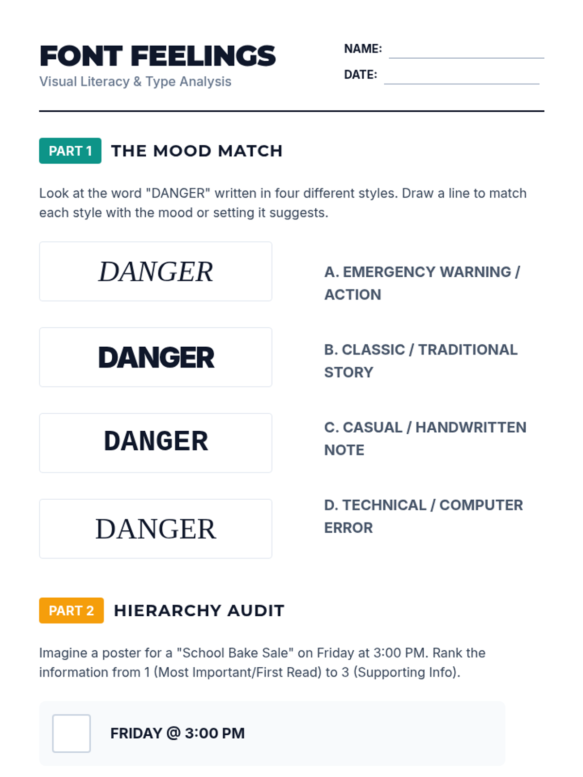 This sequence introduces 2nd-grade students to graphic design through typography and layout. Students learn how font styles convey emotion and how the arrangement of visual elements creates hierarchy and meaning, culminating in a handmade poster project.
