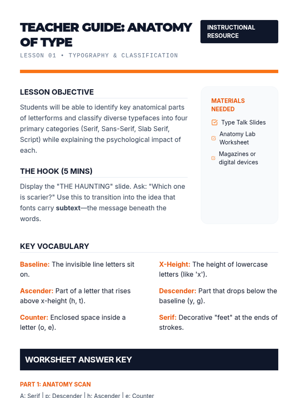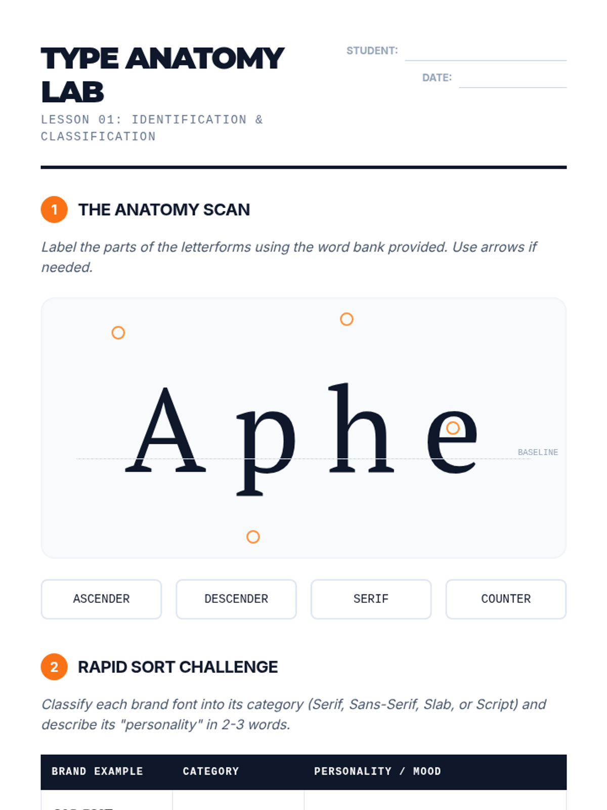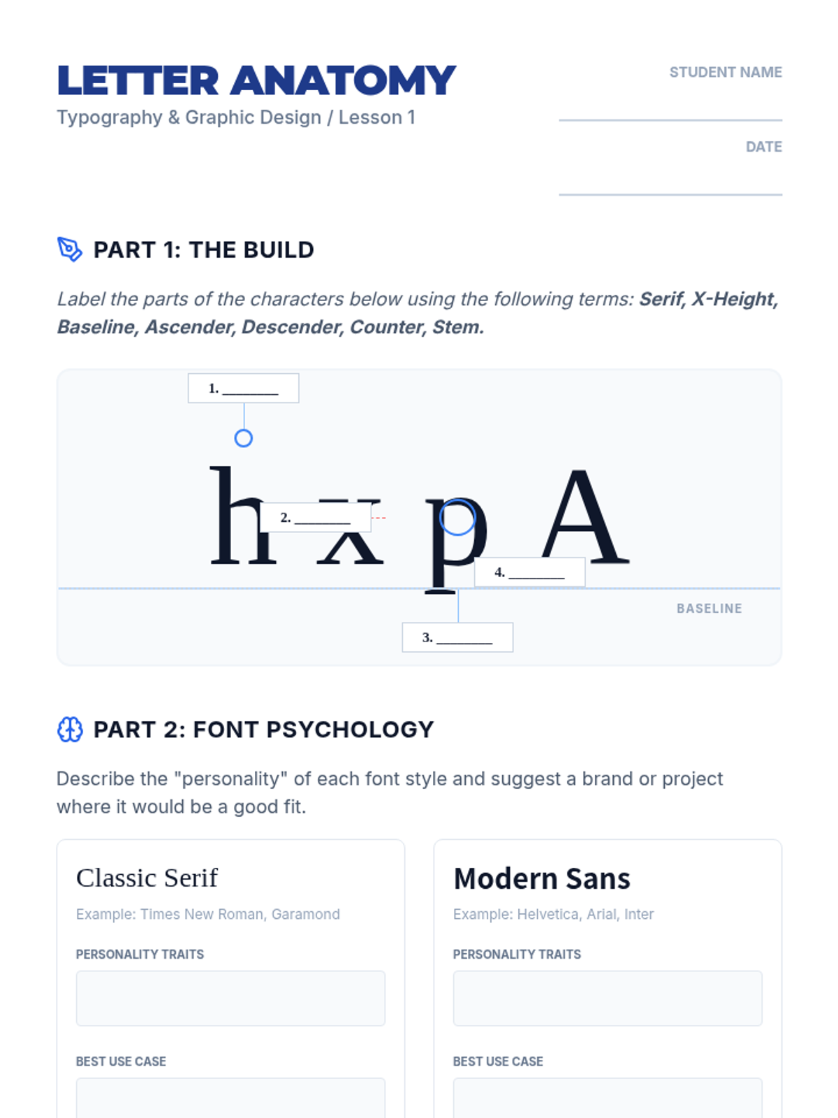 A comprehensive introduction to digital graphic design and typography for 10th-grade students. This sequence bridges the gap between traditional art and modern vector-based technology, focusing on anatomy, hierarchy, logo design, and print preparation.