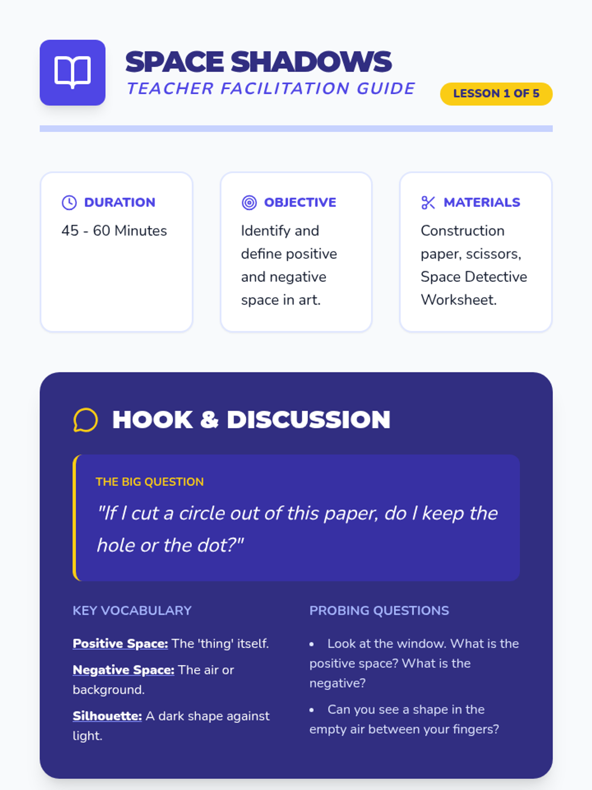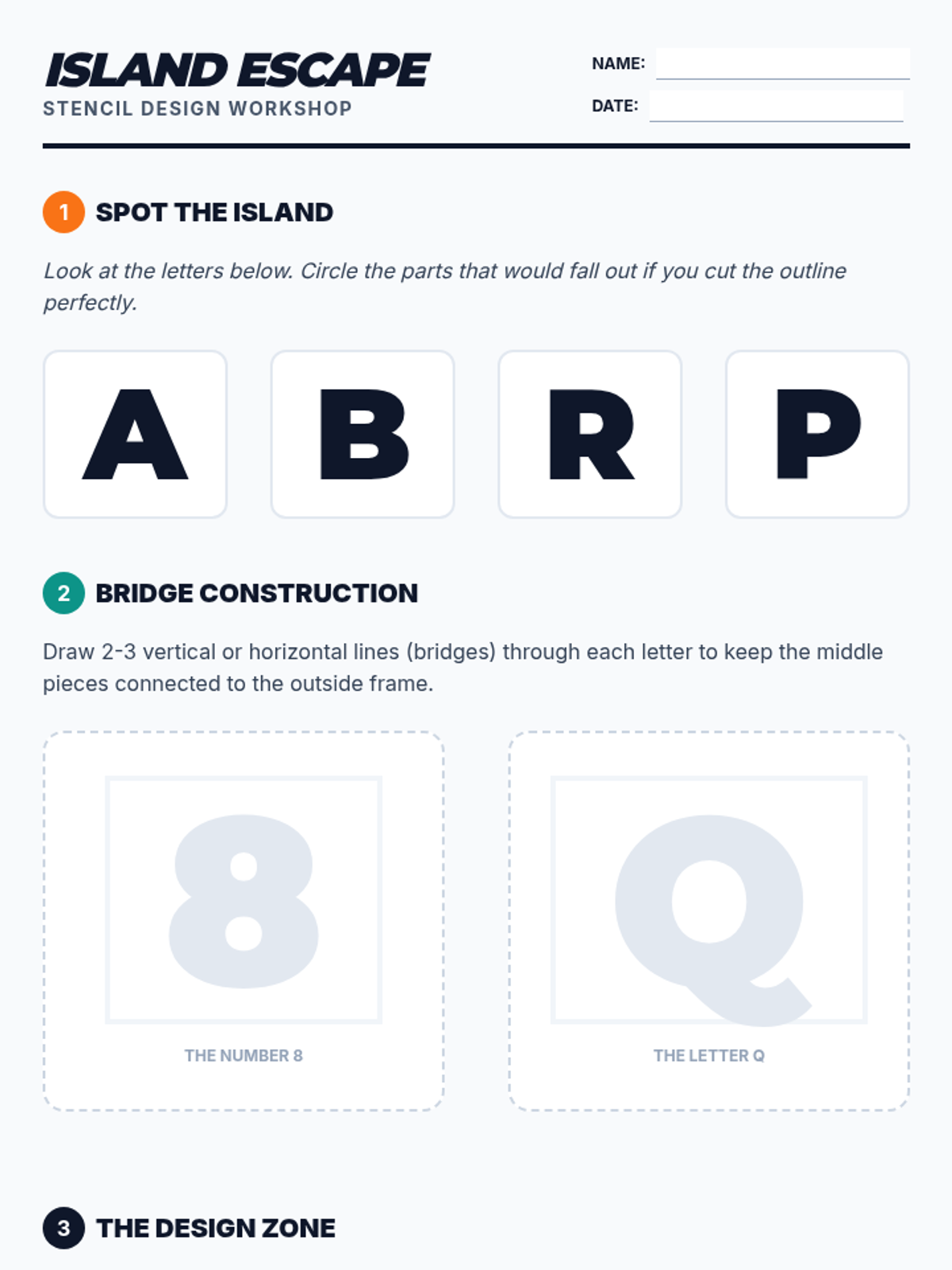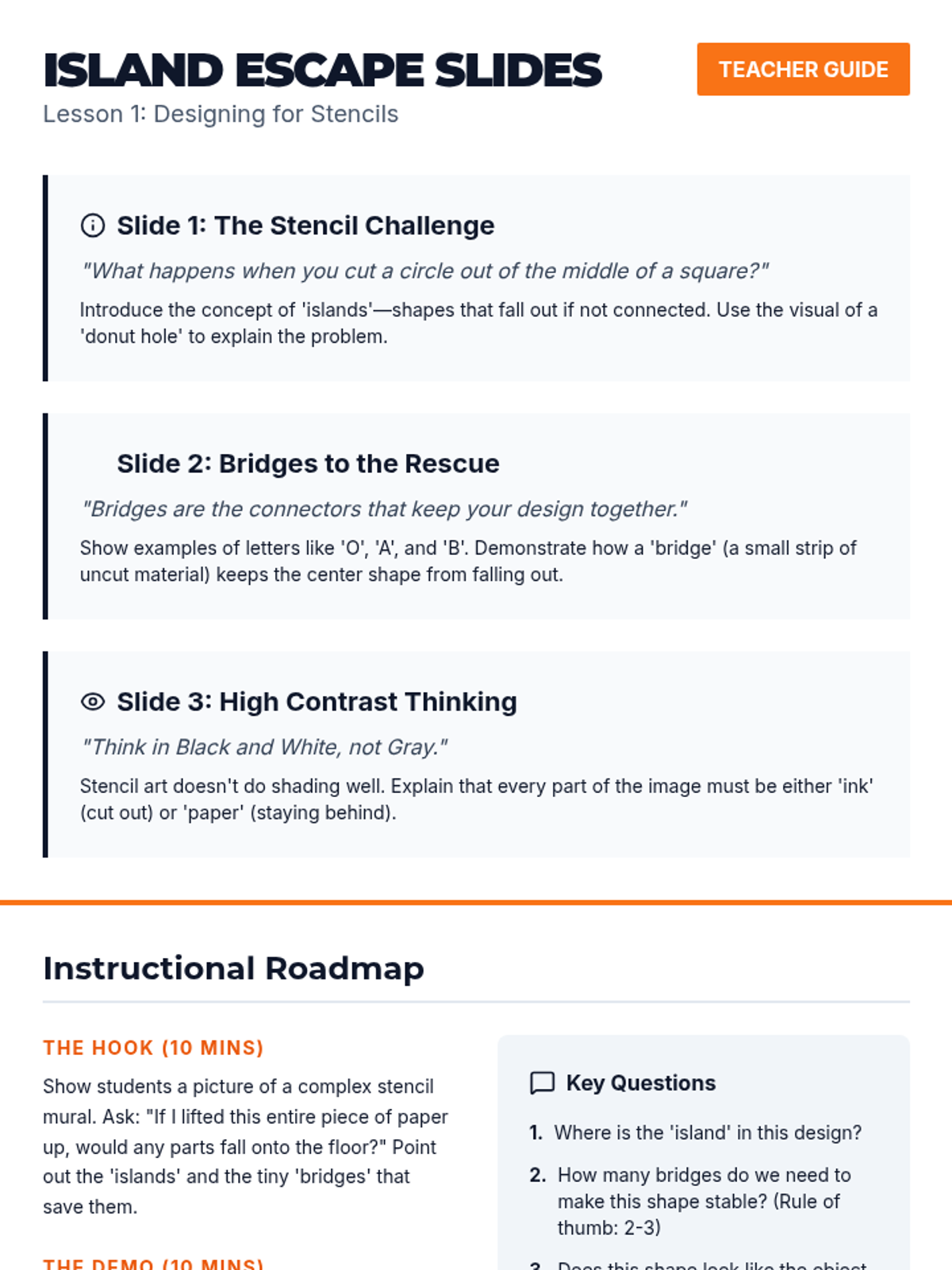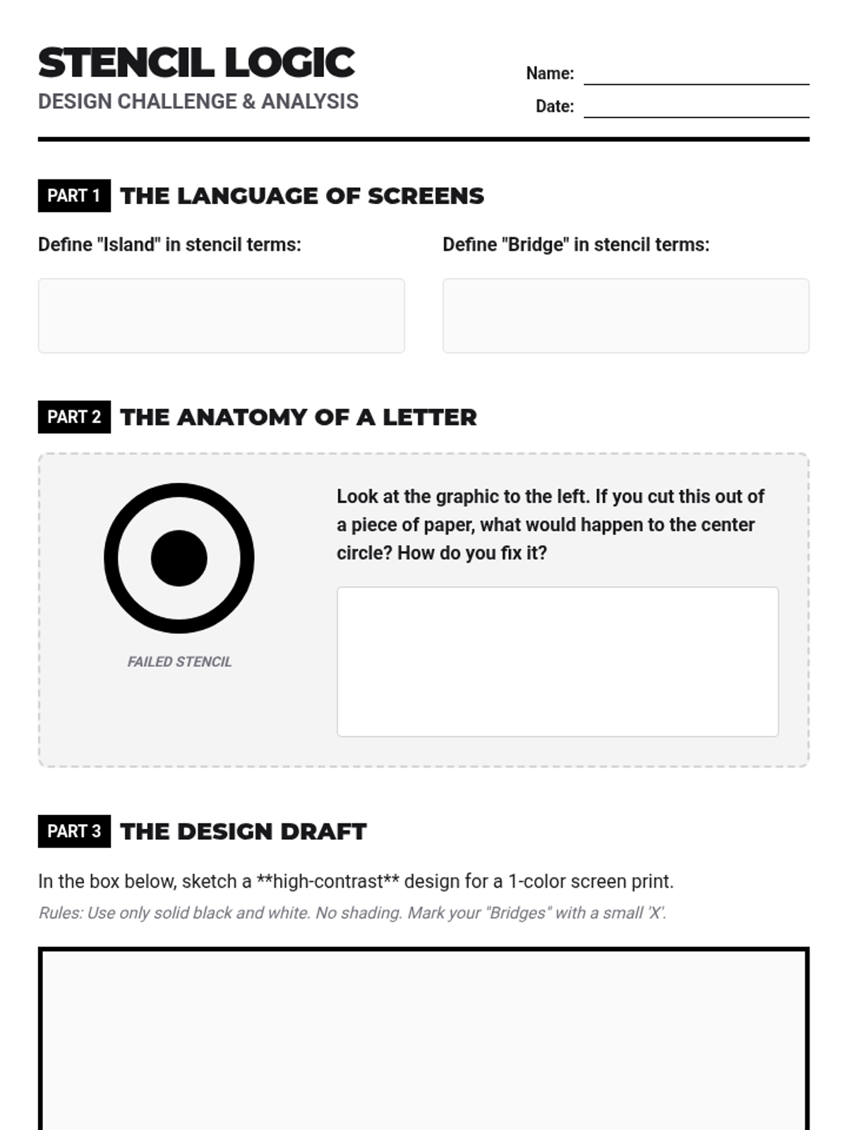 A project-based sequence where 3rd-grade students explore the fundamentals of graphic design through stencil making and screen printing. Students master the concepts of positive and negative space, learn the technical constraints of stencil 'bridges', and produce multi-layered graphic posters.