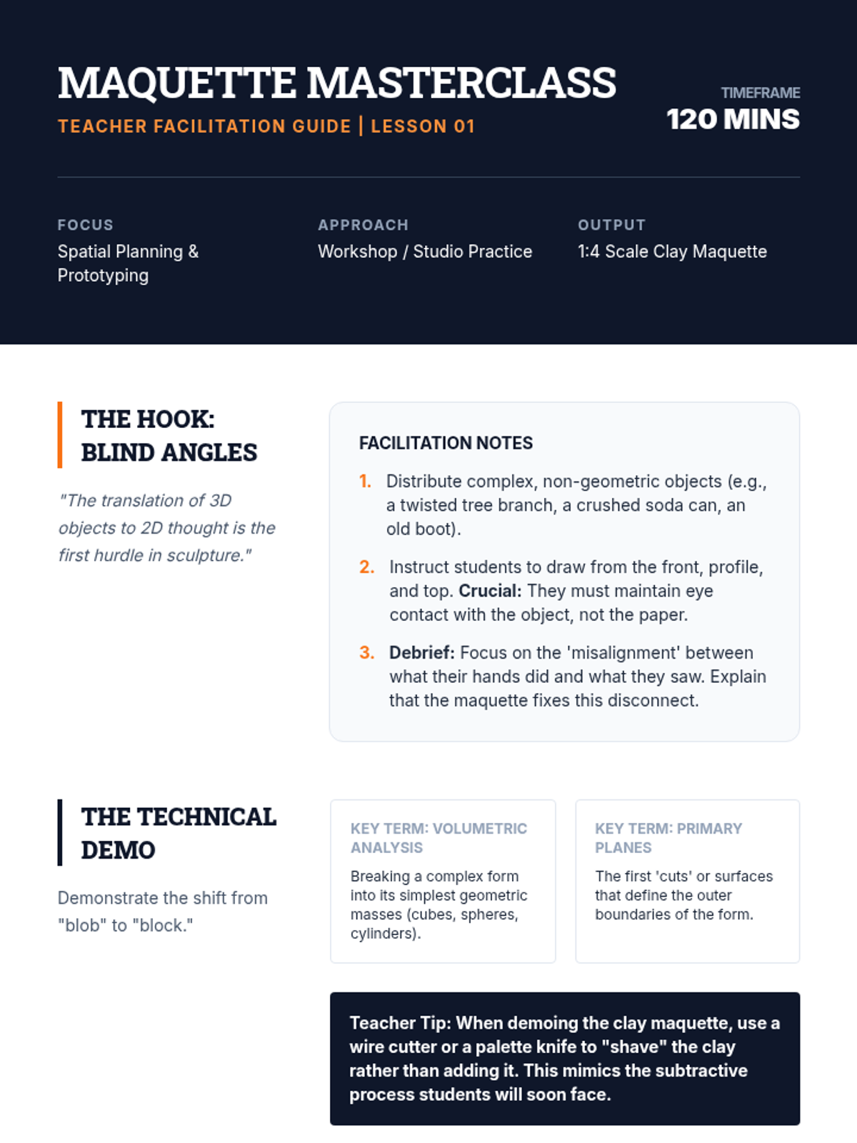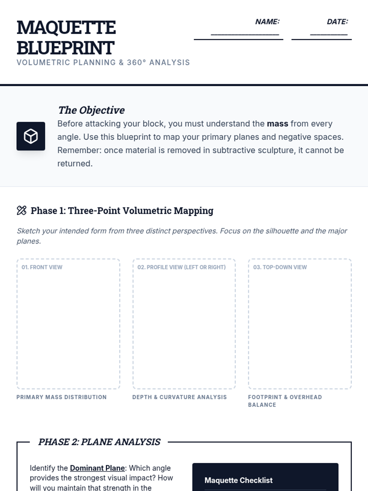 This advanced 12th-grade sequence guides students through the rigorous process of subtractive sculpture. From conceptual clay maquettes to final surface treatments, students master the relationship between mass and negative space to create portfolio-ready 3D works.