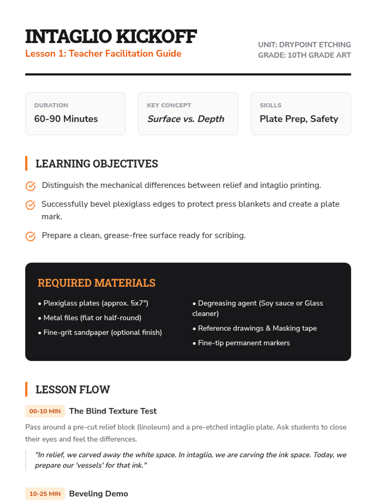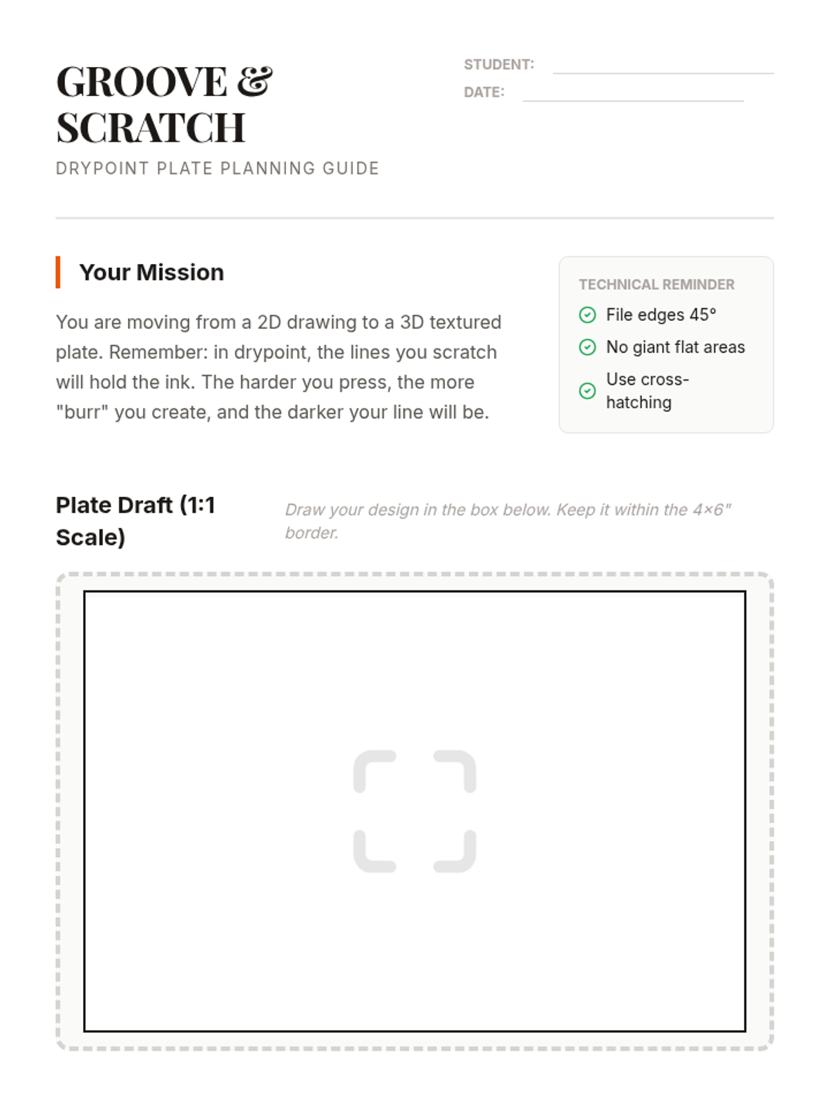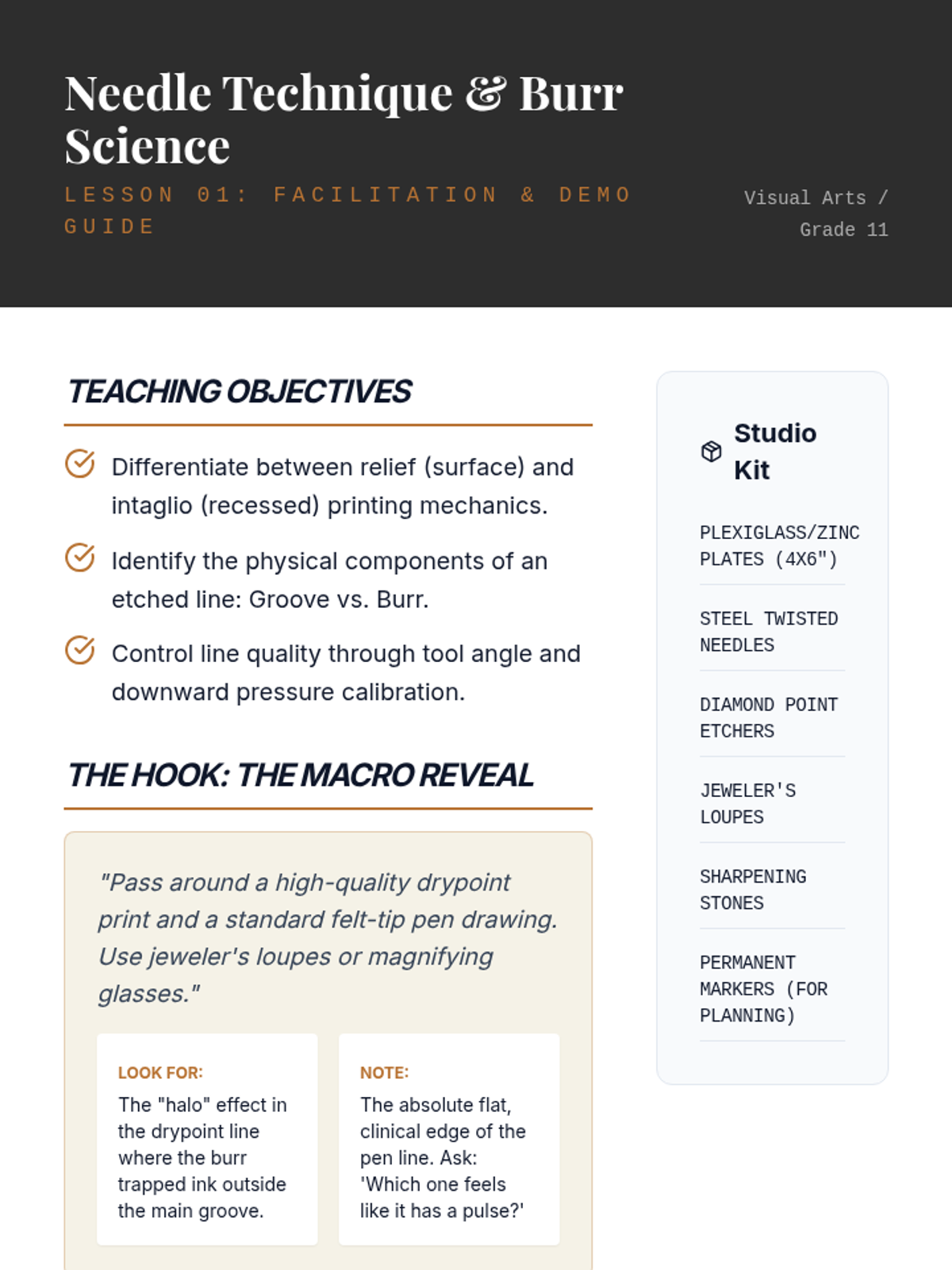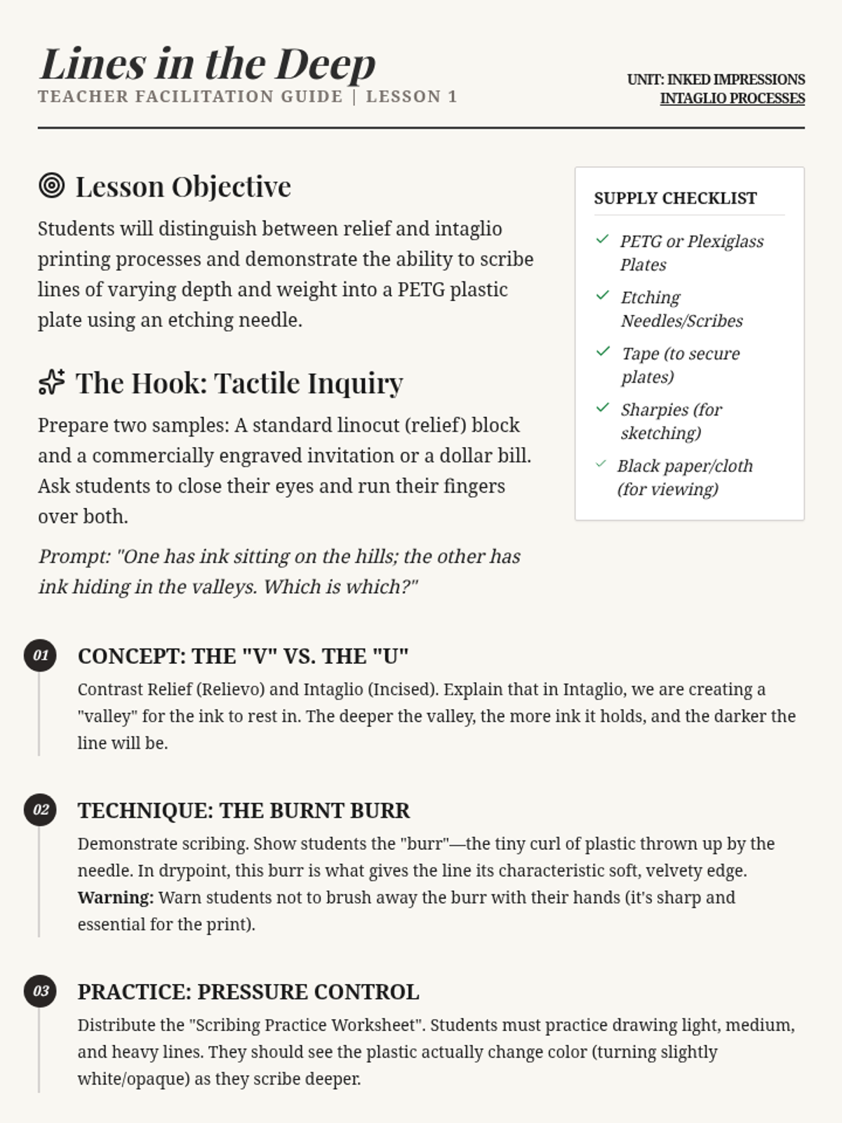 A comprehensive 12th-grade unit on intaglio drypoint printing, covering historical context, plate preparation, incising techniques, inking/wiping, press operation, and chine-collé integration. Students move from raw plate preparation to pulling professional-grade prints.