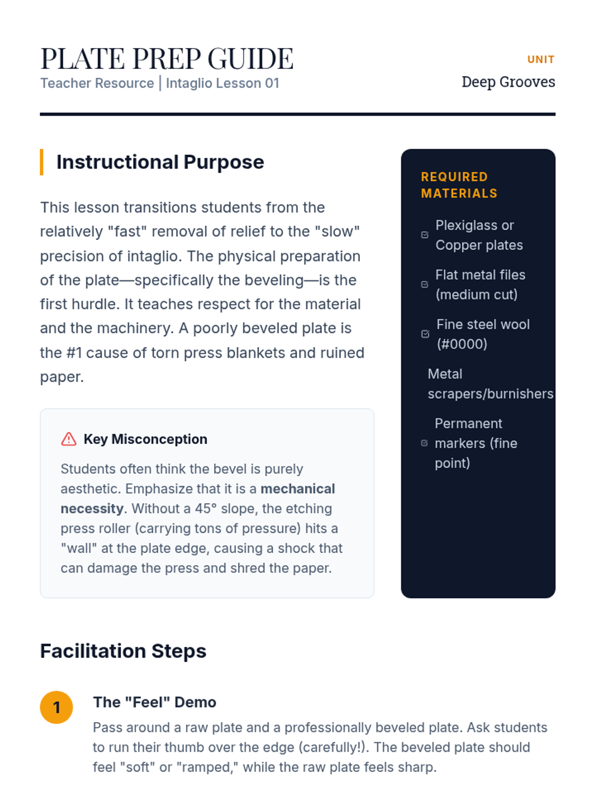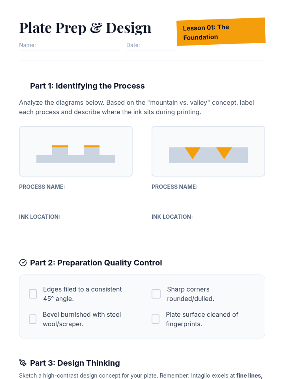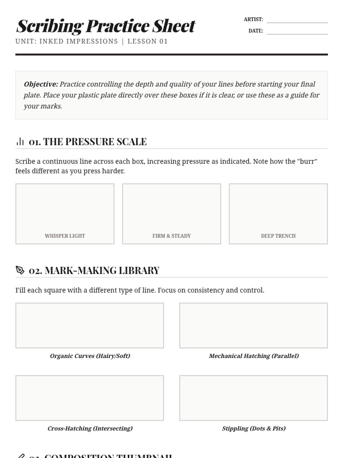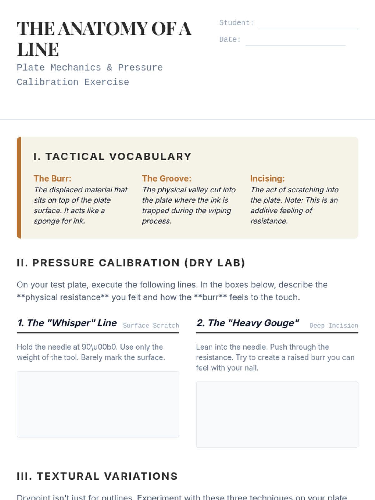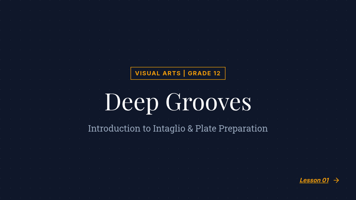 A comprehensive 12th-grade unit on intaglio drypoint printing, covering historical context, plate preparation, incising techniques, inking/wiping, press operation, and chine-collé integration. Students move from raw plate preparation to pulling professional-grade prints.