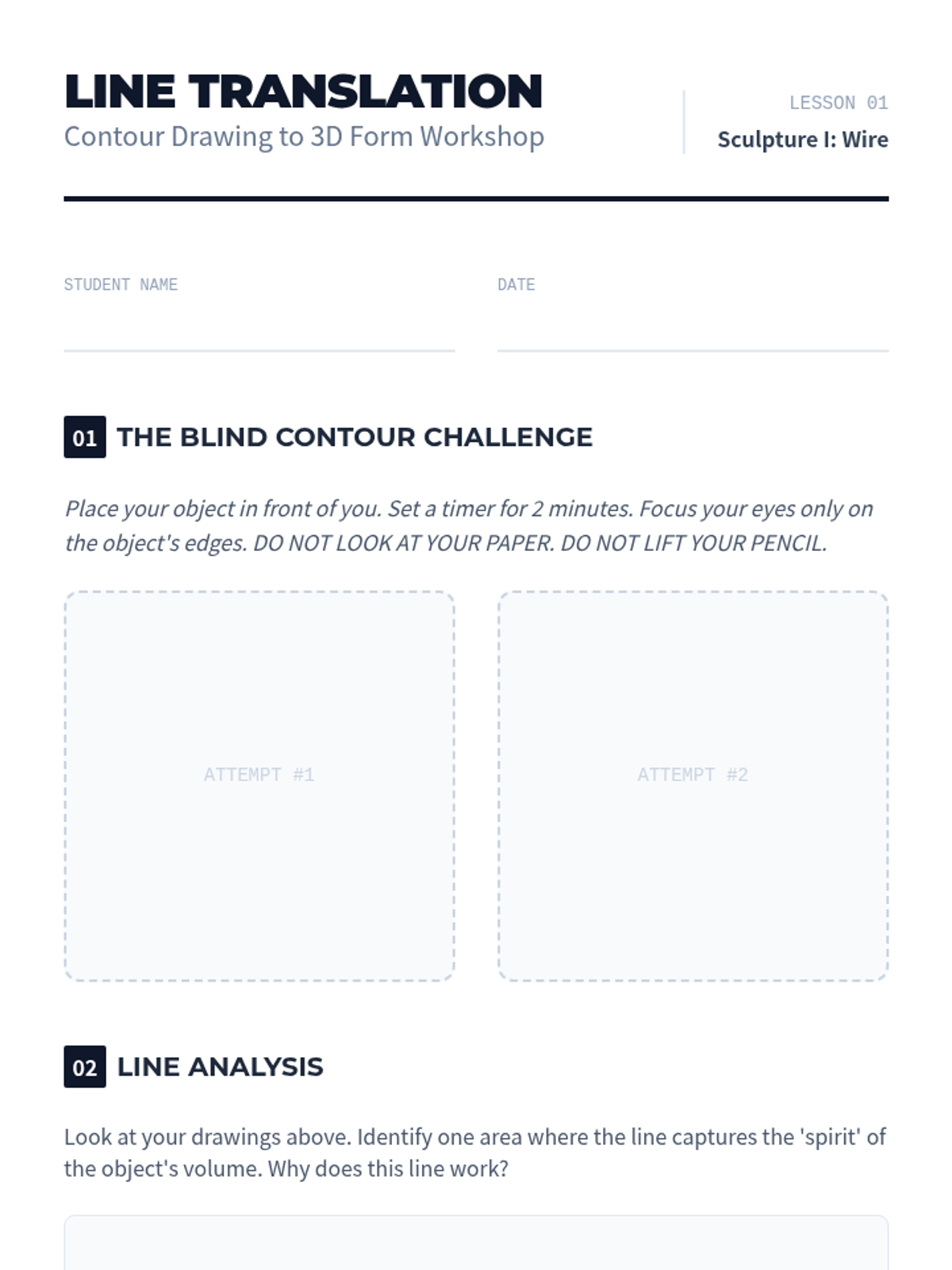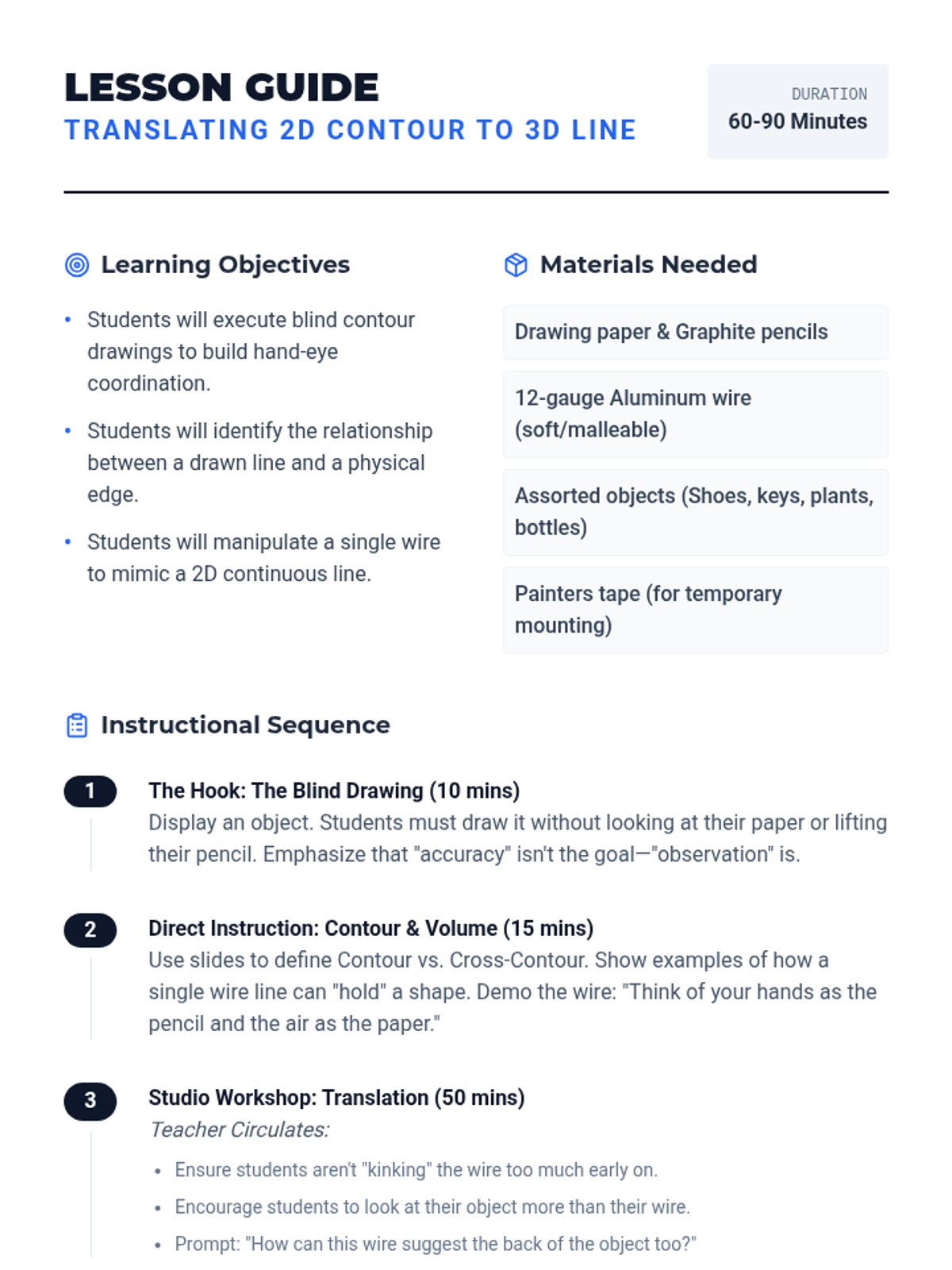 A comprehensive 9th-grade visual arts unit focusing on translating 2D drawings into 3D wire sculptures. Students explore contour lines, tool safety, spatial volume, and presentation through the lens of 'drawing in space.'