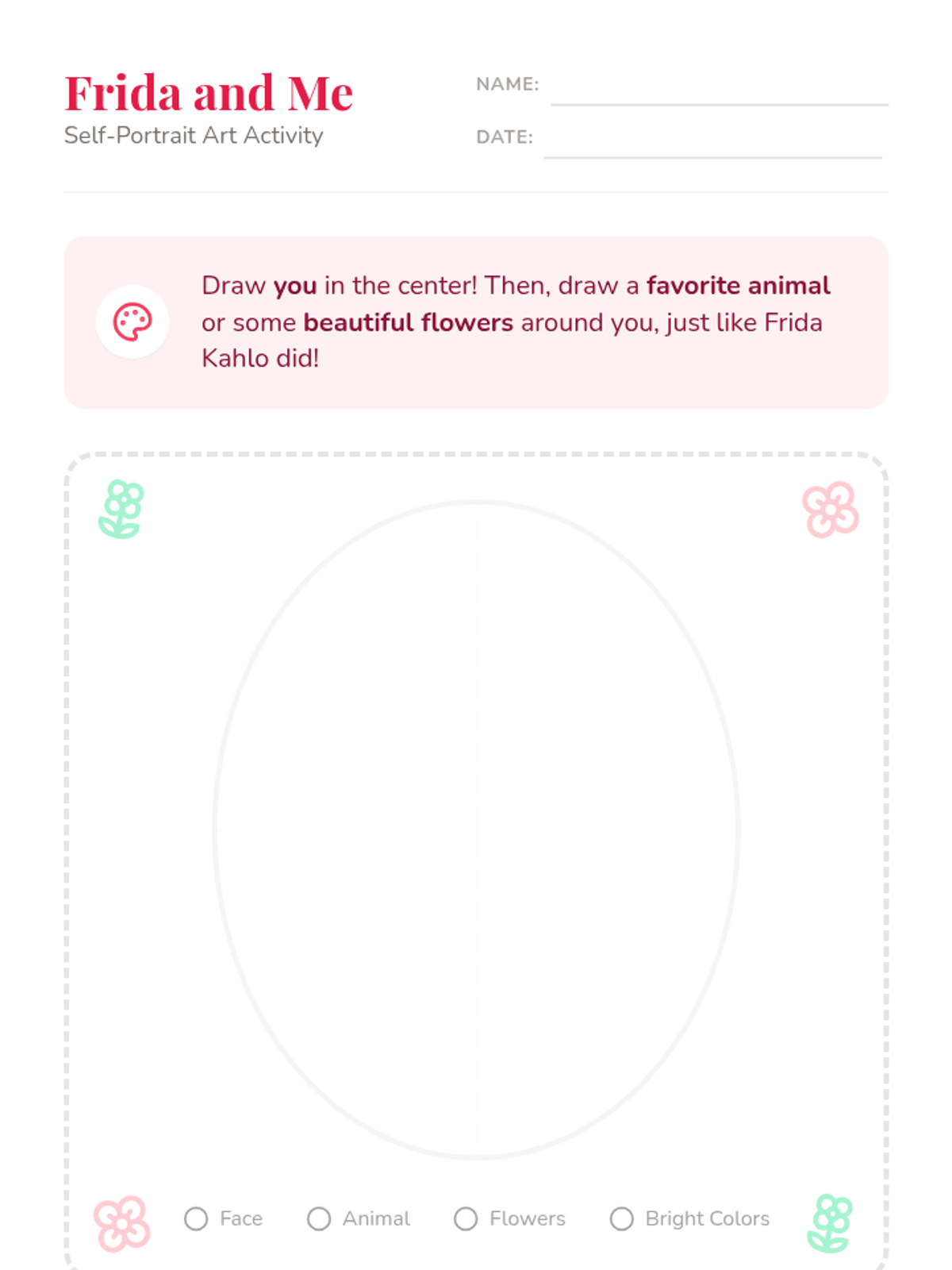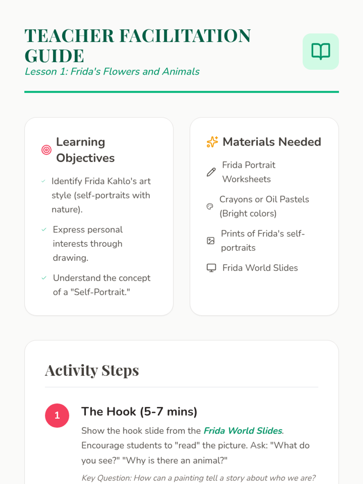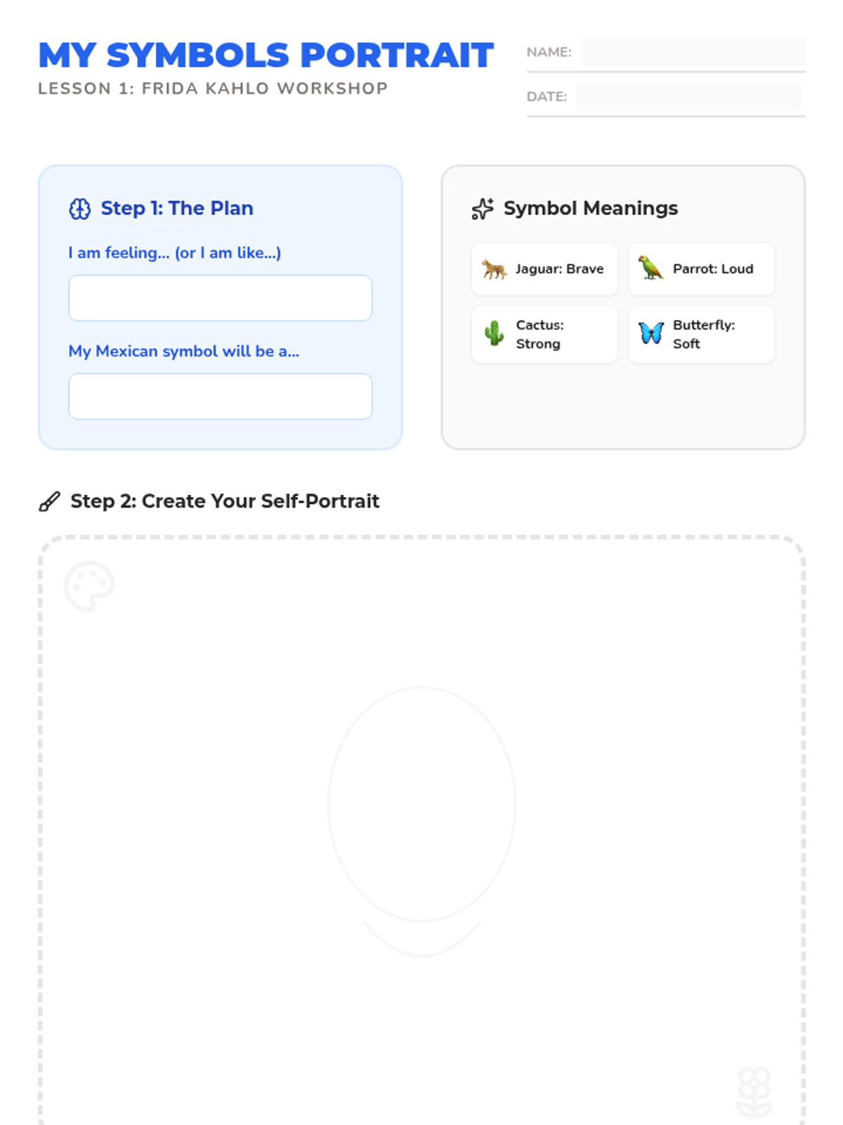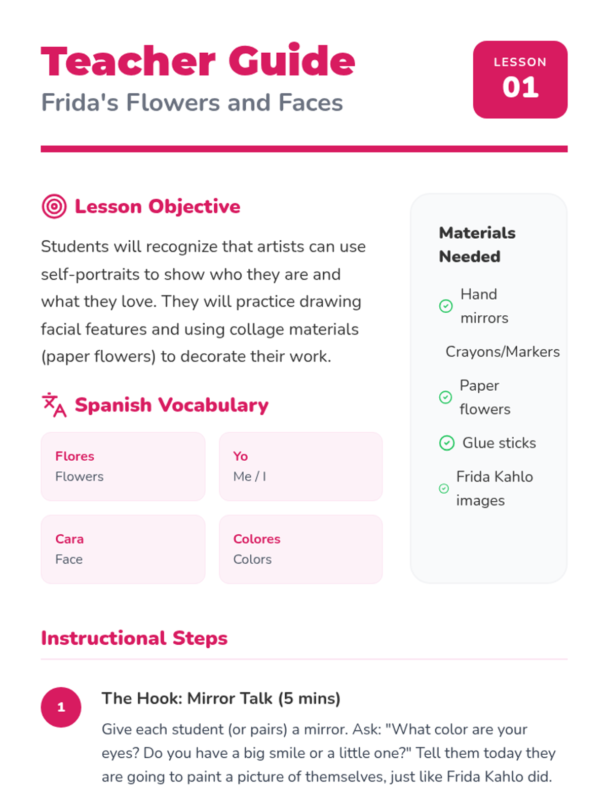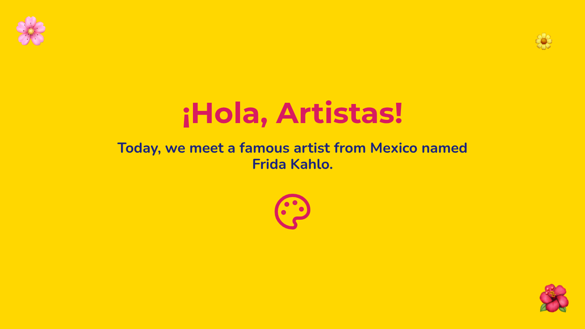 A 5-lesson unit for 2nd graders exploring influential Spanish and Latin American artists. Students learn about Frida Kahlo, Diego Rivera, Pablo Picasso, and Alebrijes folk art through a workshop model, focusing on self-expression, community storytelling, and cultural identity.