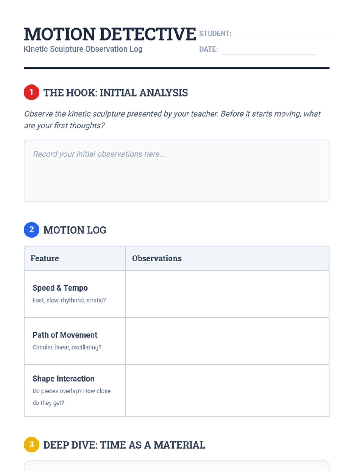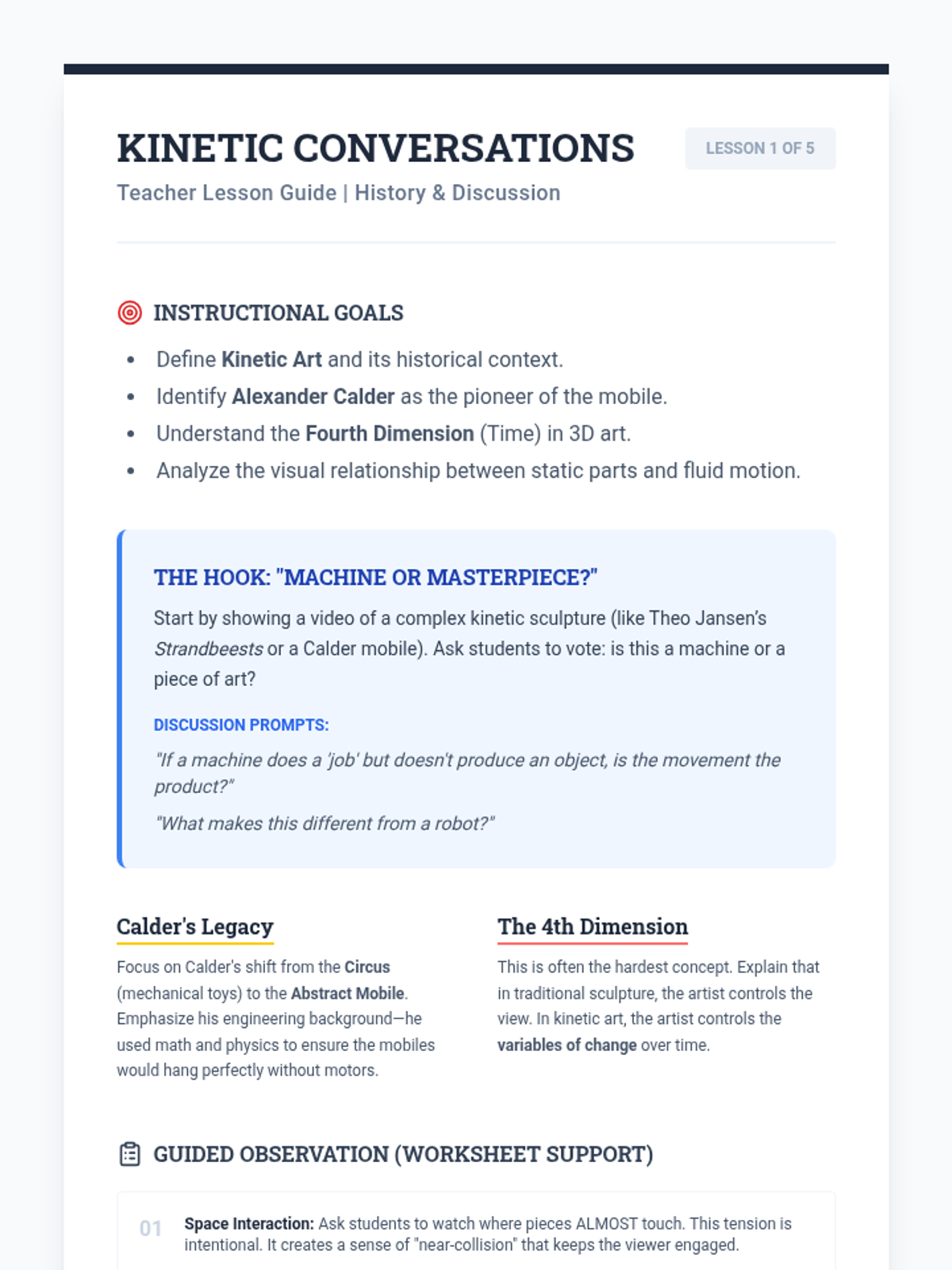 This sequence merges art with basic physics, introducing students to kinetic sculpture and mobiles. Students explore balance, fulcrums, and counterweights to create art that moves, culminating in a mobile inspired by Alexander Calder.