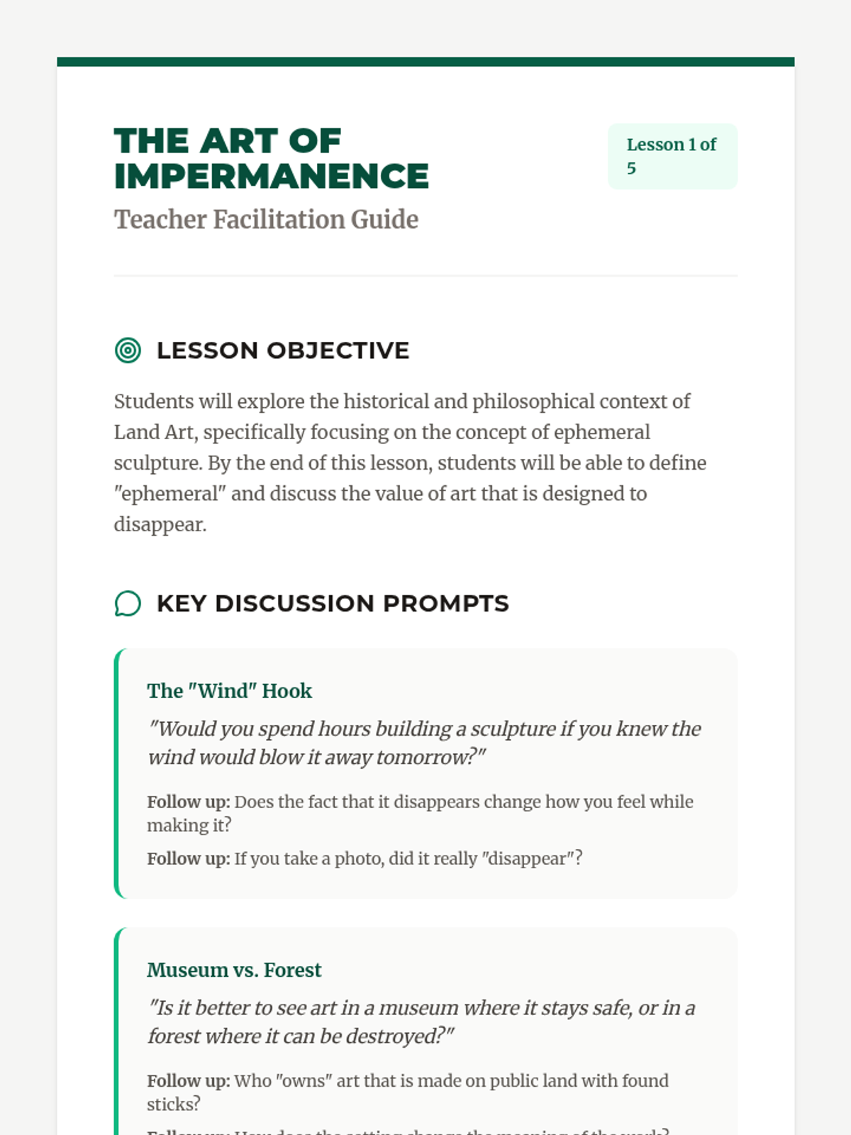 A 5th-grade art sequence exploring Land Art and environmental sculpture. Students learn to collaborate with nature using foraged materials to create ephemeral installations, emphasizing patterns, site-specificity, and documentation through photography.