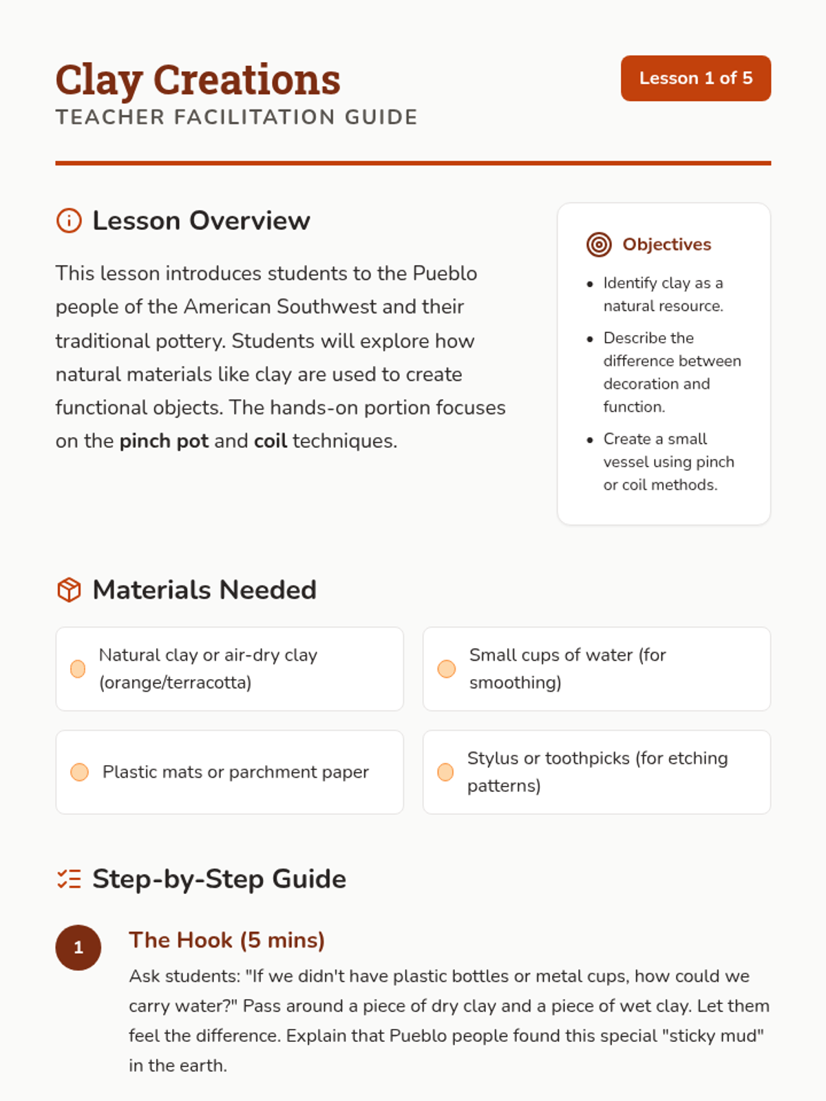 A Kindergarten sequence exploring the traditional arts and crafts of Native peoples across North America, focusing on pottery, weaving, totem poles, beadwork, and regalia. Students learn about cultural symbolism, functional art, and regional styles through hands-on creation.
