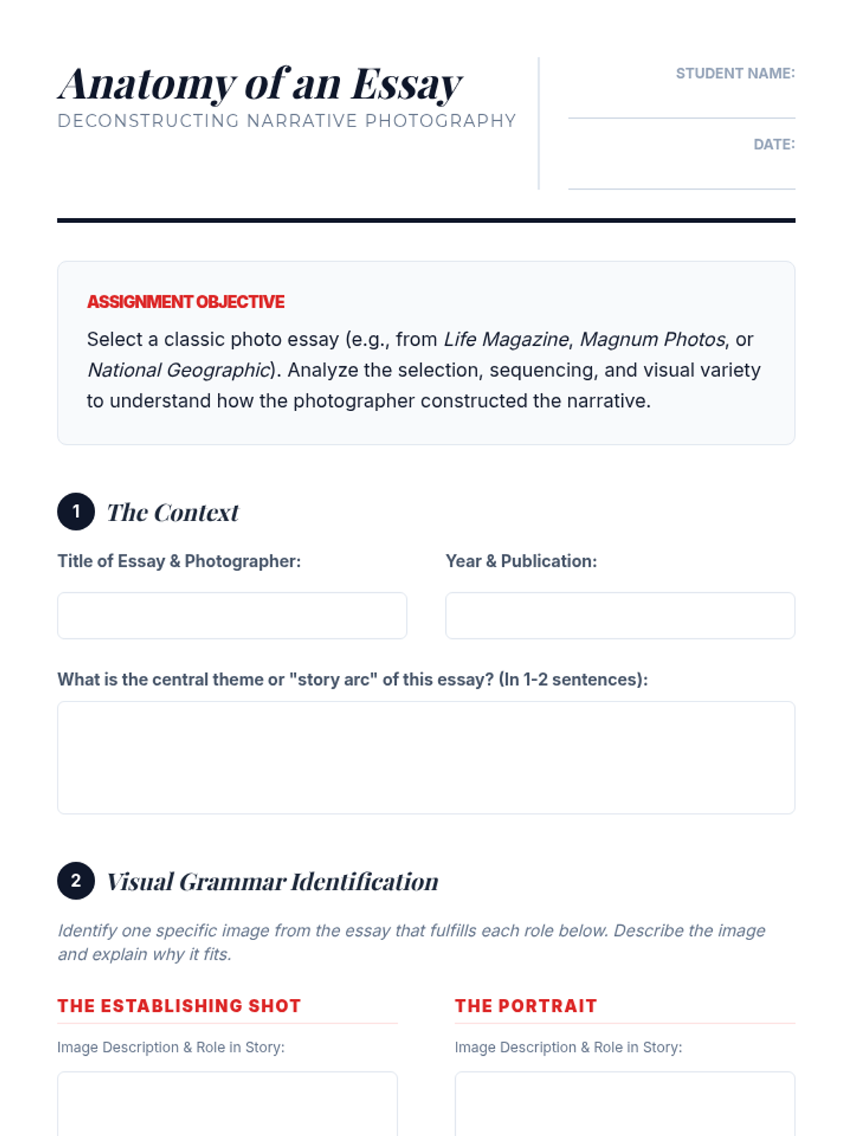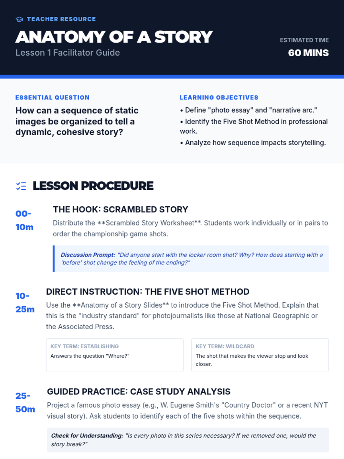 A comprehensive unit for 8th-grade students on the art of the photo essay. Students move from understanding single images to constructing complex visual narratives using shot variety, sequencing, and journalistic ethics.