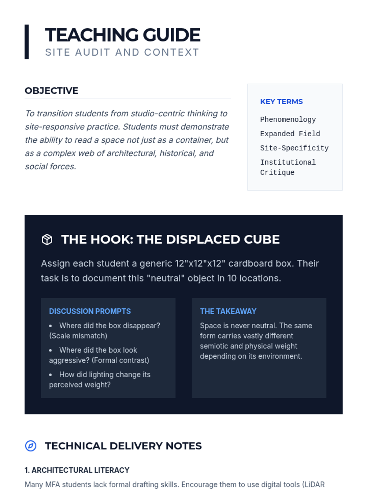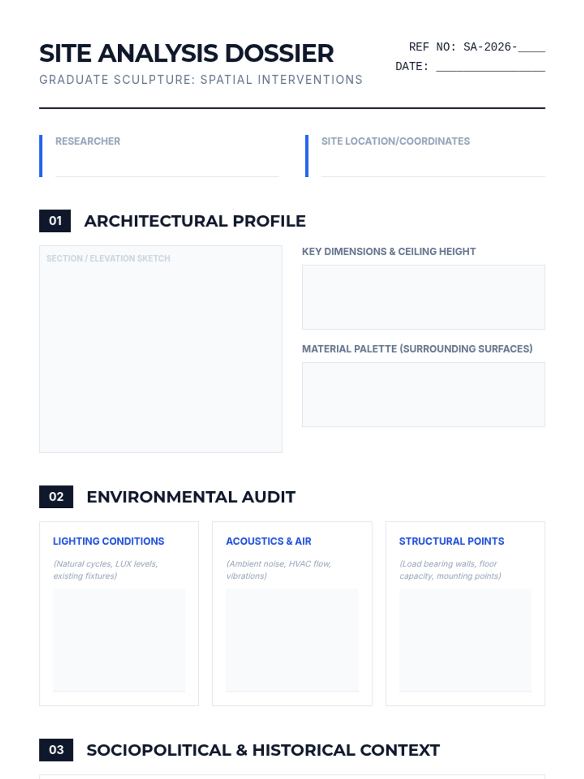 A graduate-level sequence exploring the methodology of site-specific sculpture, focusing on spatial analysis, professional proposal development, phenomenology, and archival documentation.