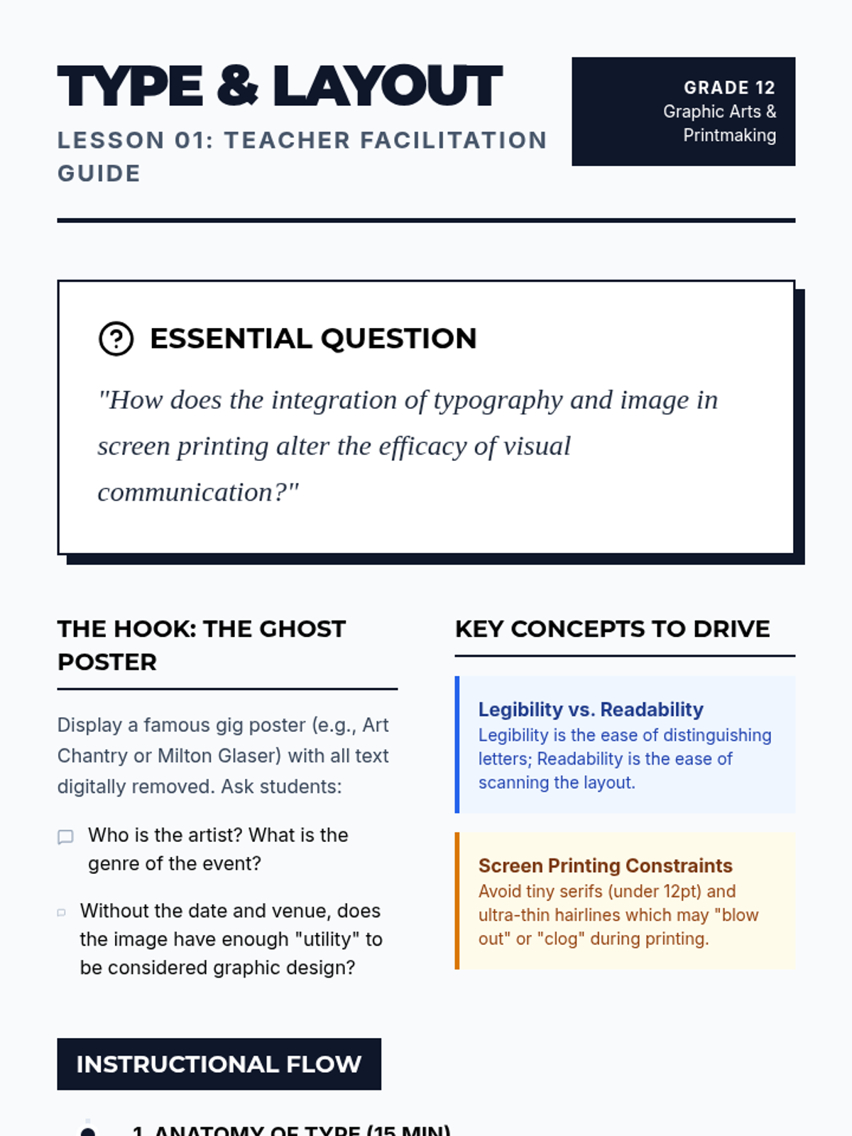 A comprehensive 8th-grade unit bridging traditional printmaking concepts with modern digital graphic design. Students explore typography anatomy, vector illustration, grid-based layouts, and digital color theory to create professional-quality visual communications.
