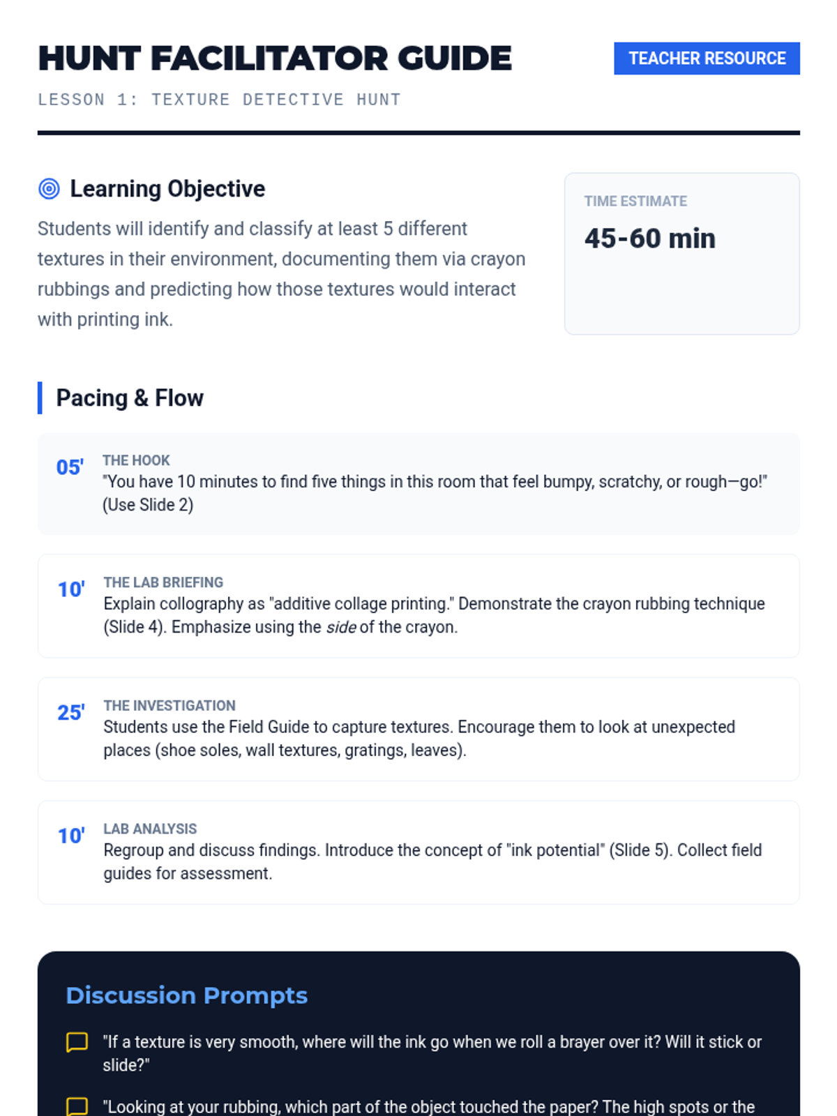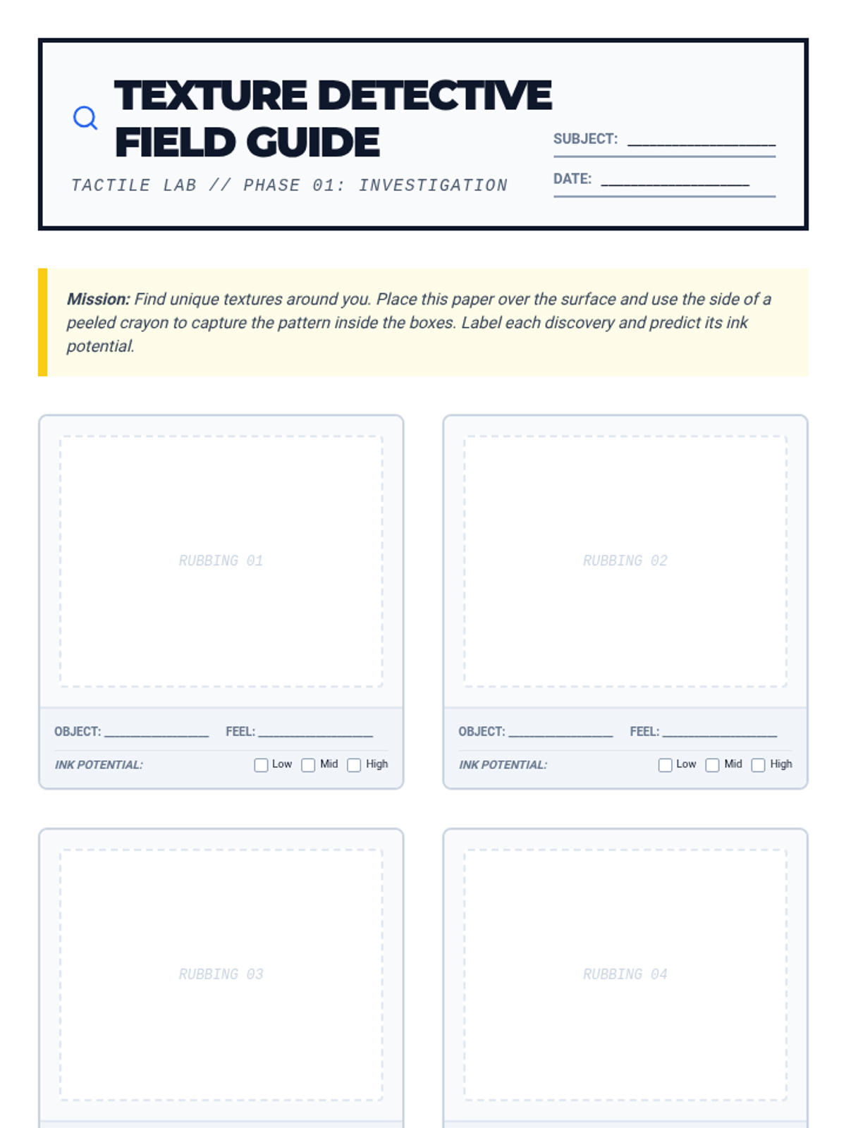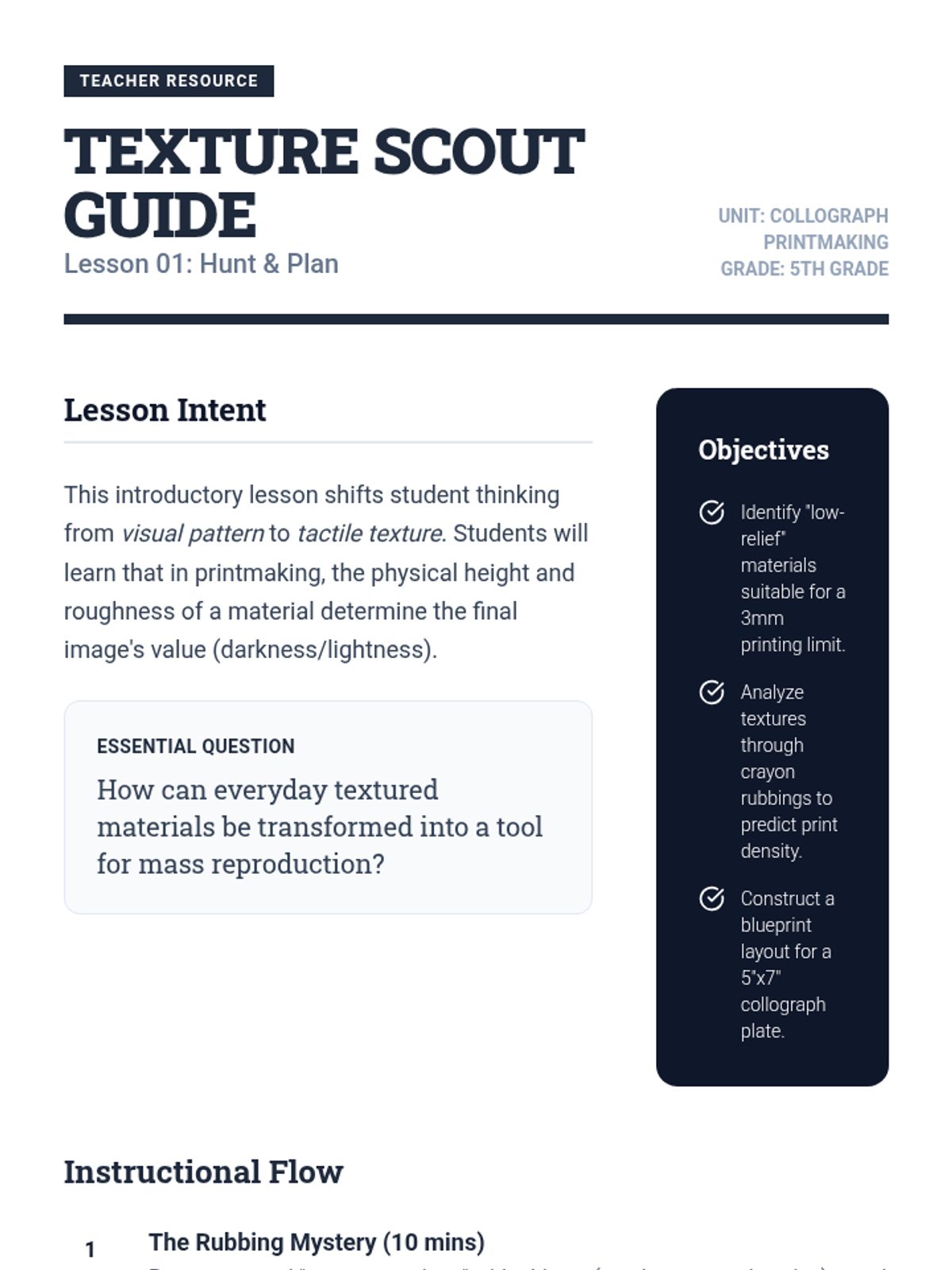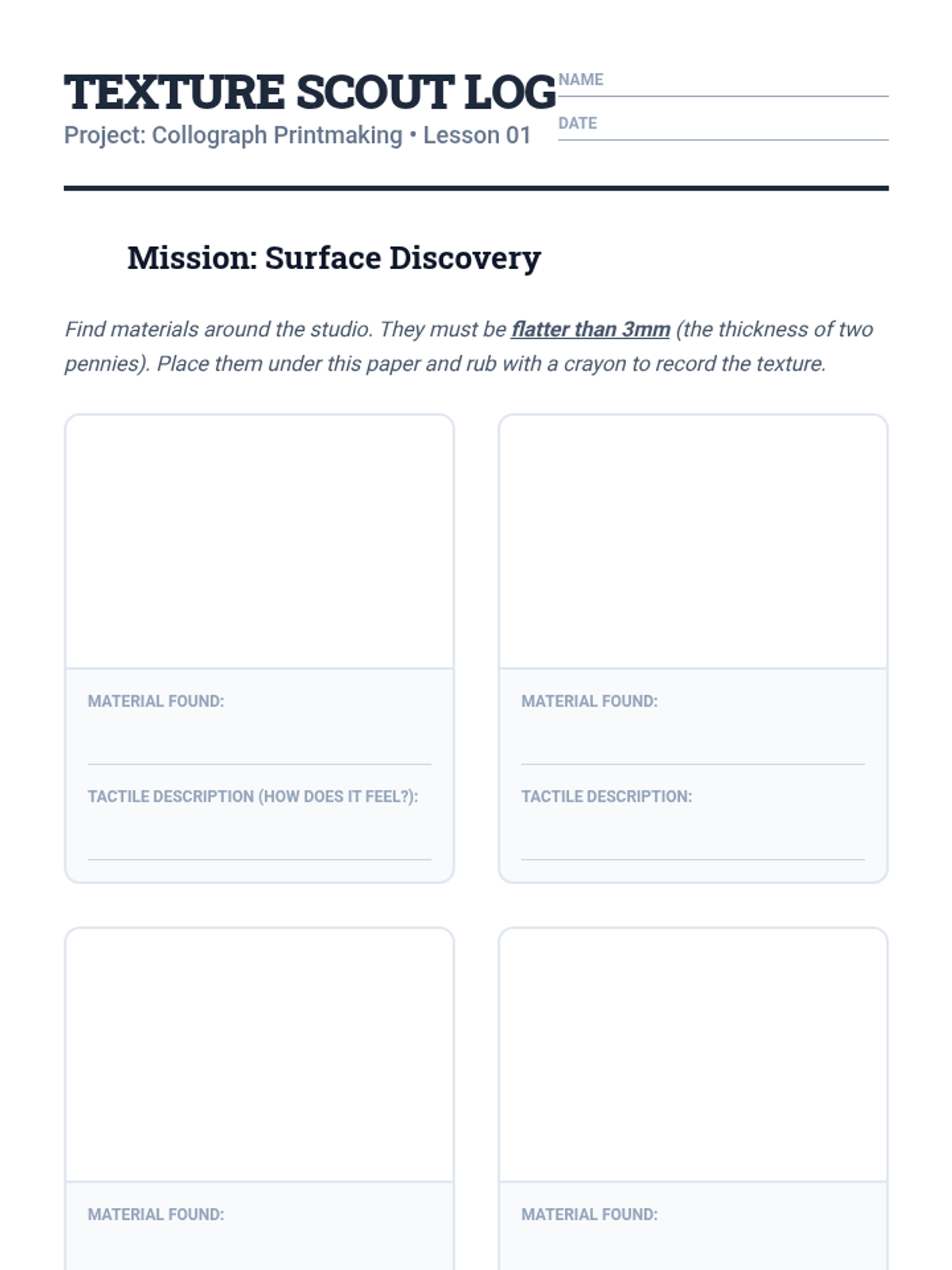 A 4th-grade printmaking unit where students transform found textures into complex printing plates. Through inquiry and experimentation, students explore collography by building, sealing, inking, and pressing tactile 'matrices'.