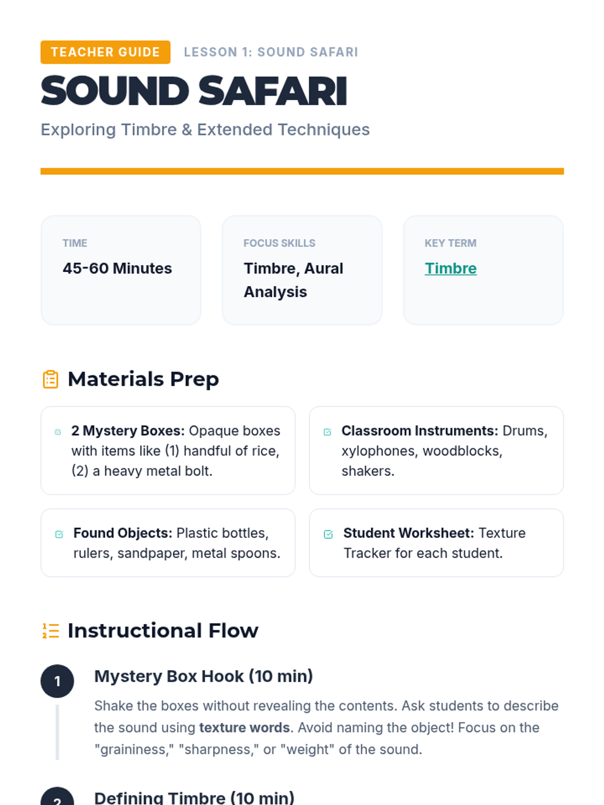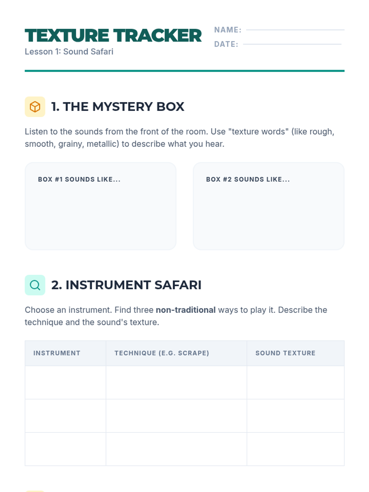 A 5-lesson journey into music composition using graphic notation. Students explore sound textures, invent visual symbols for audio, compose narrative soundscapes, and lead ensembles as conductors.