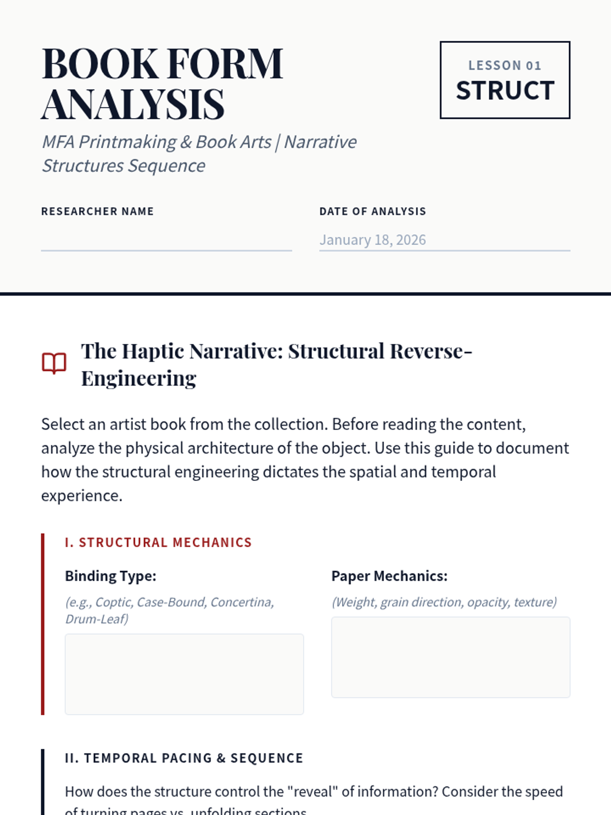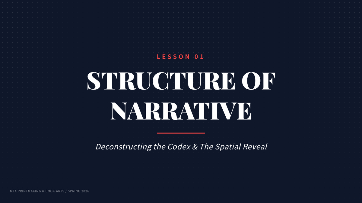 A graduate-level exploration of the artist book, integrating letterpress printing, relief graphics, and structural binding to investigate the relationship between physical form and narrative sequence.
