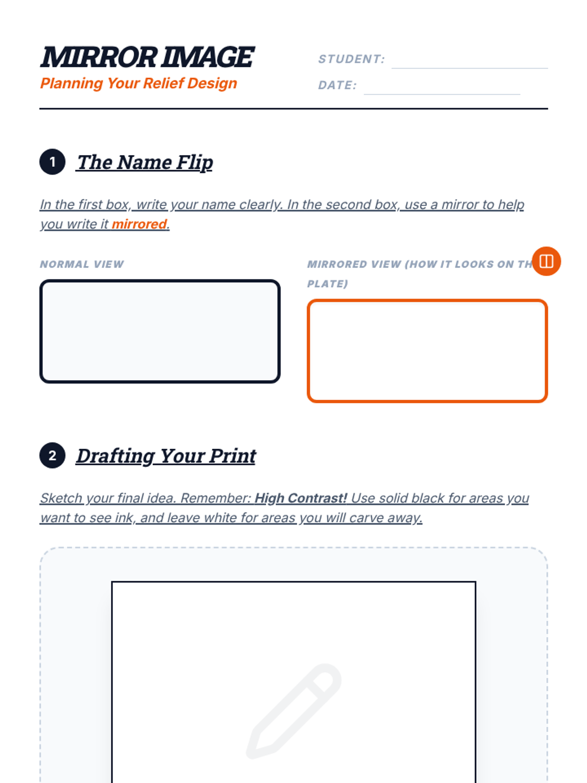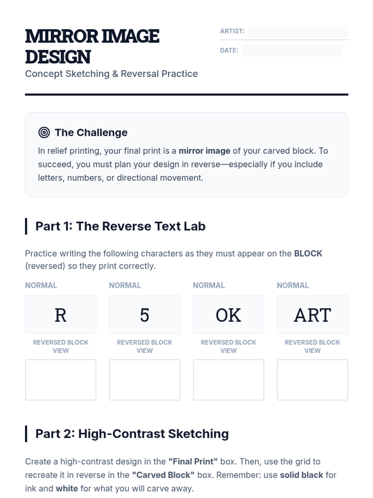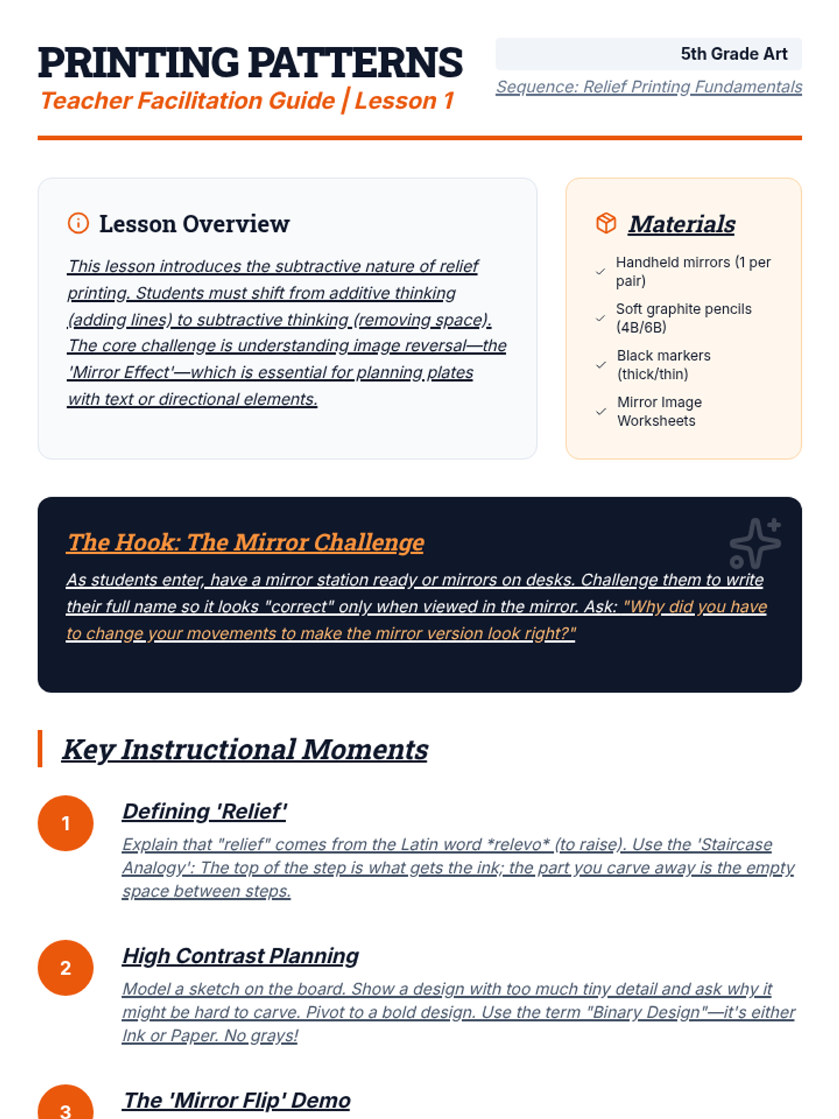 A comprehensive 5th-grade art sequence introducing the subtractive process of relief printing. Students progress from conceptualizing mirrored imagery and carving soft blocks to mastering ink application and producing a numbered edition of prints.