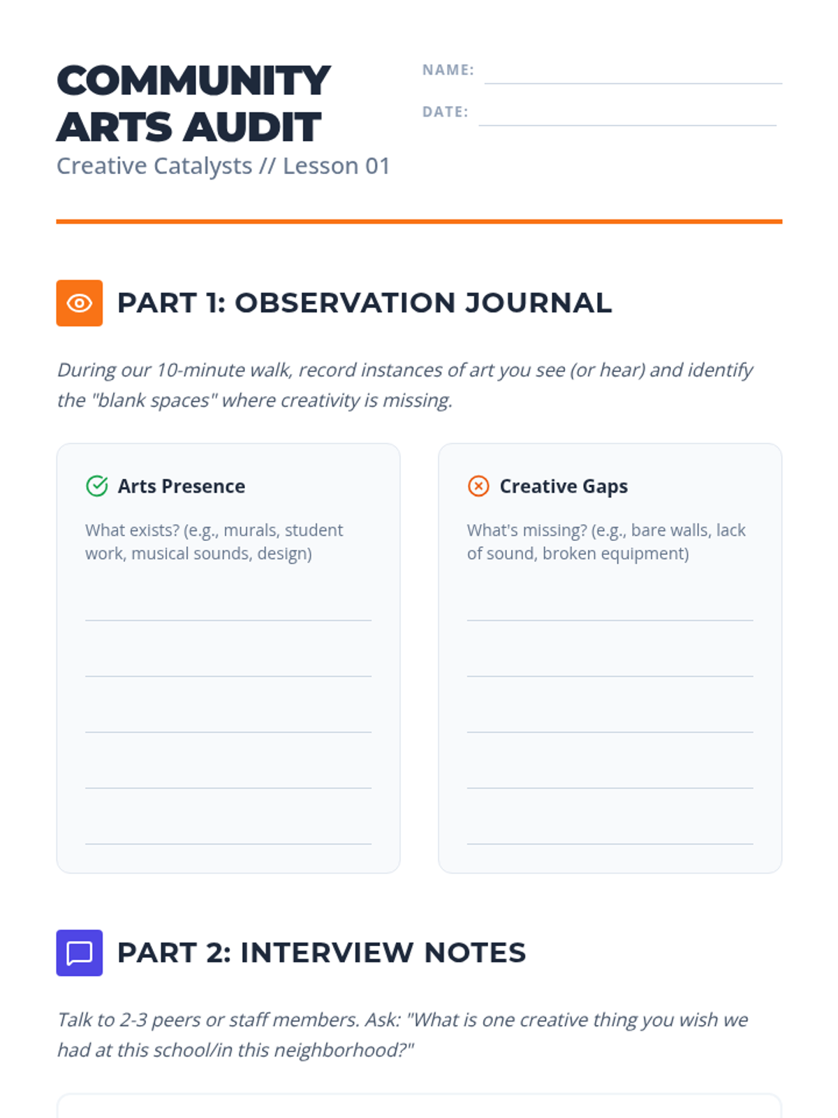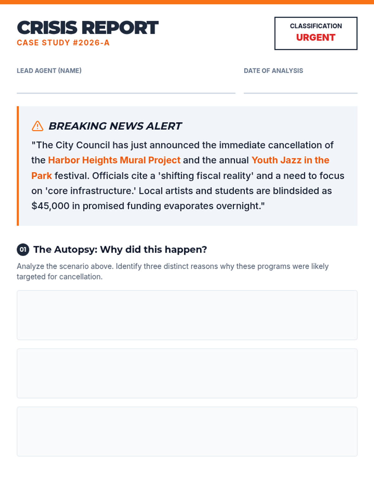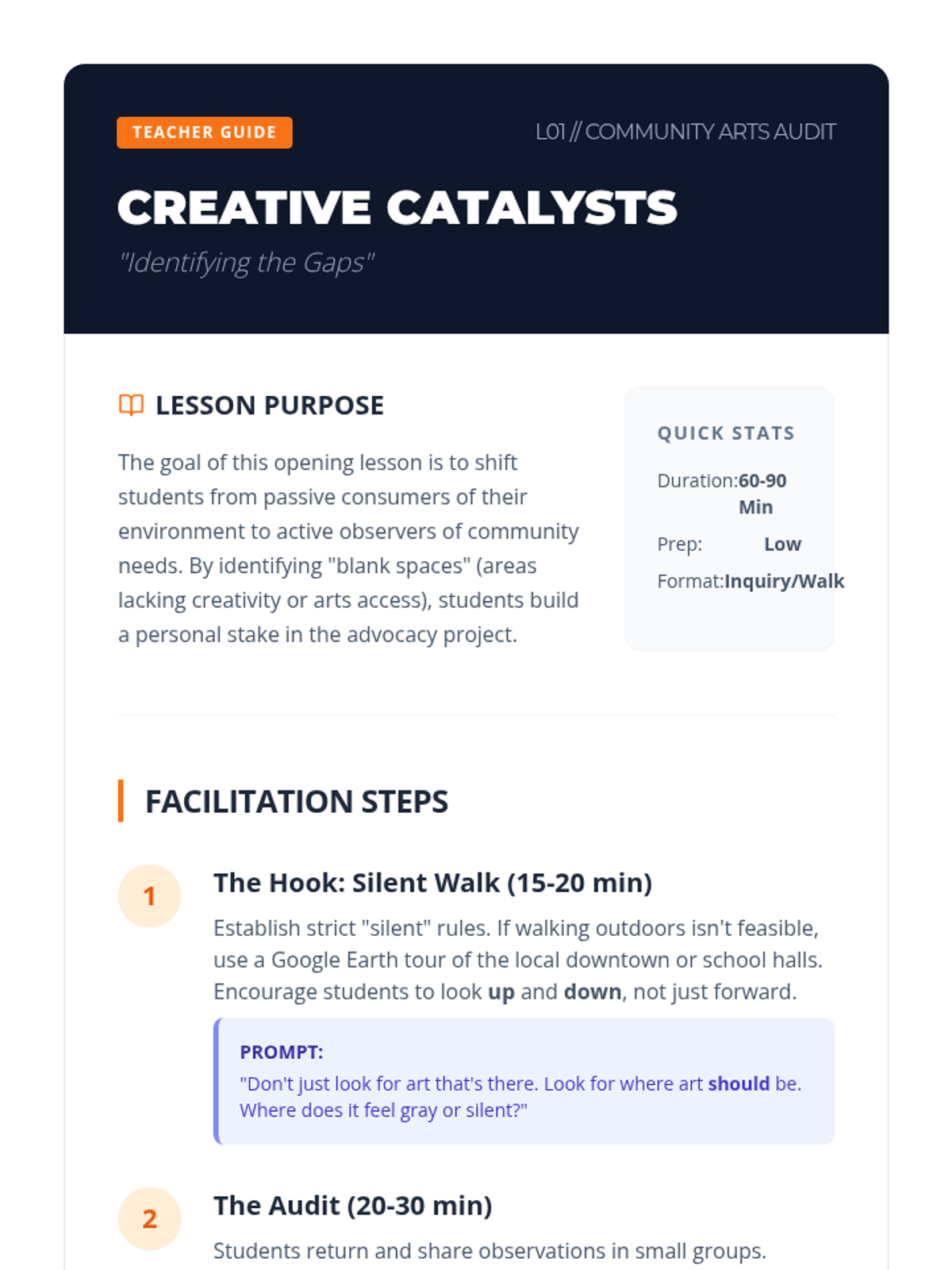A project-based sequence where 7th-grade students act as community organizers to launch an arts advocacy campaign, moving from needs assessment to a final pitch.