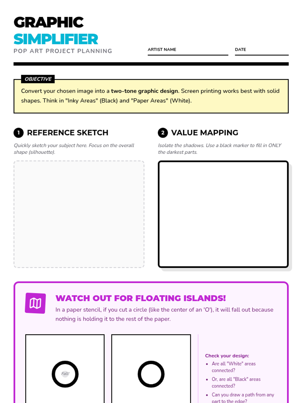 A project-based unit where 6th-grade students explore the intersection of Pop Art and graphic design. They learn stencil-based screen printing techniques to produce bold, reproducible icons on paper or fabric.