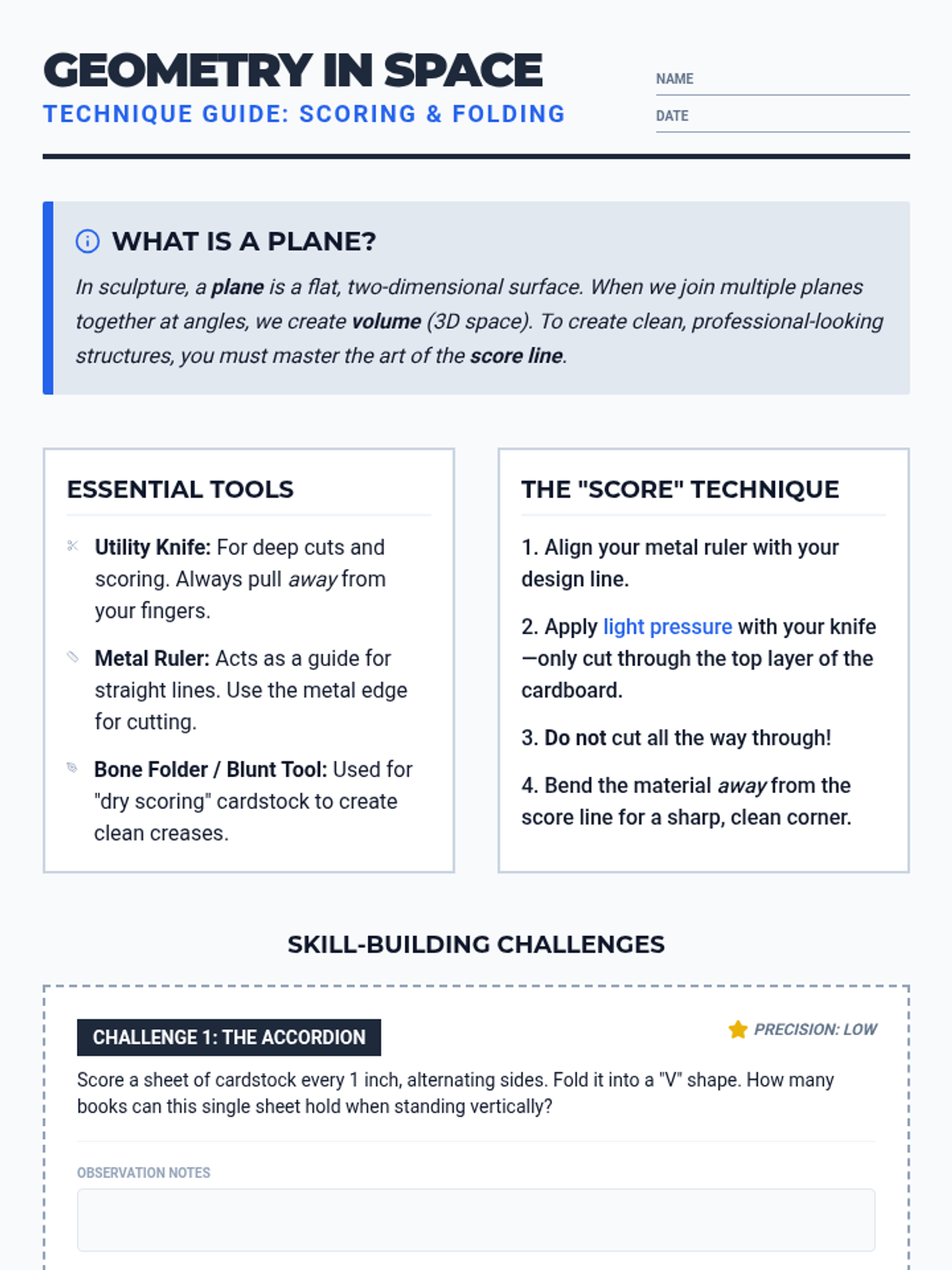 A comprehensive 9th-grade sculpture sequence focusing on planar construction using cardboard. Students transition from 2D geometric shapes to 3D volumes through scoring, folding, and slotting, culminating in a light-and-shadow-focused abstract sculpture.