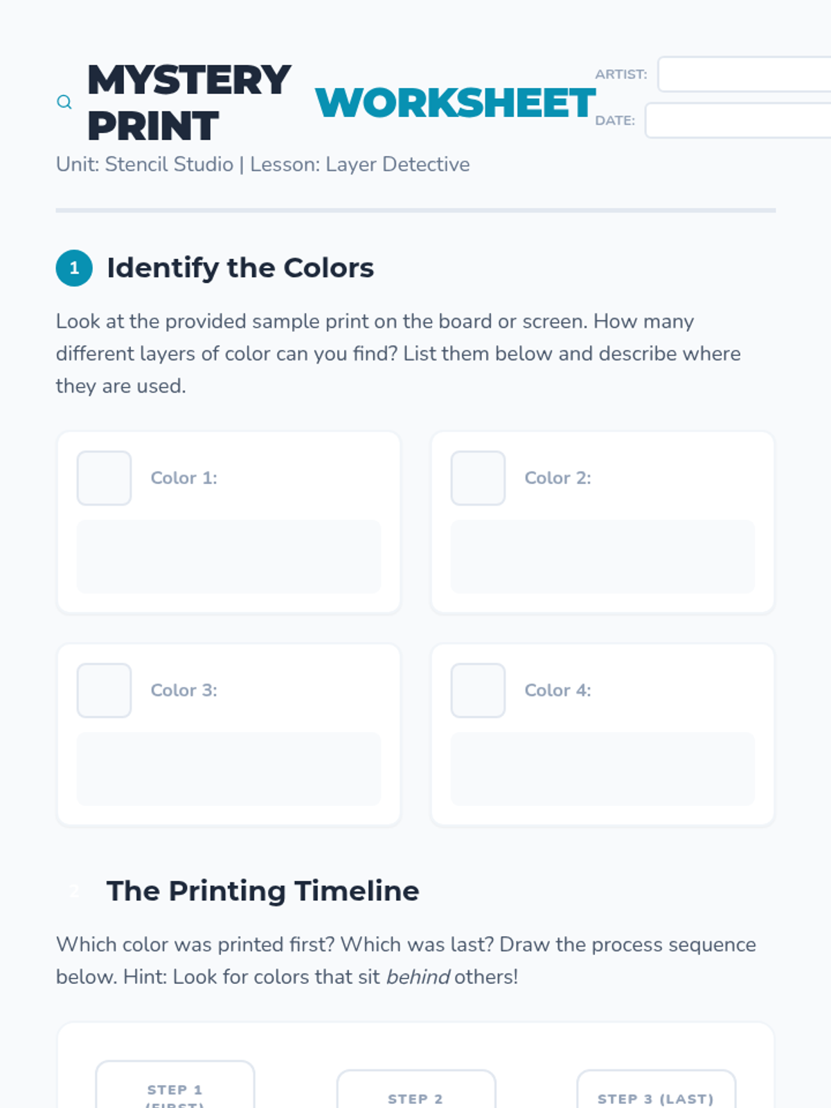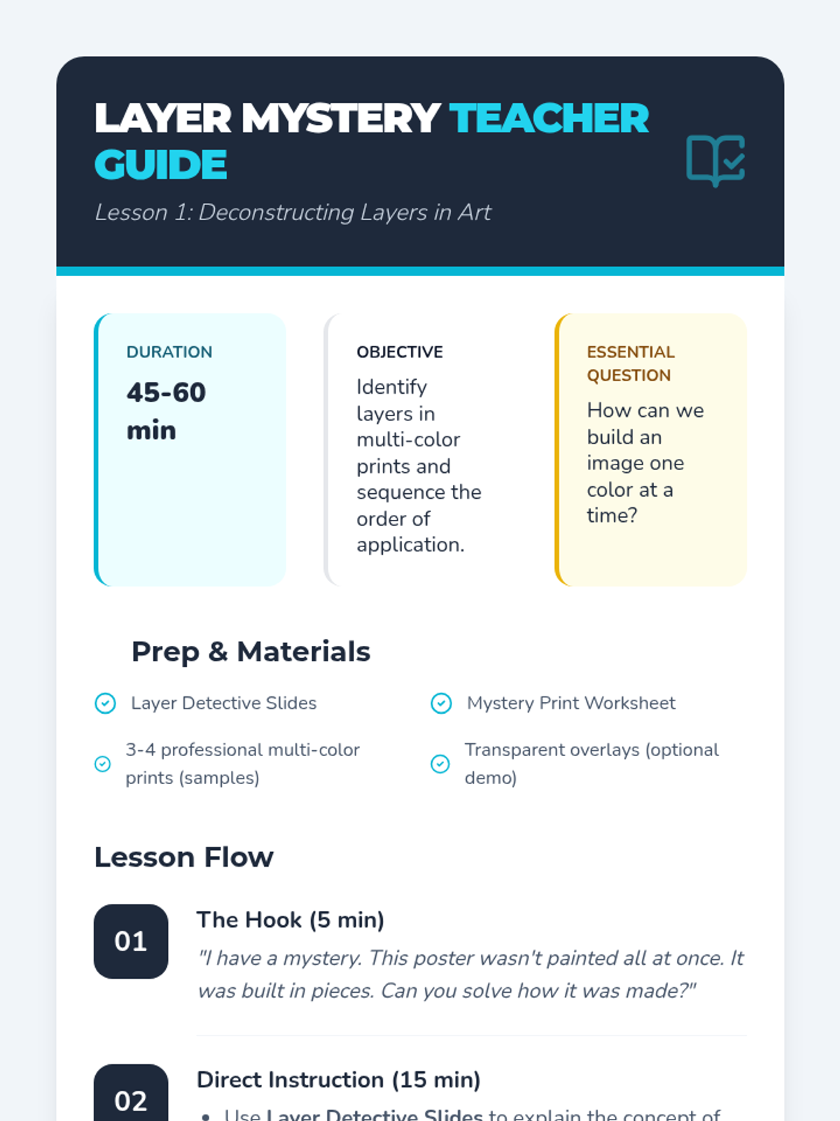 An inquiry-based art sequence where 4th graders explore multi-layer stencil printing, focusing on color theory, registration, and visual deconstruction. Students move from analyzing professional prints to creating their own multi-layered color compositions.