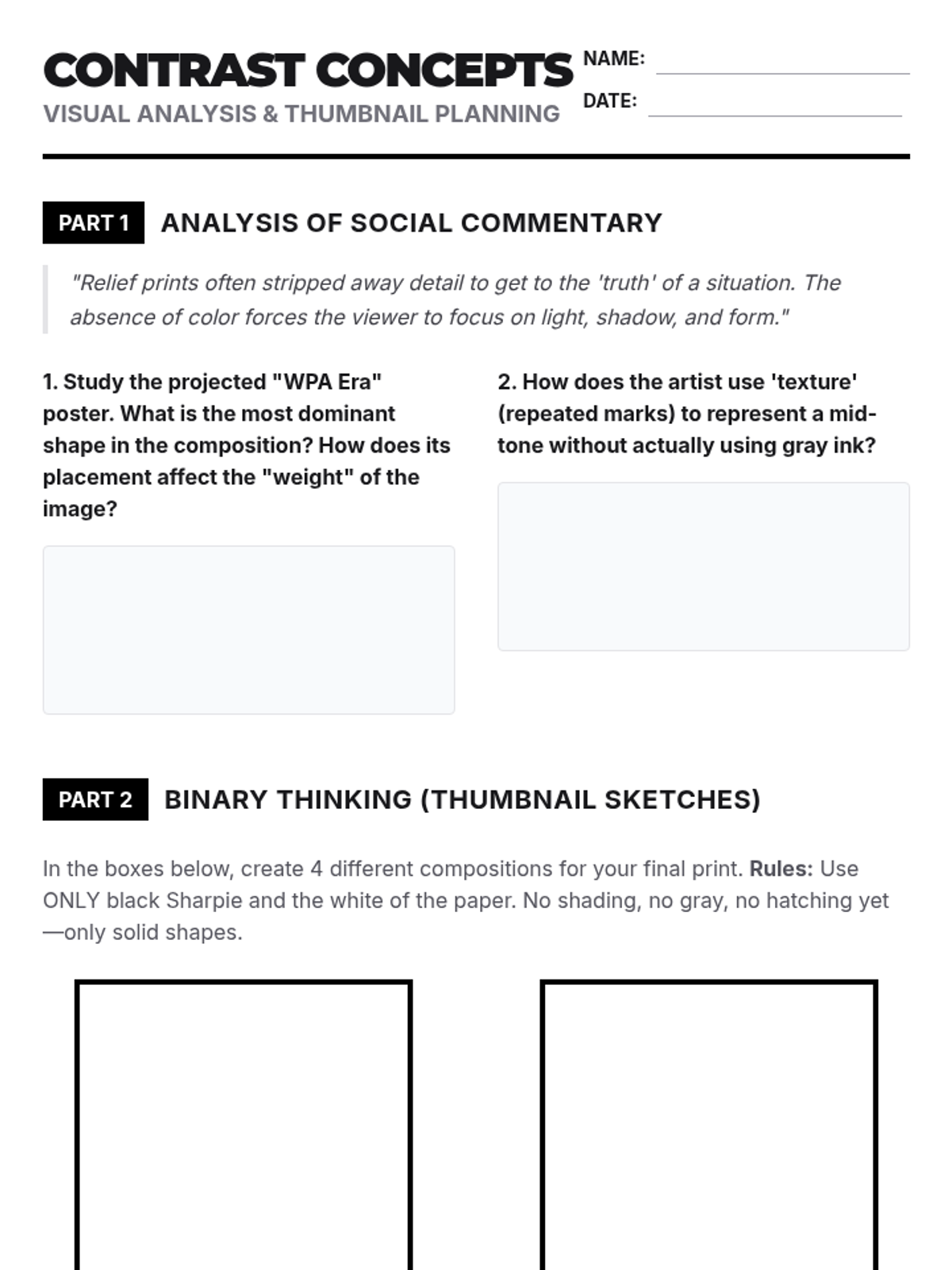 A comprehensive 11th-grade art sequence focusing on the technical and conceptual aspects of relief printmaking, from historical analysis to professional editioning.