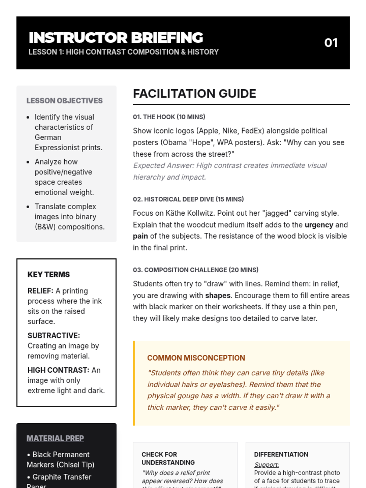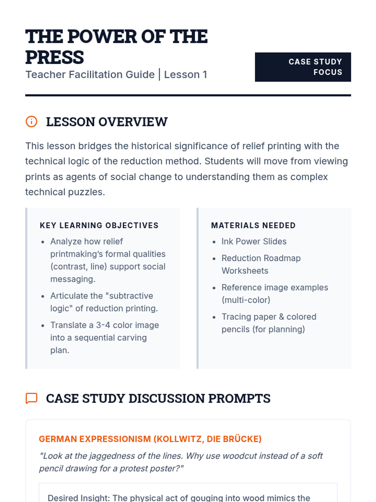 A comprehensive 8th-grade sequence on relief printmaking, covering design reversal, carving safety, ink application, and the reduction printing process. Students move from basic concepts to producing a professional multi-color edition.