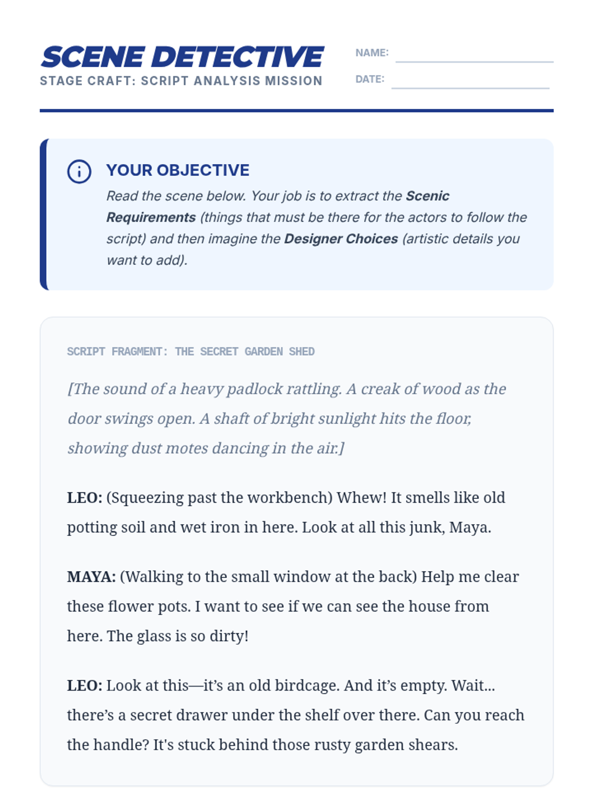 A project-based unit where 3rd-grade students learn the art of set design by transforming story descriptions into miniature 3D scale models. Students analyze text, draft layouts, and construct shoebox dioramas to communicate time, place, and mood.