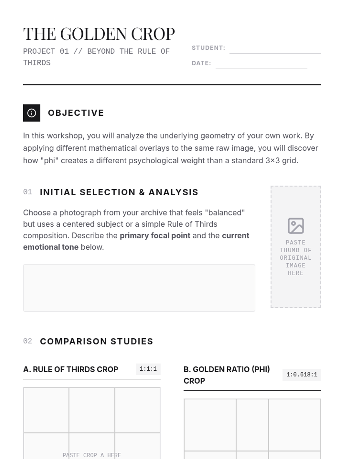 This advanced sequence for graduate students explores the deconstruction of classical composition through dynamic symmetry, edge tension, non-Euclidean perspective, and visual hierarchy. Students will move from rigid geometric analysis to 'anti-compositional' strategies to create contemporary, tension-filled imagery.