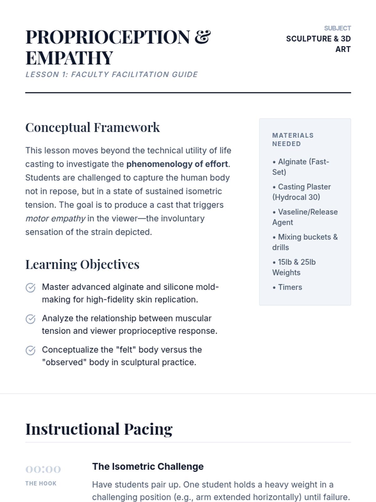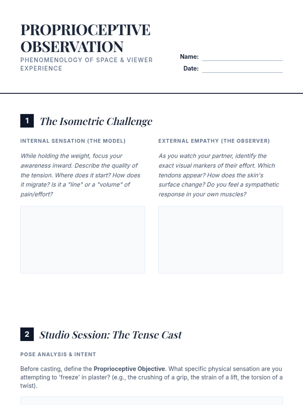 This advanced sculptural sequence for graduate students explores the intersection of phenomenology and three-dimensional form. Students investigate proprioception, haptic perception, and the physical relationship between the viewer and the sculptural object through technical mastery of life casting, armature construction, and surface manipulation.