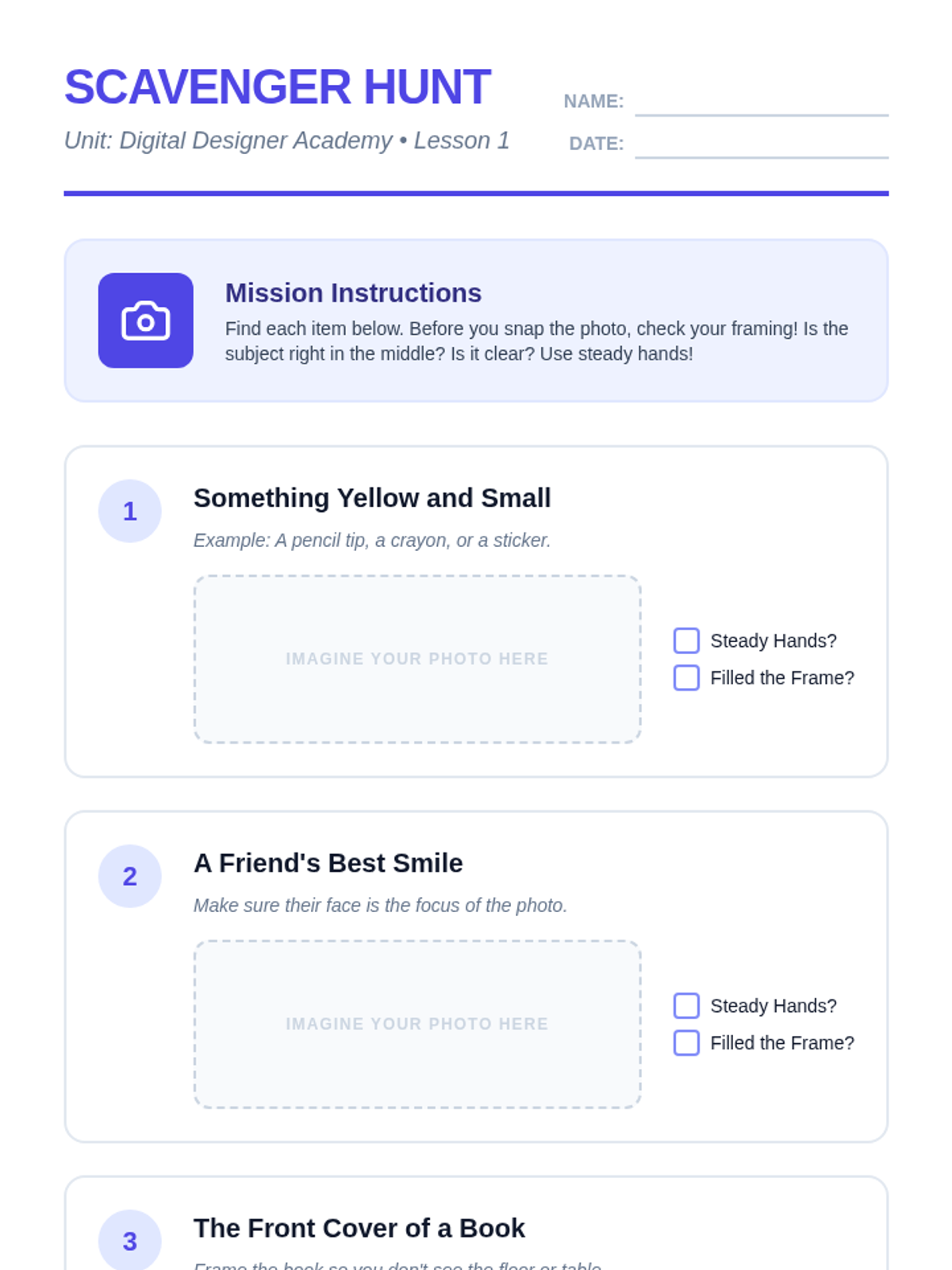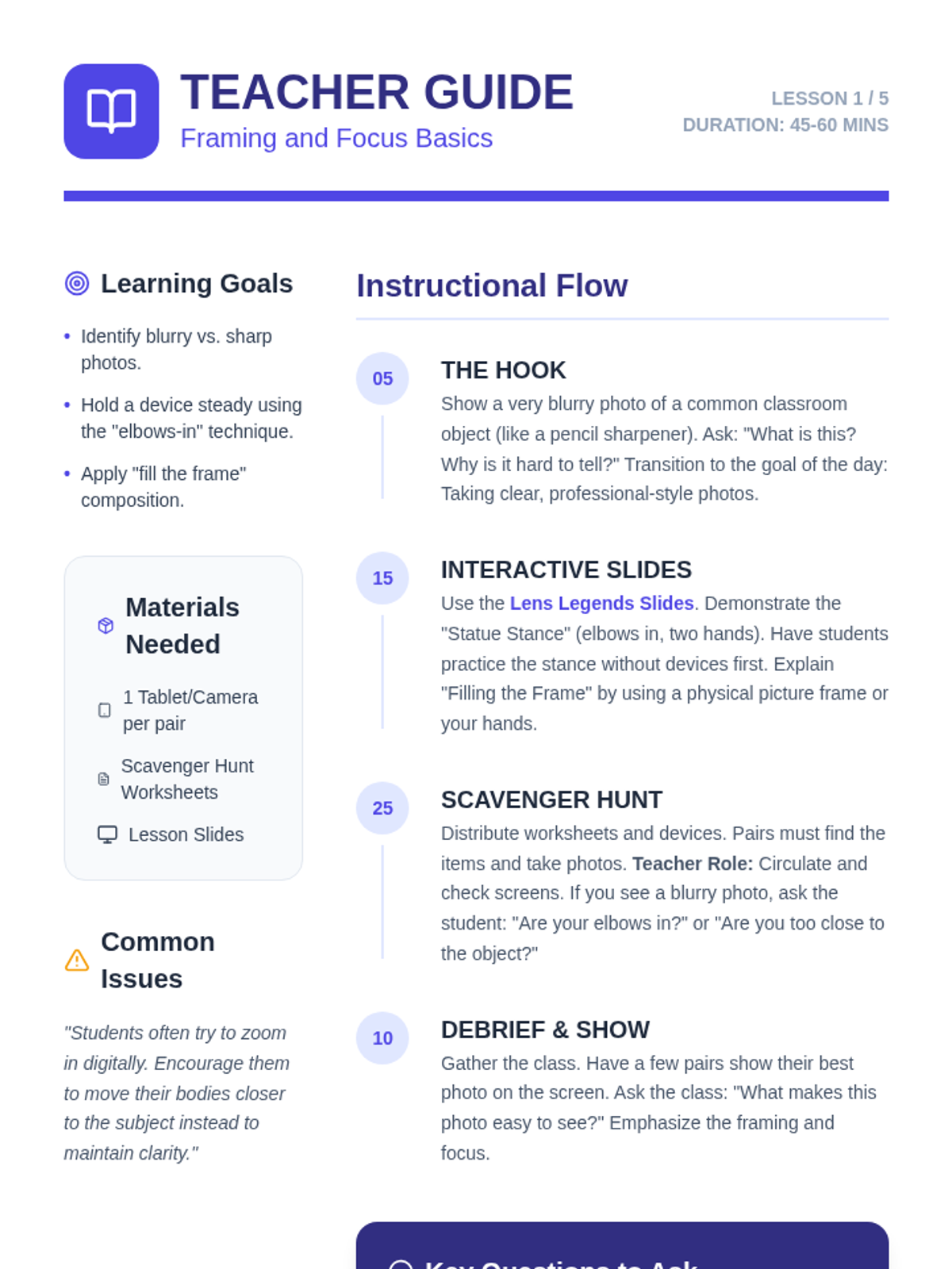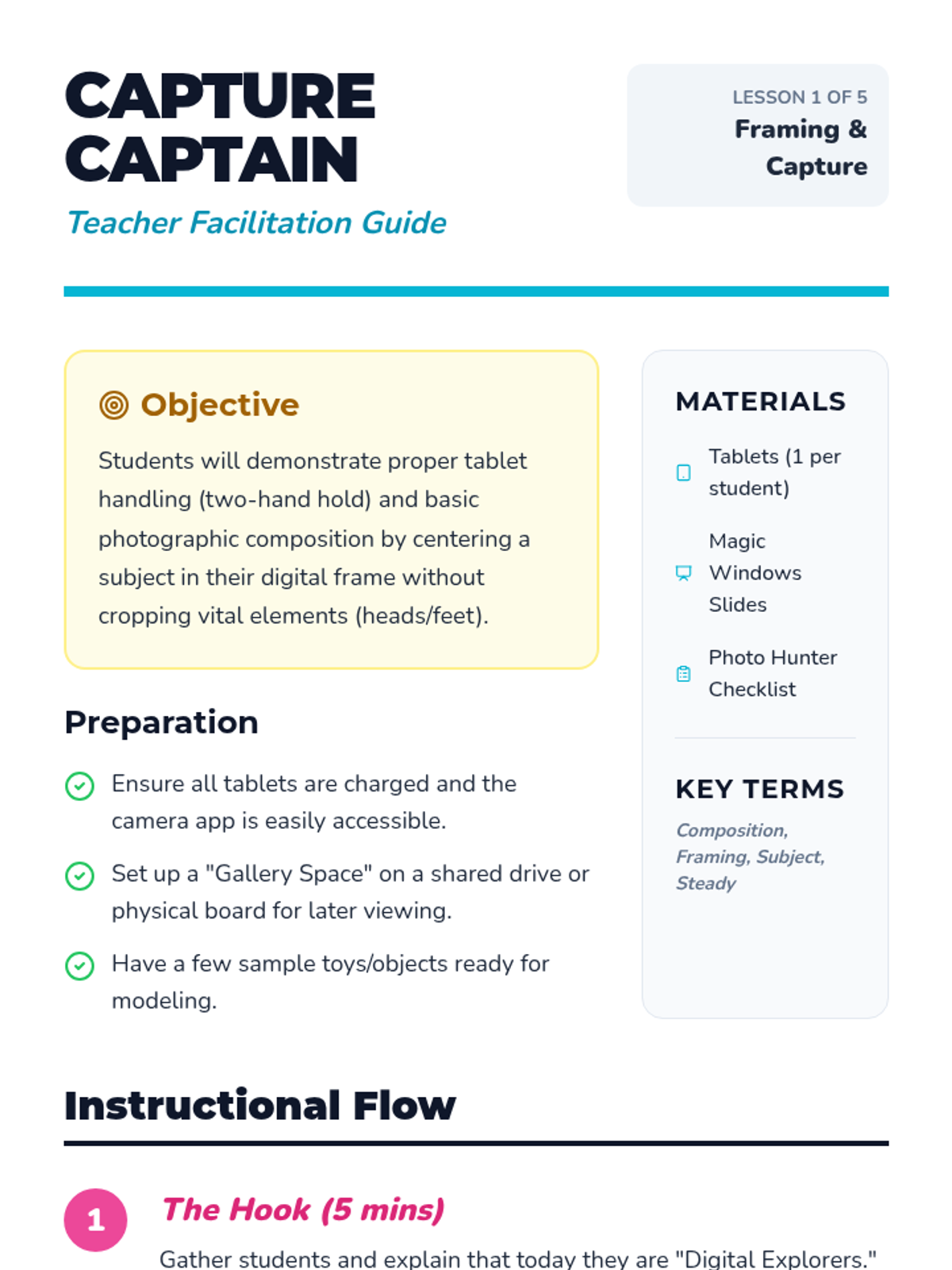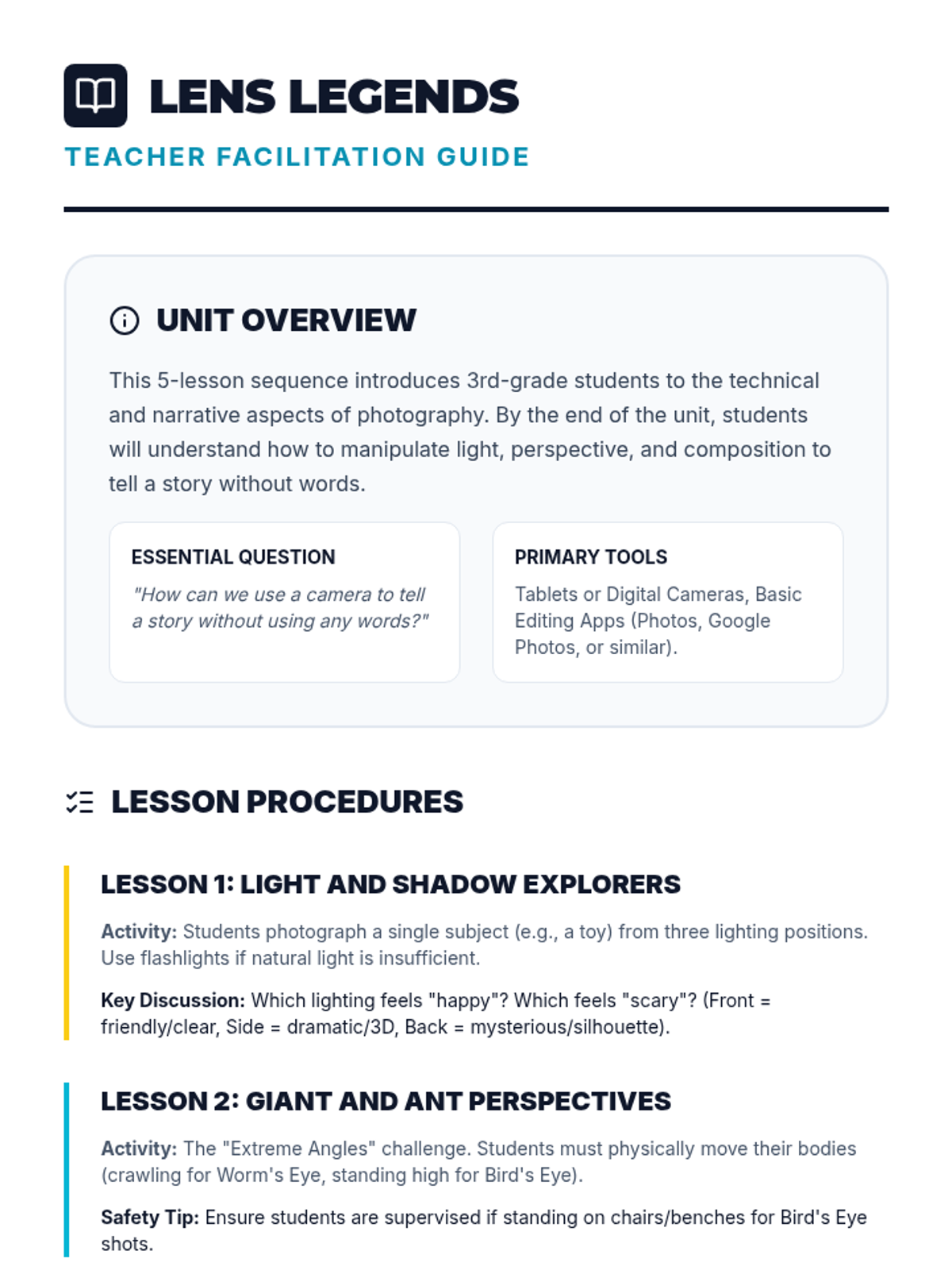 This sequence introduces 3rd-grade students to digital photography basics, focusing on light, composition, and visual storytelling. Students will move from learning about light and shadow to mastering angles and the rule of thirds, ultimately creating their own photo essay.