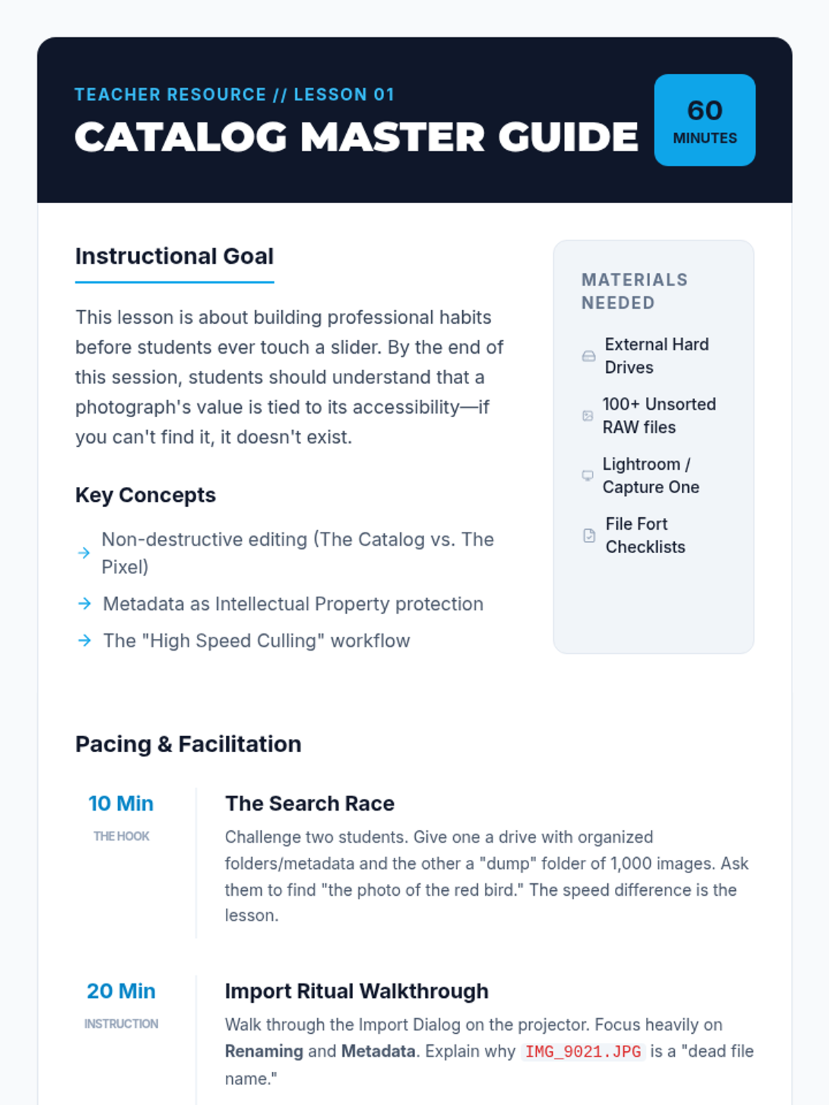 A comprehensive sequence for 11th-grade photography students focusing on the digital darkroom. This unit covers everything from asset management and RAW processing to advanced masking, ethical retouching, and cinematic color grading.