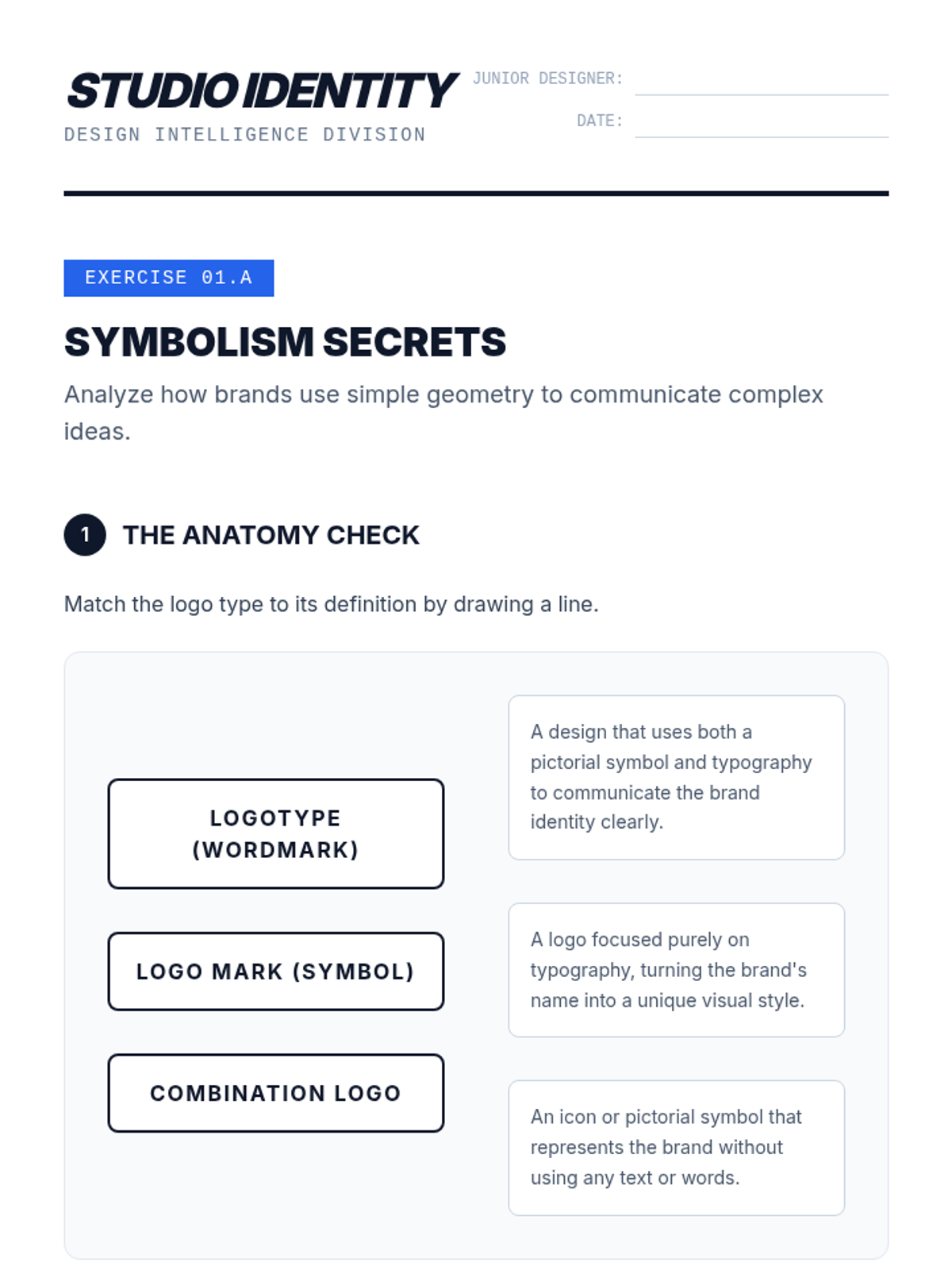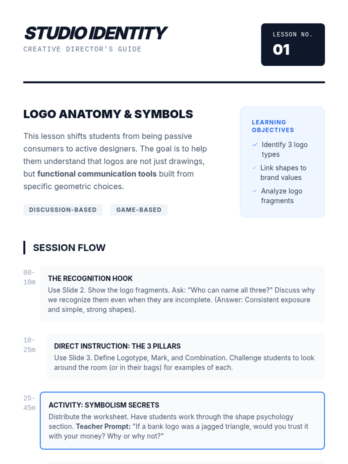 A comprehensive graphic design simulation where students act as a design agency to develop a full brand identity. They progress from analyzing logo symbolism and interpreting client briefs to digital vectorization and presenting a professional brand style guide.
