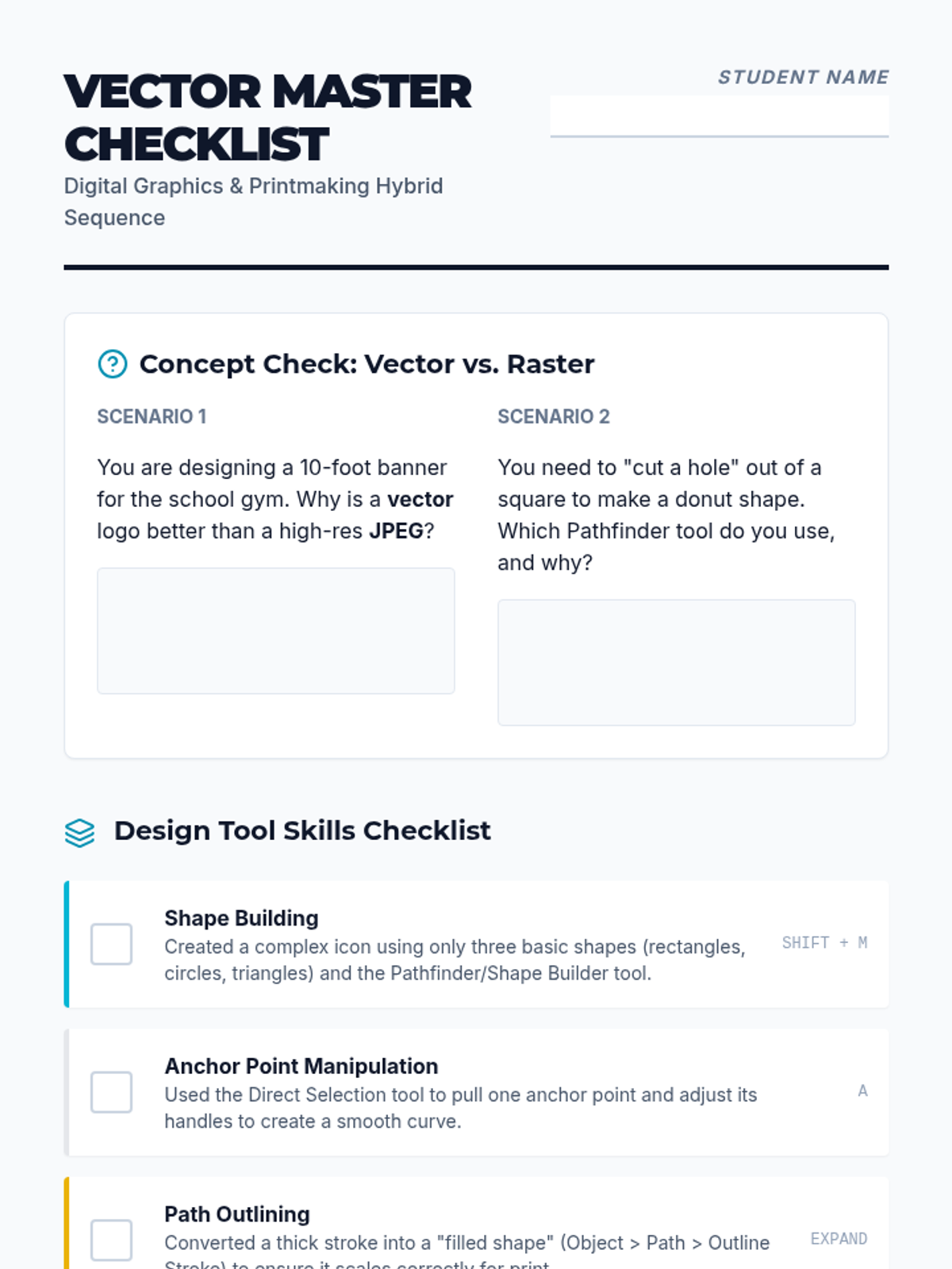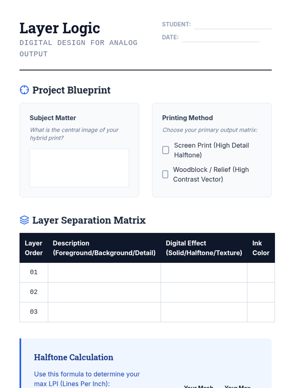 A high school sequence exploring the intersection of digital design and traditional printmaking. Students learn to bridge vector precision with analog texture through zine production and professional practice.