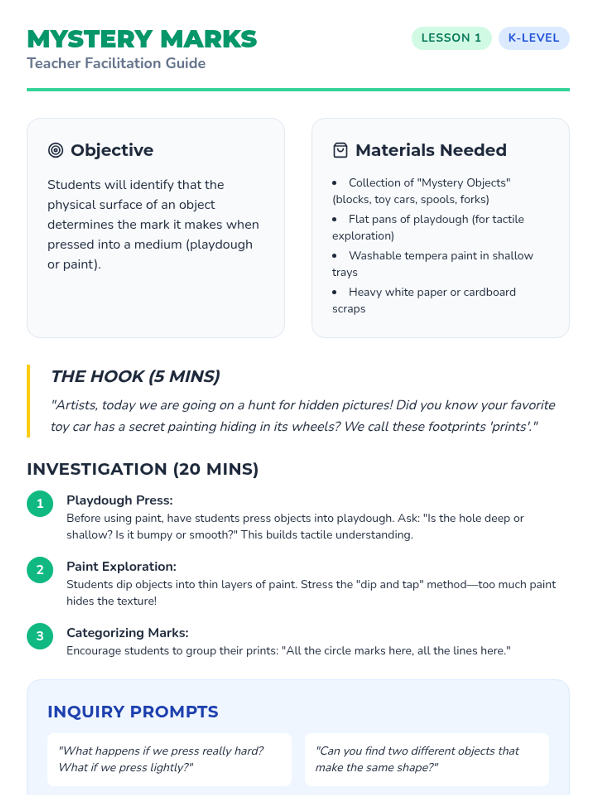 A Kindergarten sequence introducing the fundamentals of relief printing. Students explore texture, create their own stamps, and learn to make repeating patterns through hands-on exploration.