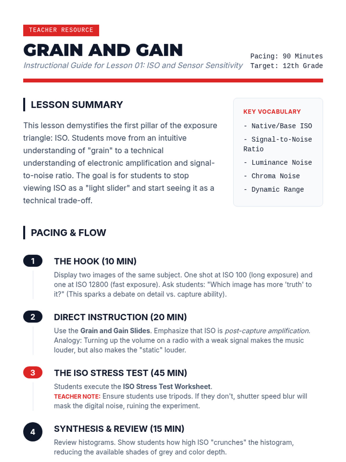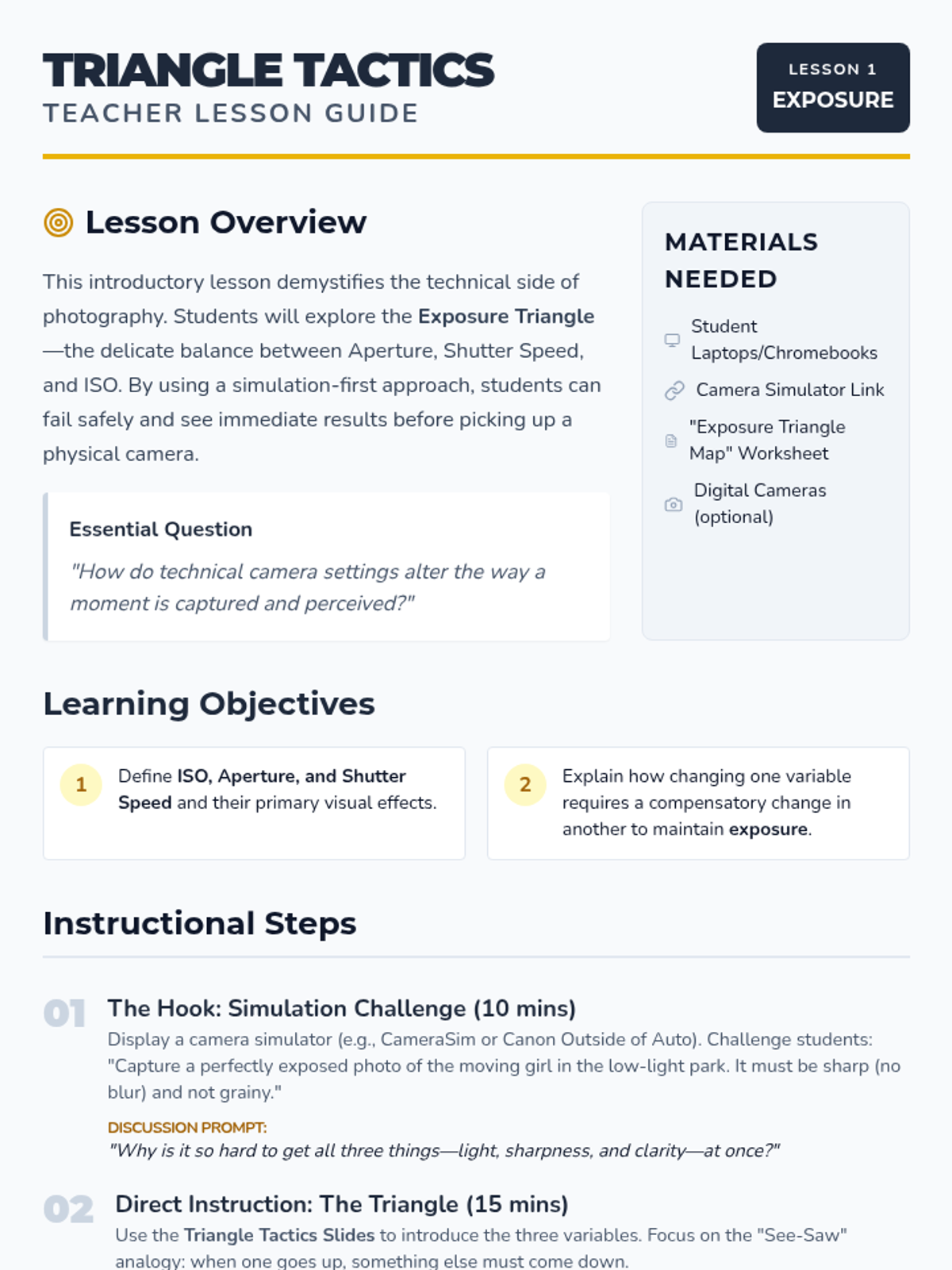 A comprehensive 5-lesson unit for 8th-grade photography students, focusing on the technical mastery of the exposure triangle (ISO, aperture, and shutter speed). Students progress from conceptual understanding to manual mode proficiency through simulations, experiments, and creative challenges.