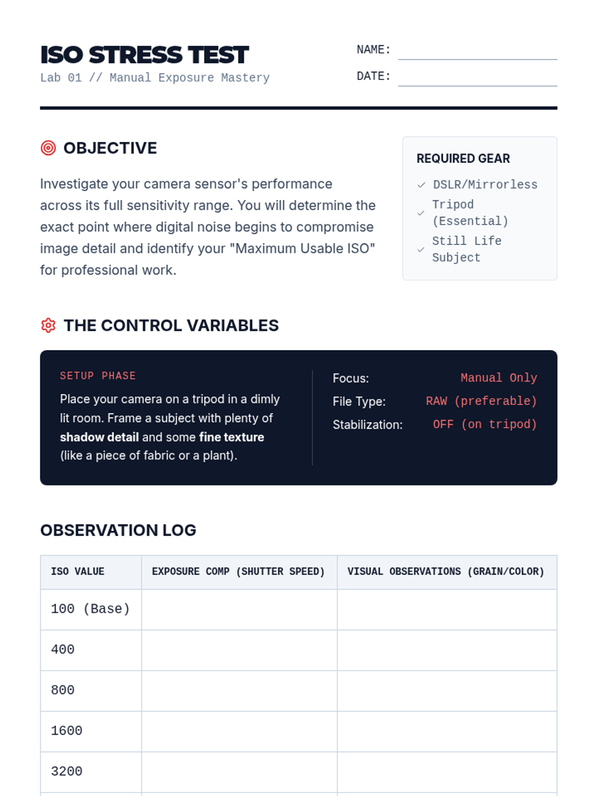 A technical and creative exploration of manual camera controls for 12th-grade photography students, focusing on the exposure triangle (ISO, Aperture, Shutter Speed) and digital file formats.