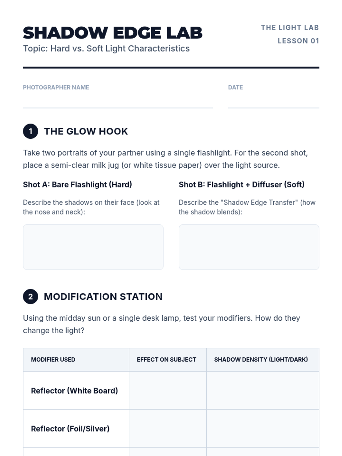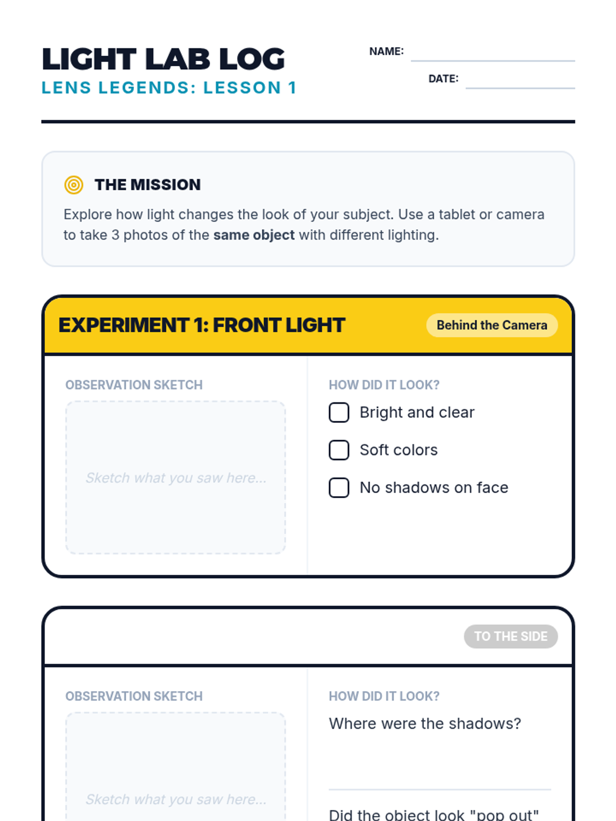 This 8th-grade photography sequence explores how the quality, direction, and color of light influence mood and dimensionality. Students progress from basic light quality to professional portrait patterns and conceptual lighting design.