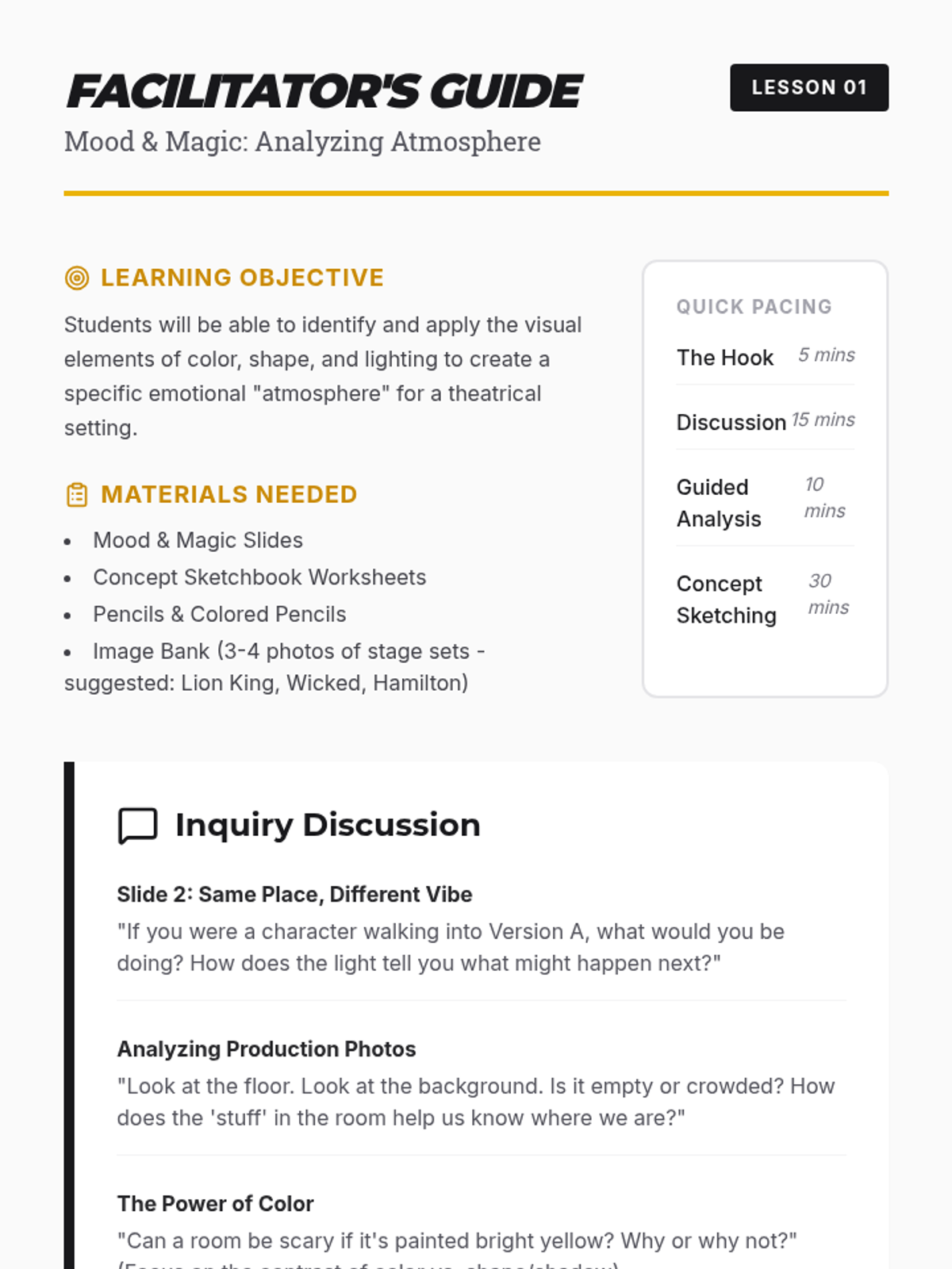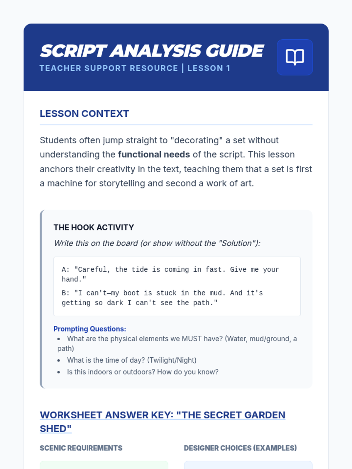 Students step into the shoes of a set designer to transform a written script into a physical world through script analysis, floor planning, mood boards, and 3D model construction. The sequence emphasizes how visual choices in color, texture, and space support the storytelling.