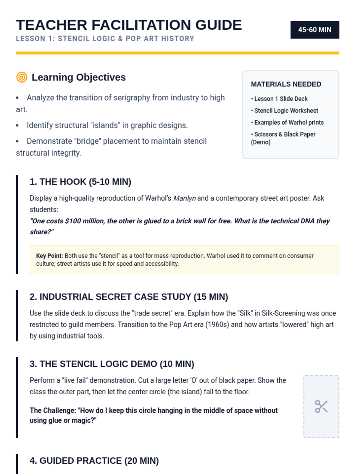 A comprehensive 10th-grade course on screen printing, covering its historical roots, technical darkroom processes, and professional production workflows. Students transform graphic designs into mass-produced art.