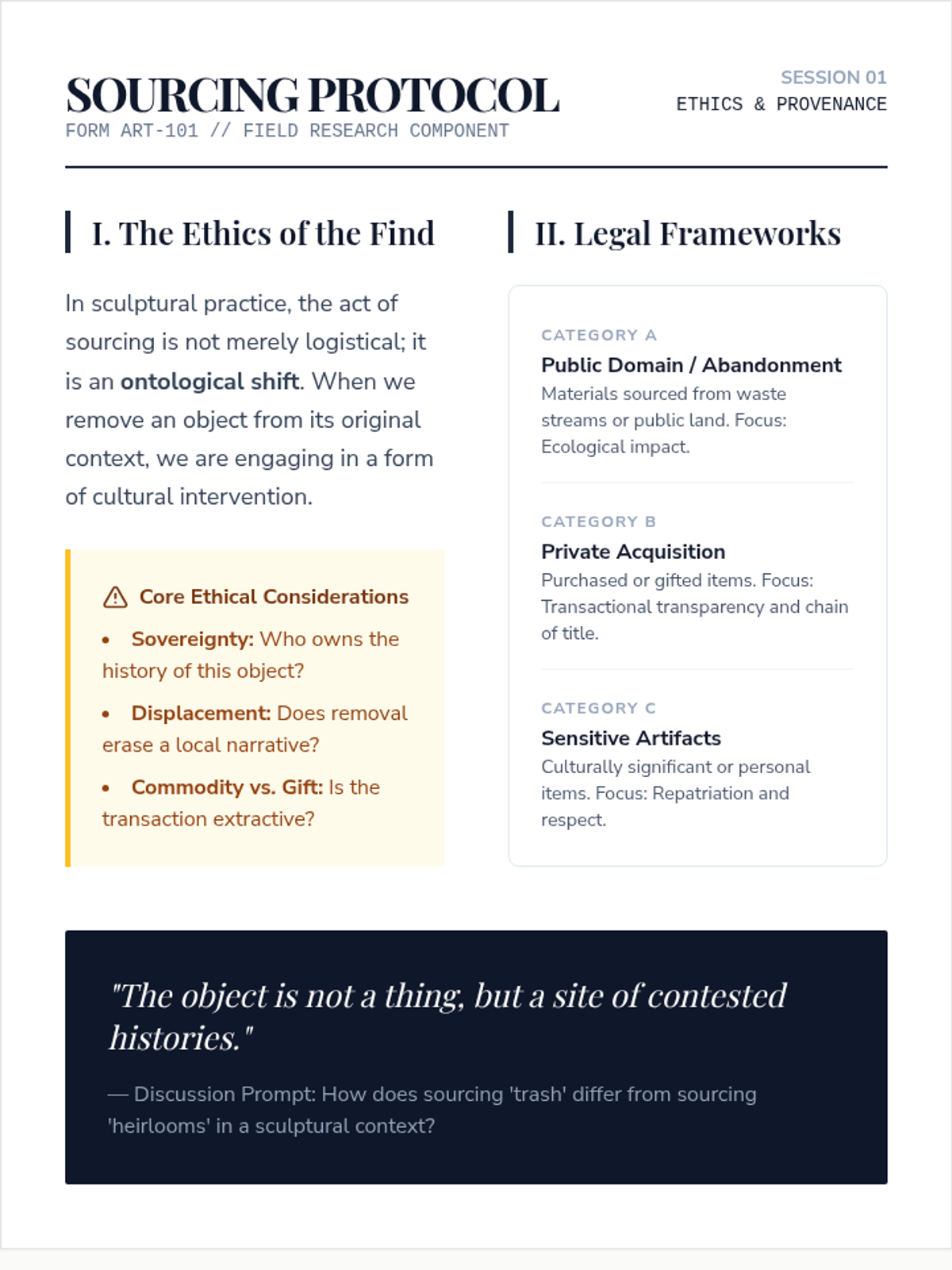 A graduate-level investigation into the intersection of sculpture, archival research, and historiography, focusing on the ethical sourcing and conceptual recontextualization of found objects.