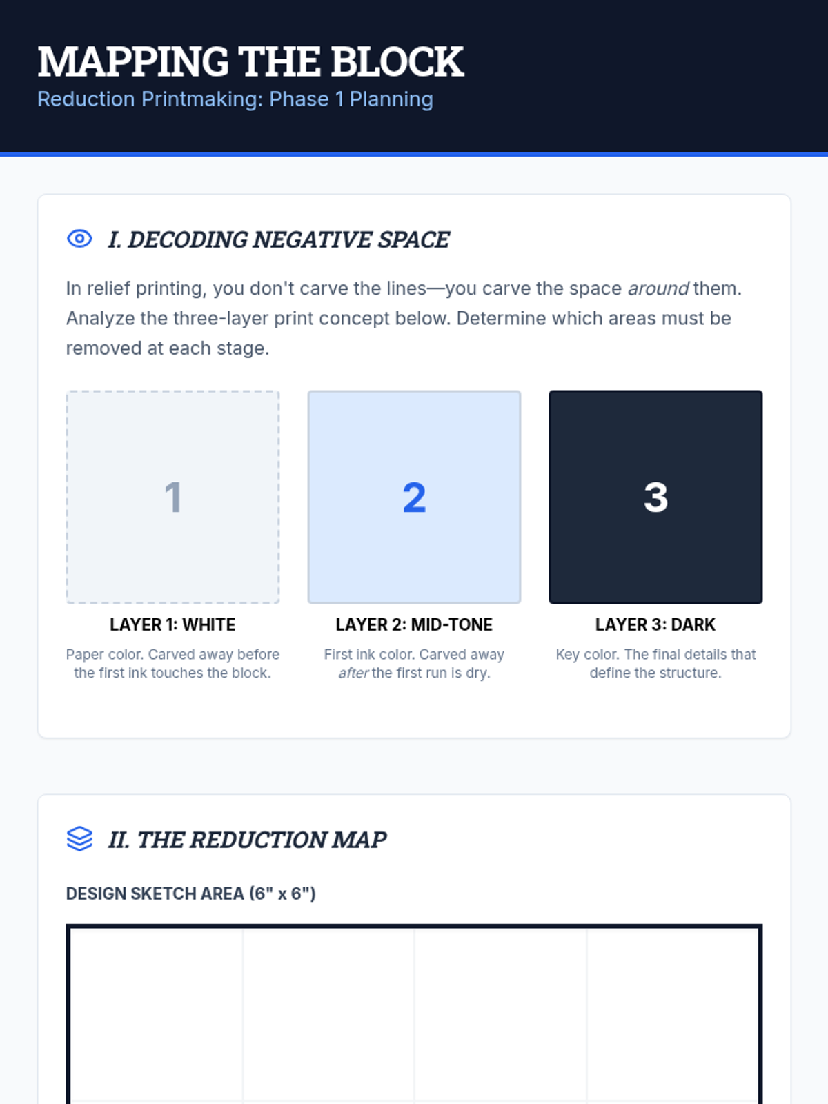 A comprehensive workshop sequence on reduction linocut printing. Students master the art of the 'suicide block' through negative space analysis, tool safety, registration systems, and multi-layer ink application.