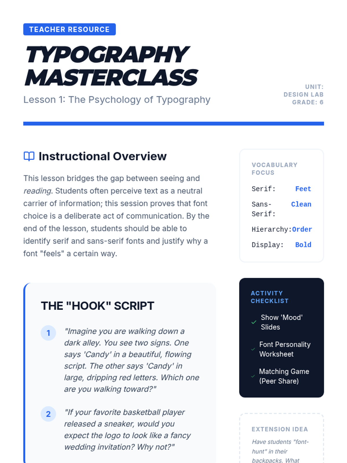A comprehensive introduction to graphic design and typography for 6th grade, focusing on how visual elements communicate mood, hierarchy, and meaning. Students transition from analyzing font psychology to creating their own balanced layouts and logos, culminating in a professional-style client pitch.