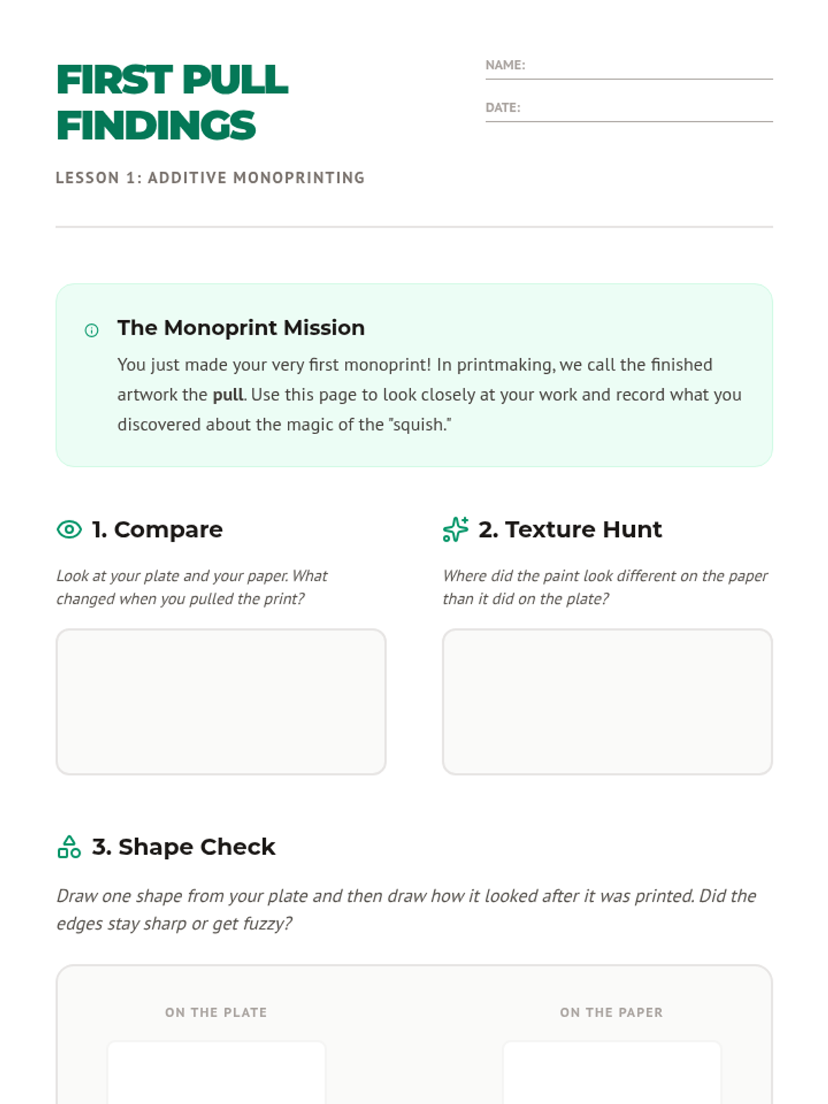 An inquiry-based exploration of monoprinting for 3rd graders, focusing on additive and subtractive methods, texture discovery, and trace techniques using Gelli plates or plexiglass. Students move from experimental mark-making to a final mixed-media collage, learning that every print is a unique 'one-of-a-kind' impression.