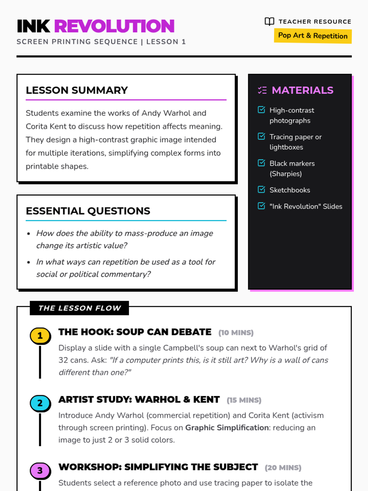 An 8th-grade unit exploring the intersection of Pop Art and screen printing. Students learn technical printmaking skills while investigating the social impact of mass-produced imagery.