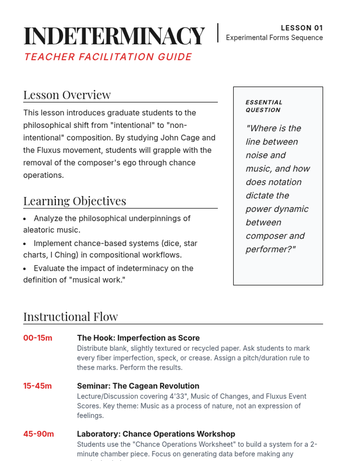 This graduate-level sequence explores the avant-garde frontiers of music composition, focusing on indeterminacy, extended techniques, and graphic notation to redefine the composer-performer relationship.