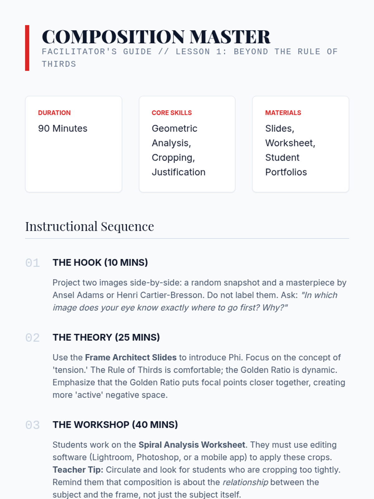 This advanced photography sequence for 12th graders moves beyond basic framing to explore complex compositional structures like the Golden Ratio, negative space, and color psychology. Students learn to use geometry and color to dictate the viewer's psychological experience, ultimately mastering the art of breaking rules intentionally to create visual tension.